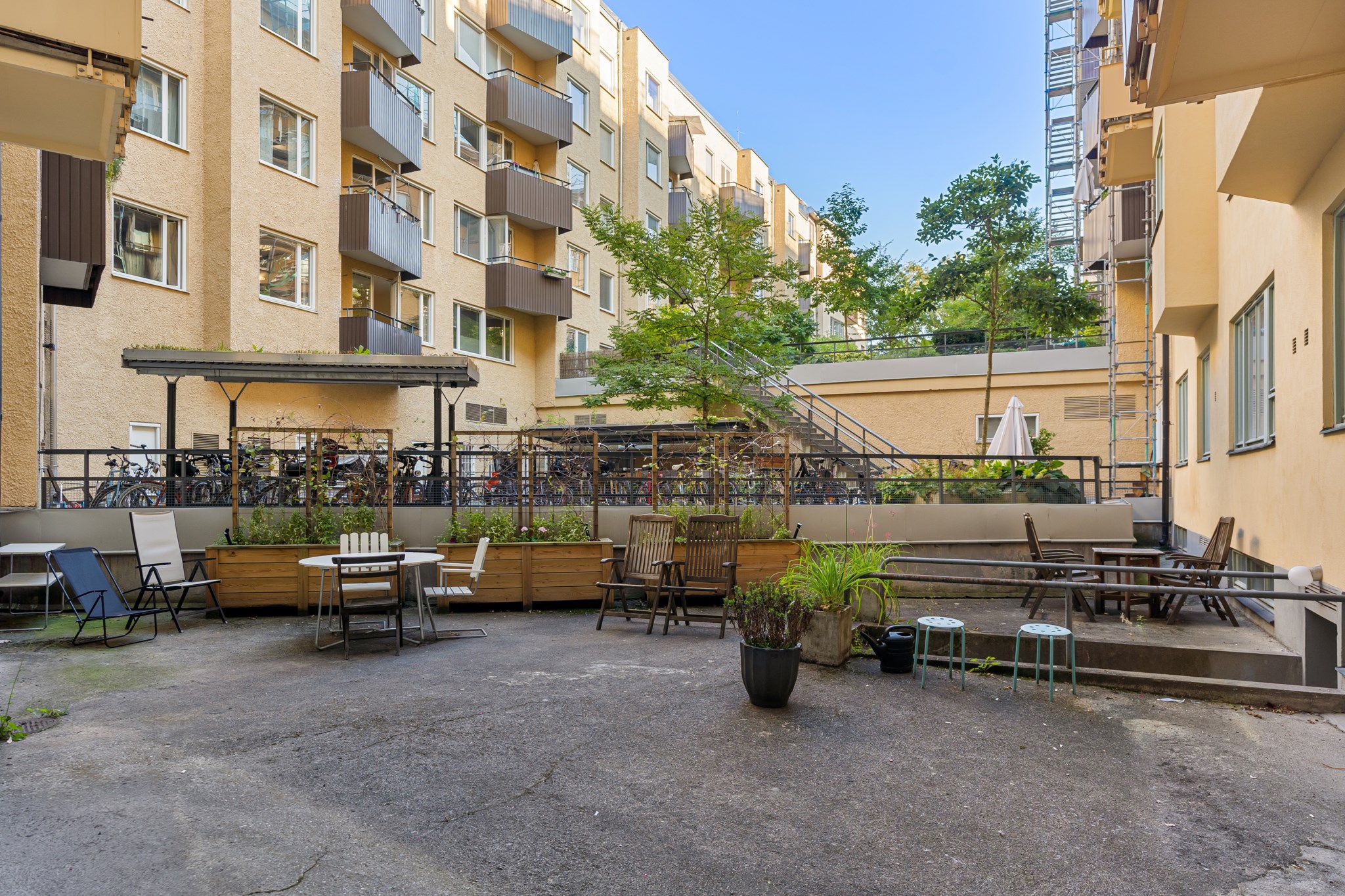 Planer på att renovera föreningens balkonger under 2028/2029.ParkeringFöreningen har två parkeringsplatser som hyrs ut för 1 700 kr/månad.Gemensamma utrymmenInnegård