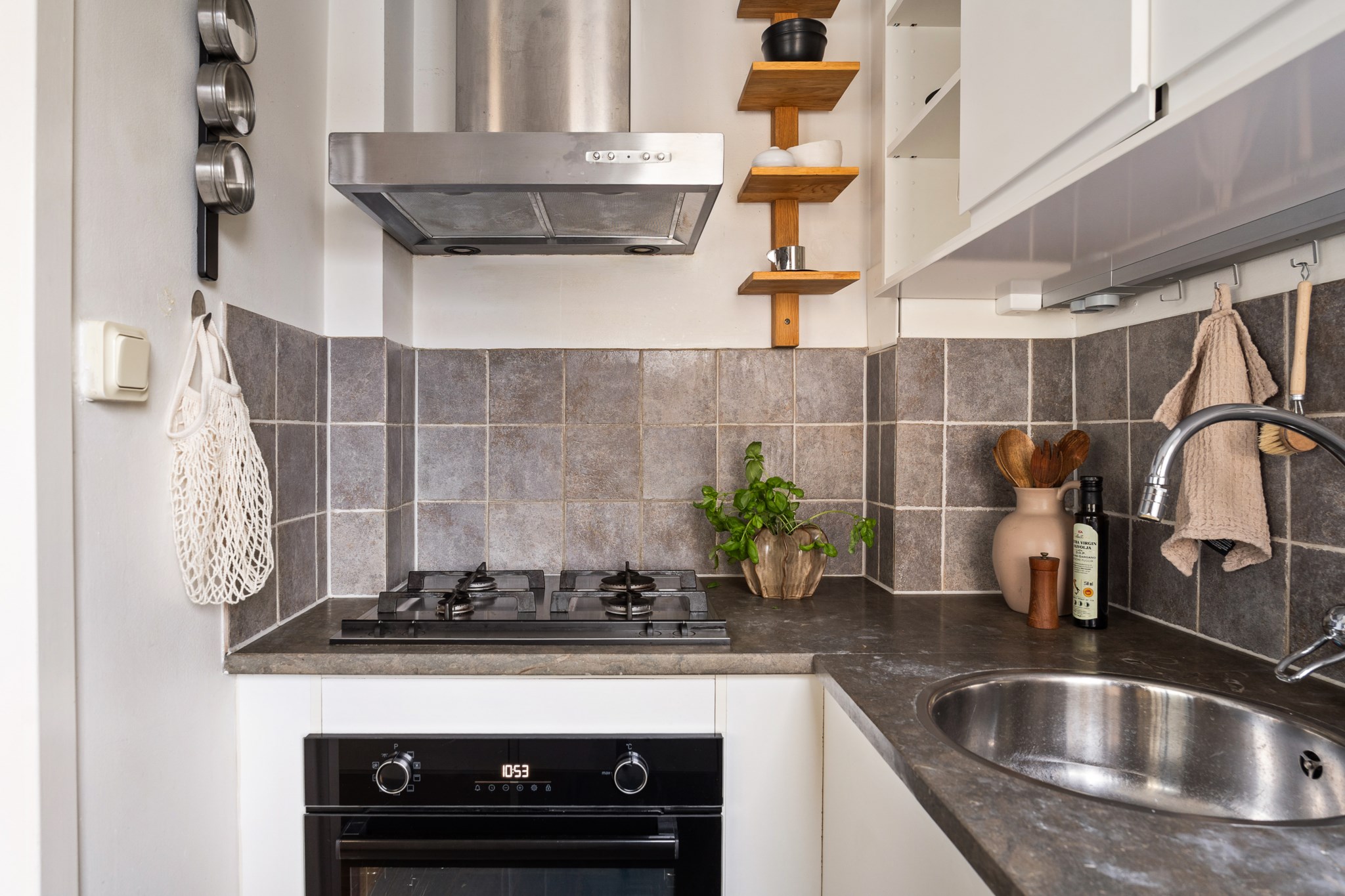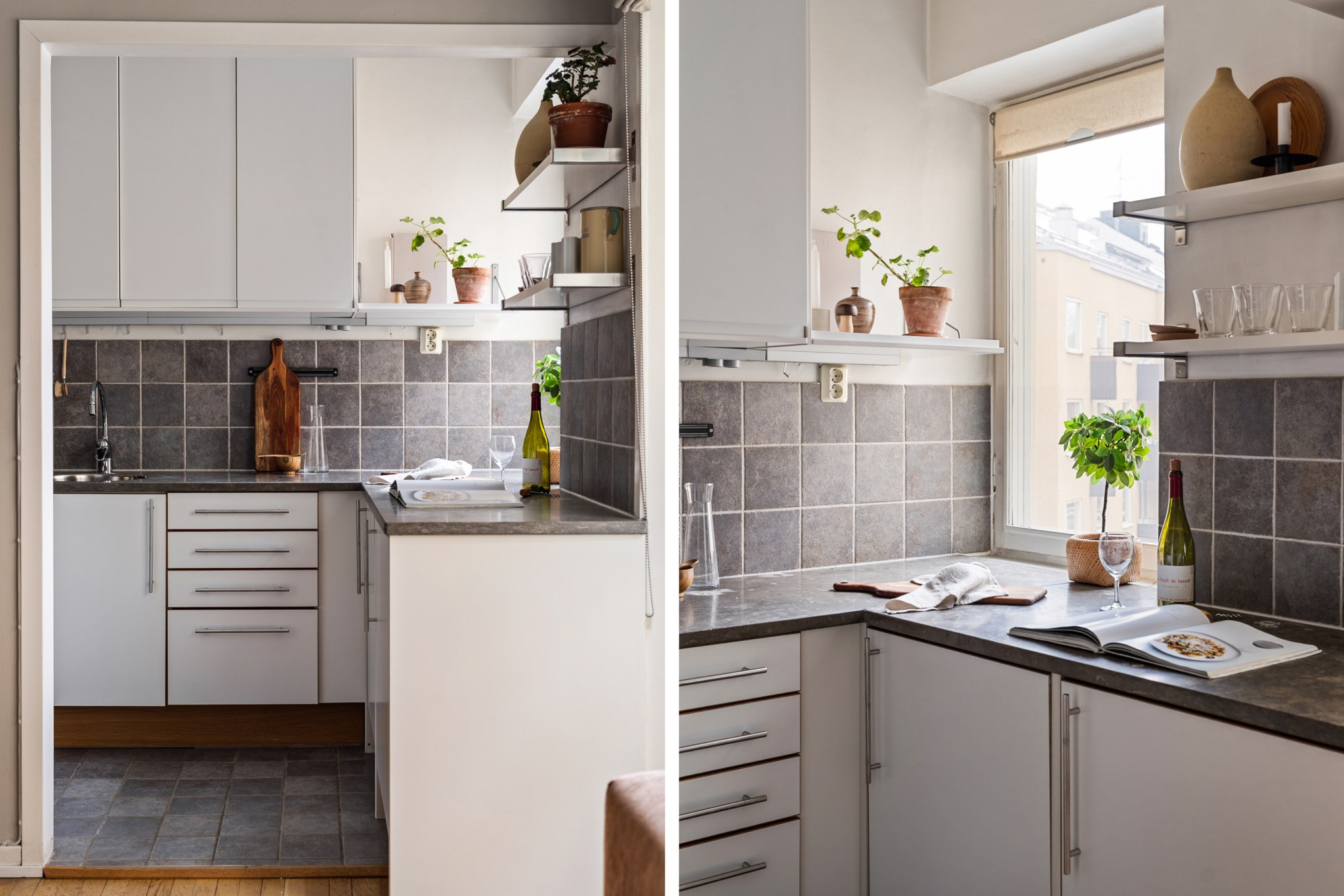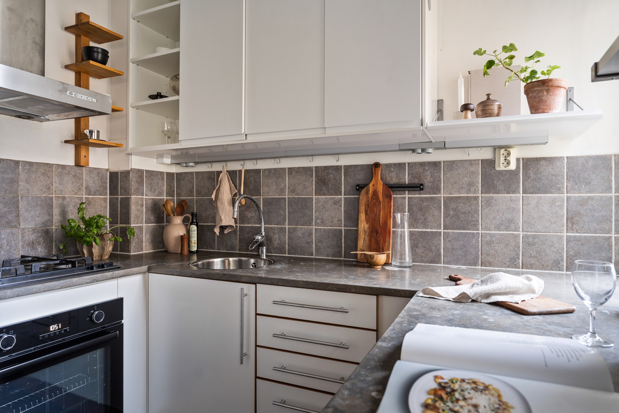 Stilrent och välplanerat kök med vita skåpsluckor, mörk bänkskiva och kakel i grå toner som ger en tidlös känsla. L-formad arbetsyta med god förvaring samt utrustat med spishäll, ugn, fläkt och diskho. Fint ljusinsläpp från fönster och en trivsam, funktionell arbetsmiljö.