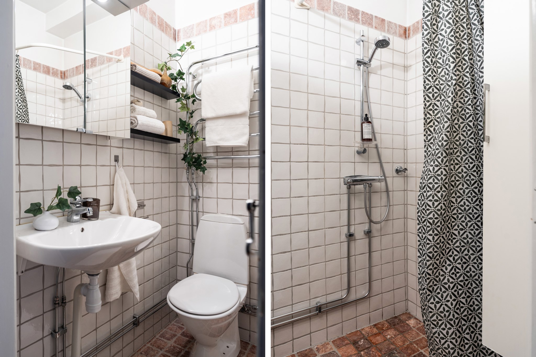 Funktionellt badrum med dusch, wc och handfat. Helkaklade väggar i ljusa toner kombineras med klinkergolv som ger en praktisk och tidlös grund. Utrustat med handdukstork och förvaring via hyllplan – ett välplanerat badrum för en smidig vardag.