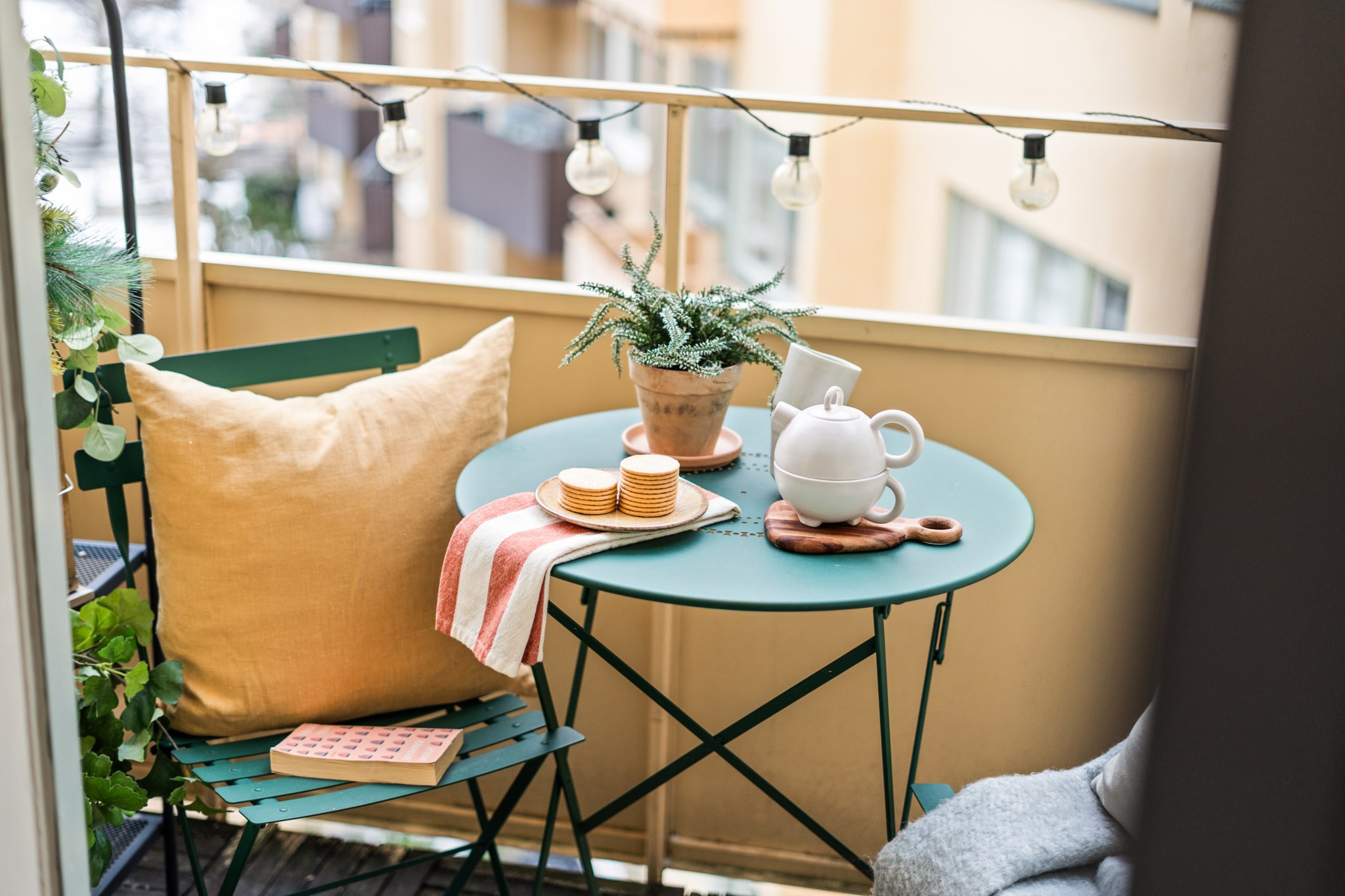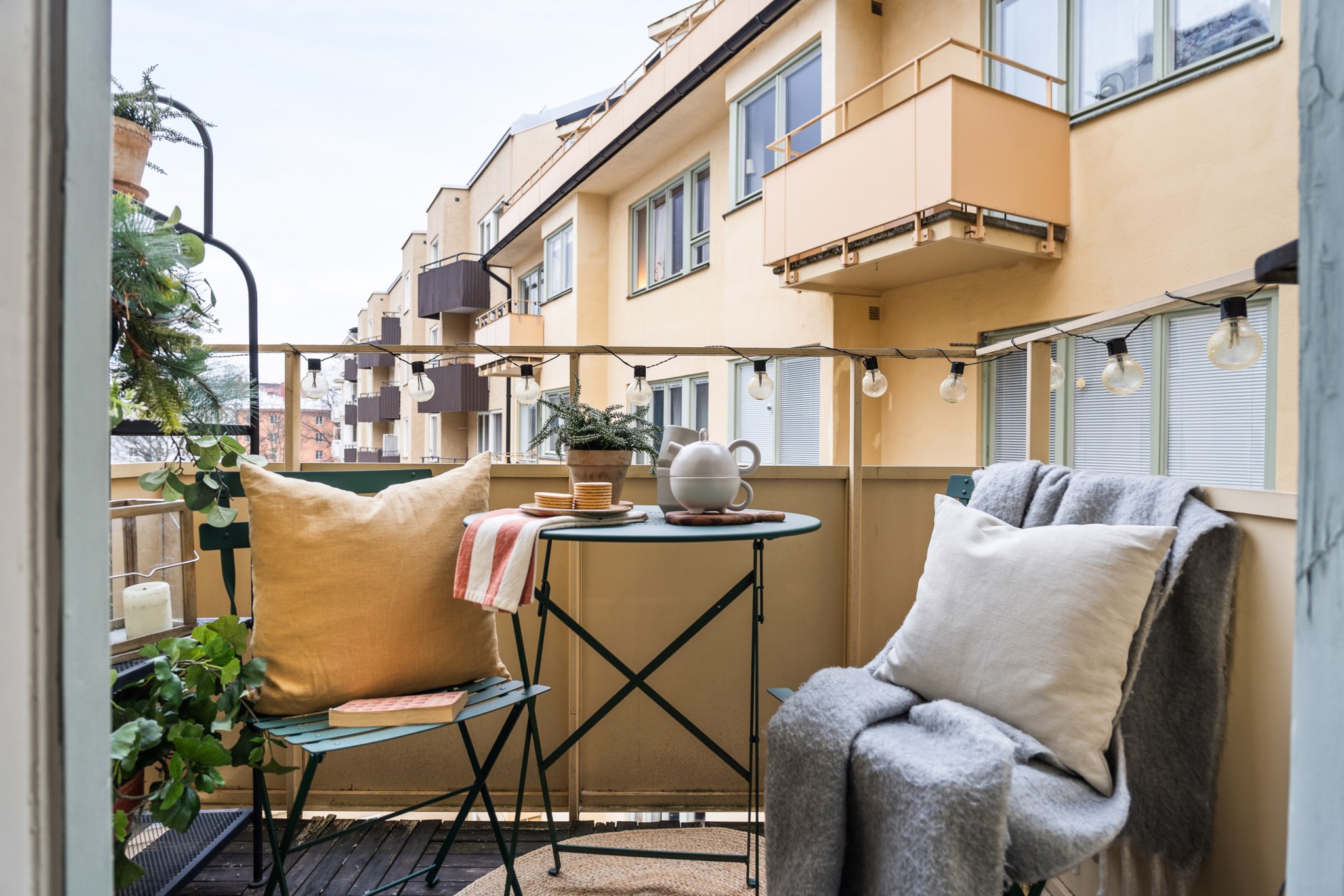 Mysig balkong med plats för sittgrupp och växter. Trevligt läge med utsikt över kvarterets charmiga fasader och park– en perfekt plats för morgonkaffet eller en stund i solen.