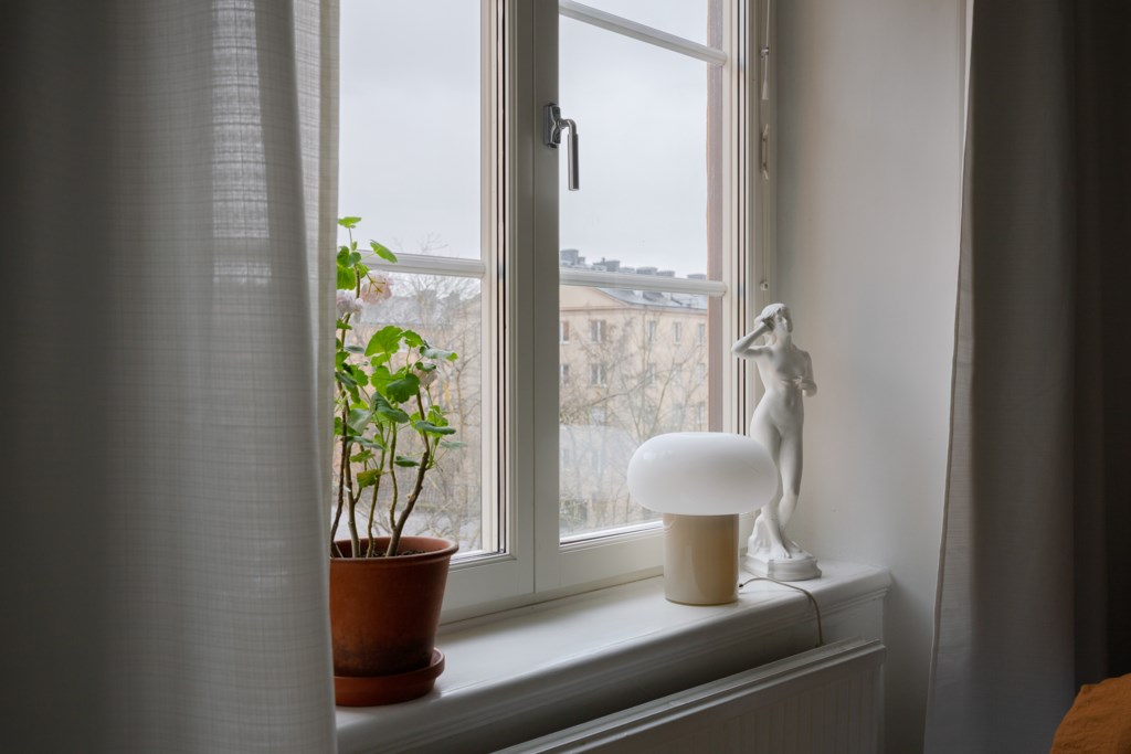 Master bedroom i anslutning till vardagsrummet med stort fönster ut mot Assessorsgatan. Här finns plats för en dubbelsäng, sängbord och en garderobslösning.