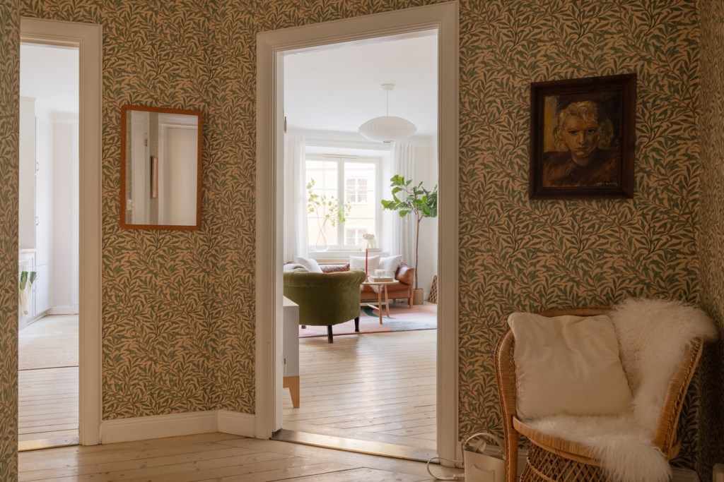Genom entrédörren kliver vi in i denna vackra bostad. I hallen finns gott om ytor för avhängning av kläder, väskor och skor. I anslutning till hallen finns en klädkammare. Något som genomsyrar hela lägenheten är genomgående vackra trägolv och tidstypiska detaljer.
