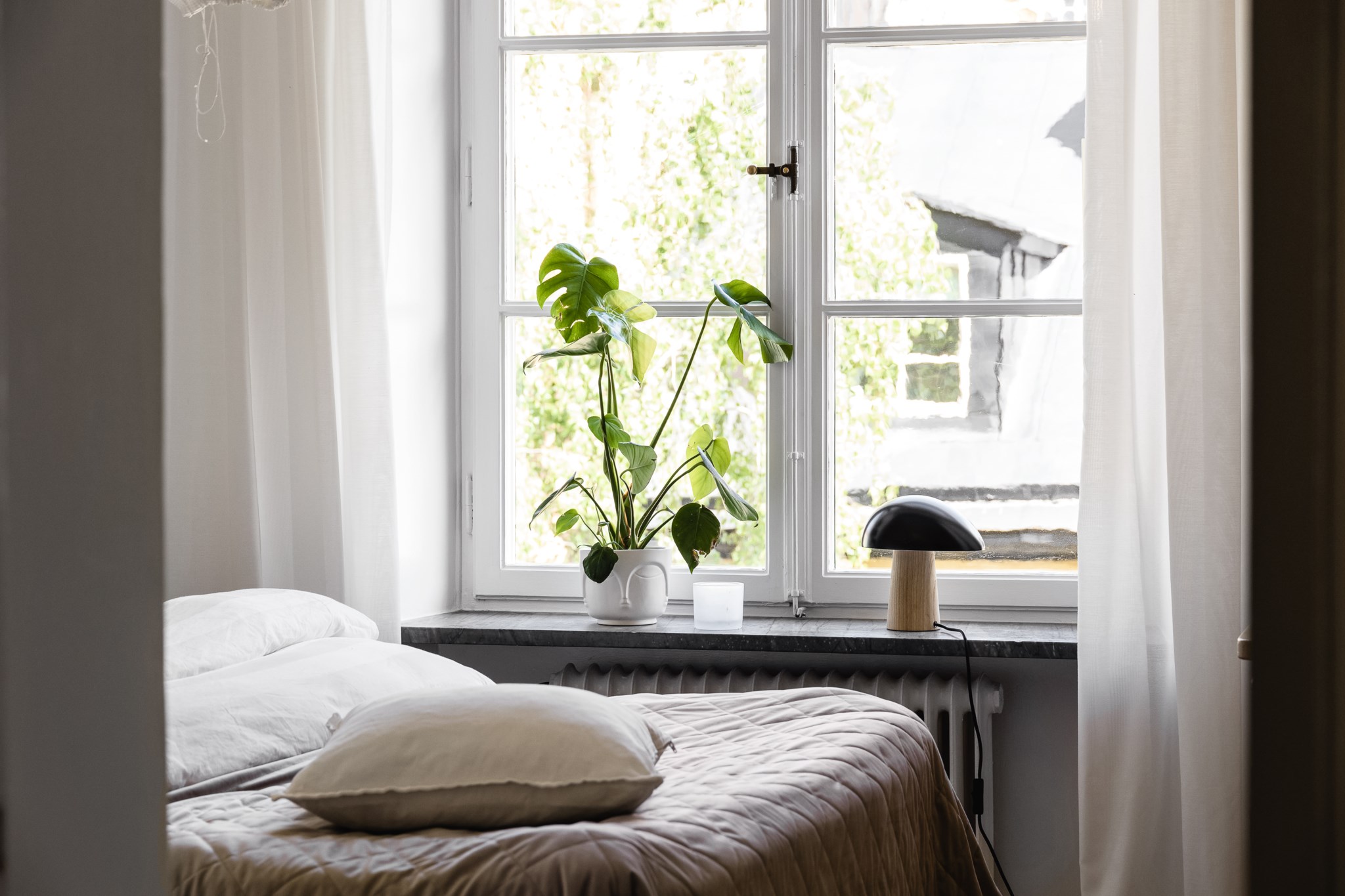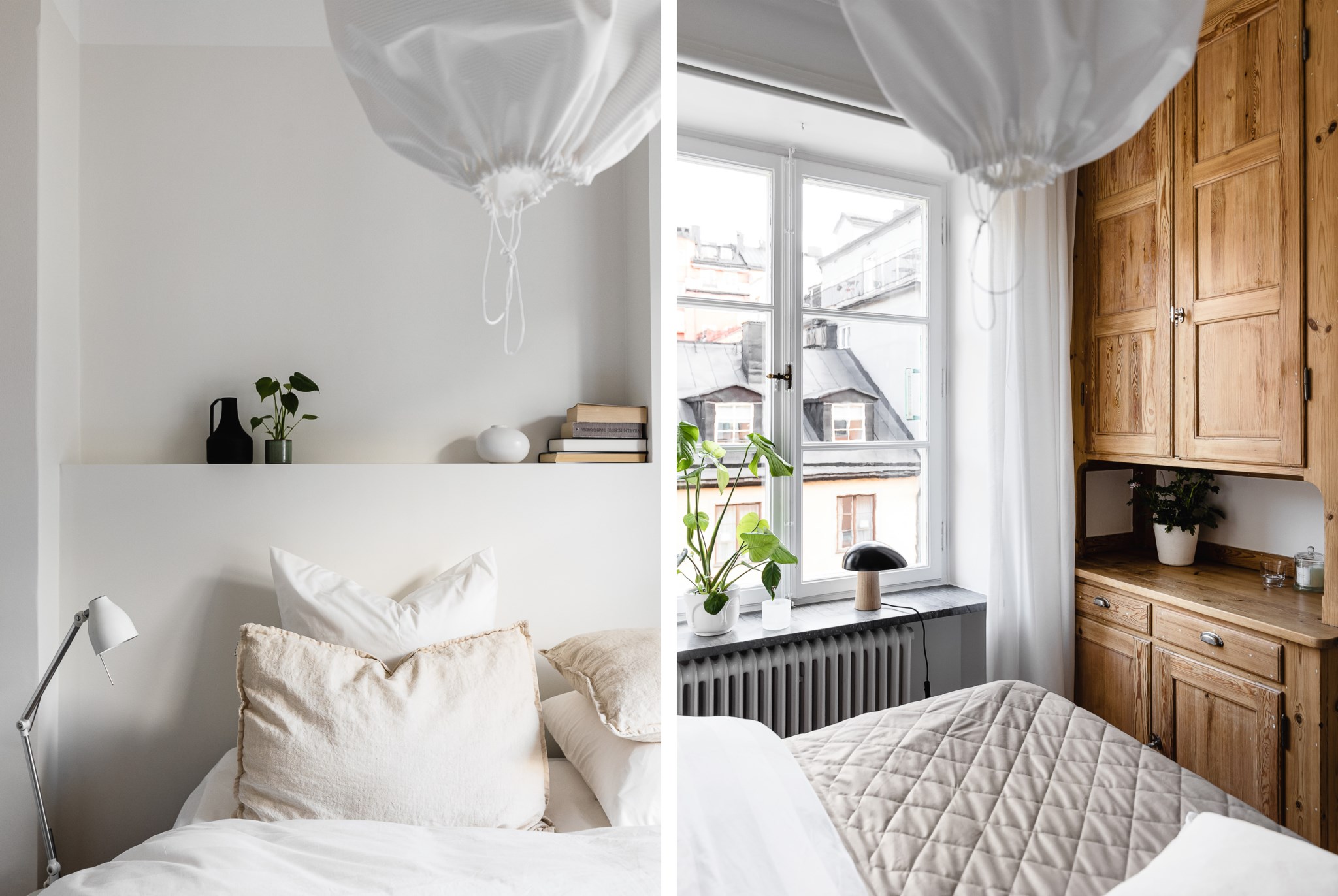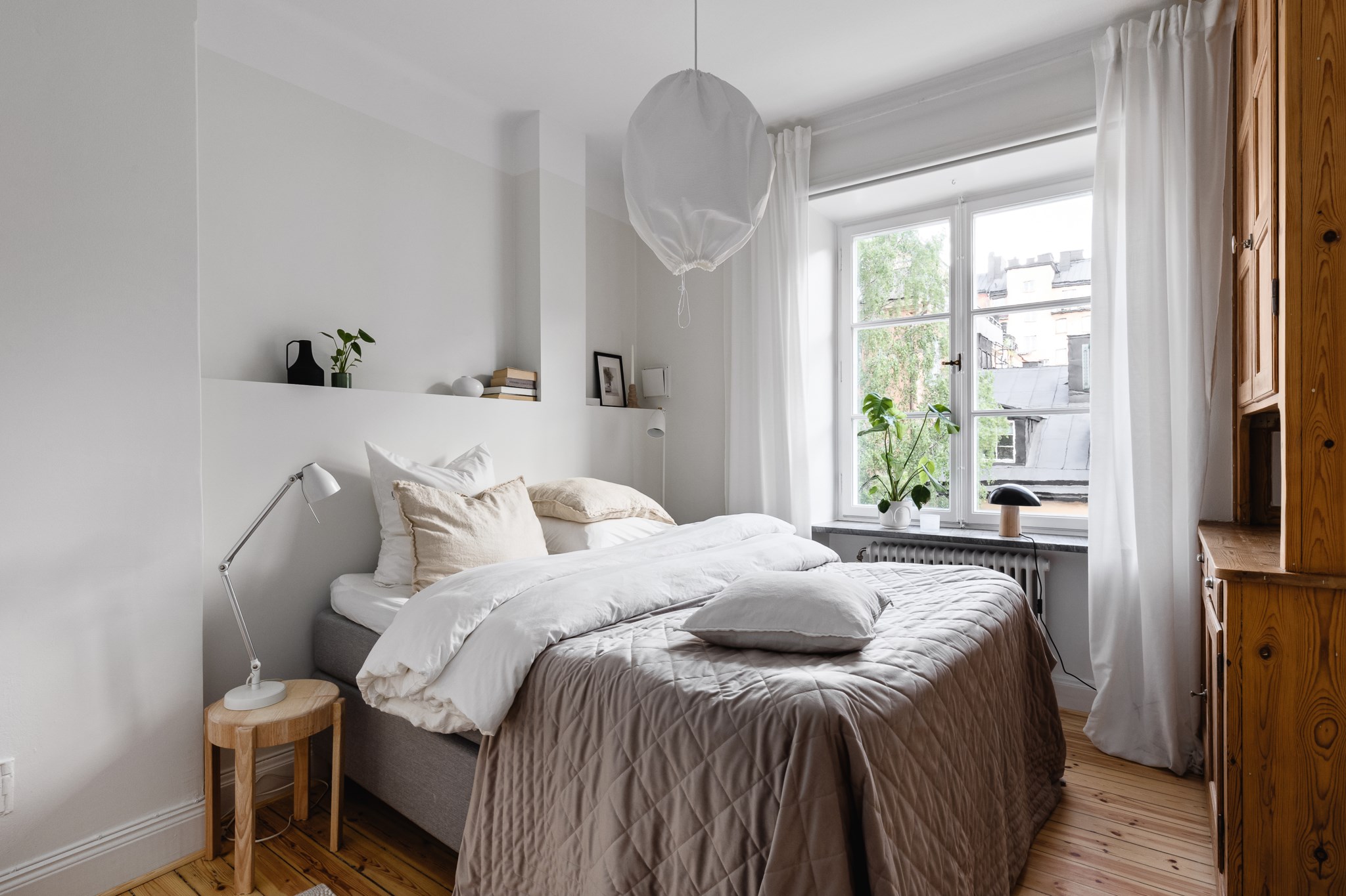 Trivsamt sovrum med ljust golv och ljusa väggar, plats för dubbelsäng och sängbord. Rummet har ett inbyggt serveringsskåp.