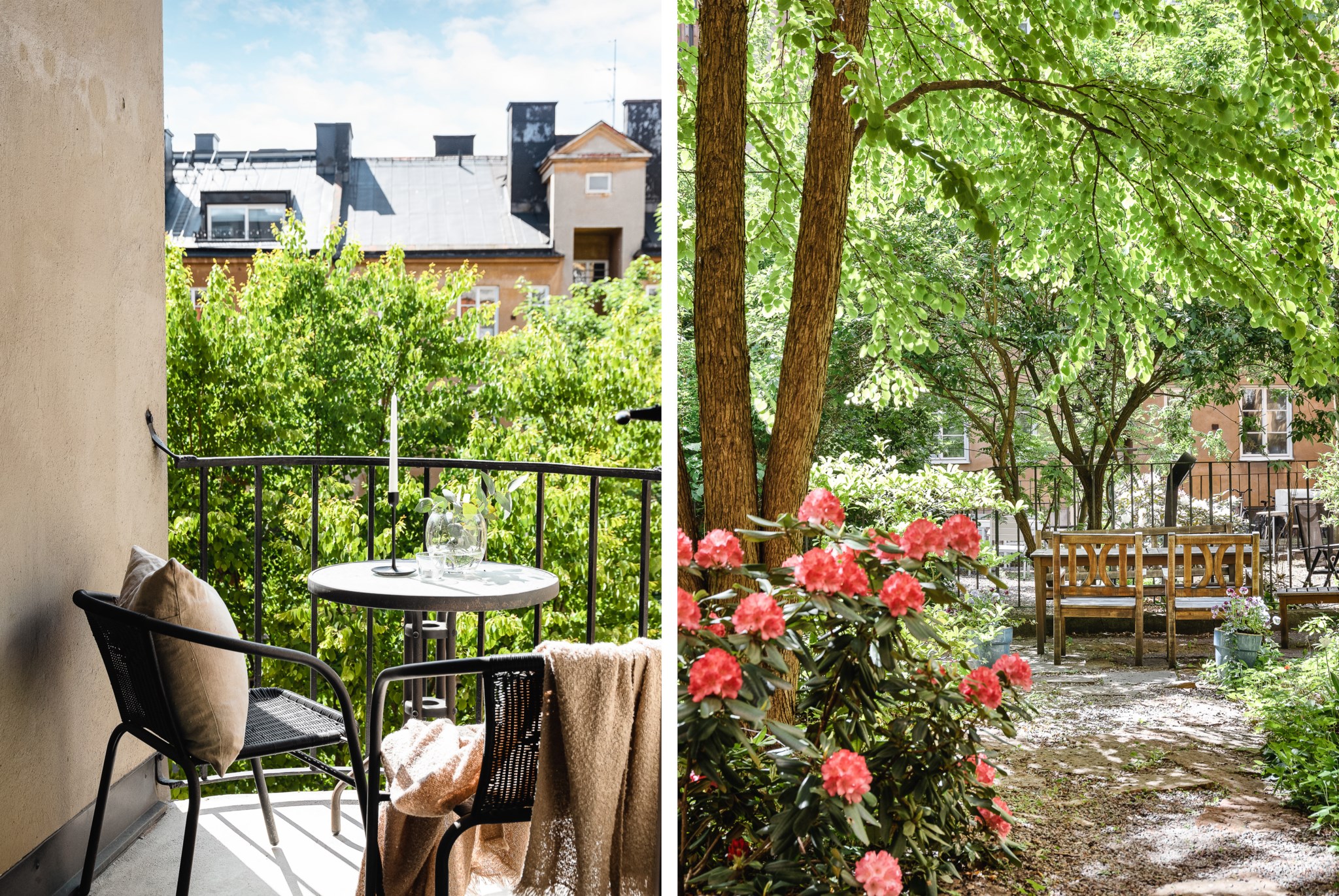 Balkong med plats för bord och stolar och härlig utsikt mot lummig grönska.