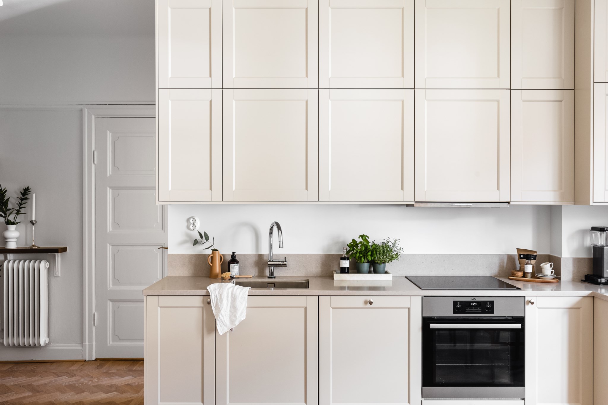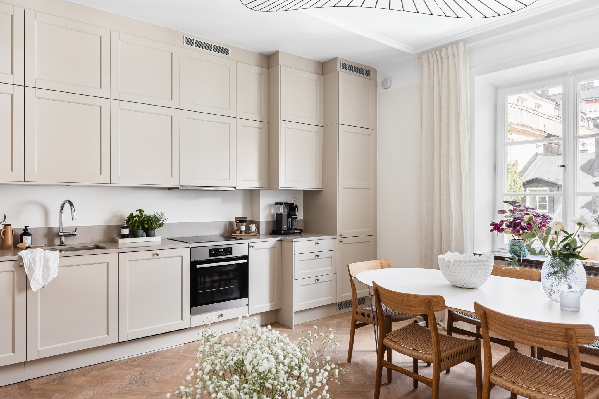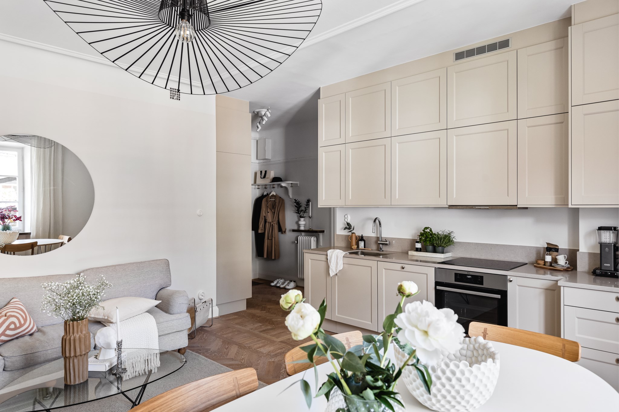 Välplanerat kök i öppen planlösning mot vardagsrum med ljust golv och ljusa väggar samt beiga fronter på över- och underskåp. Köket är utrustat med ugn, spis, kyl, frys och diskmaskin.
