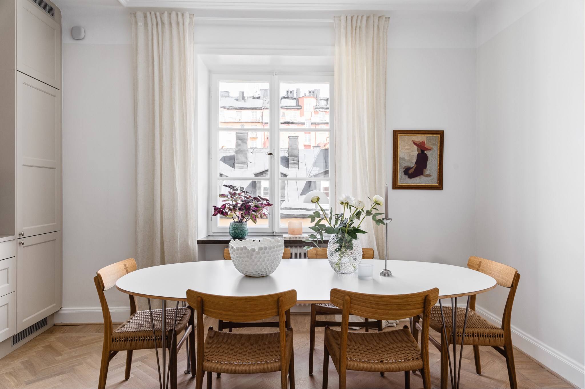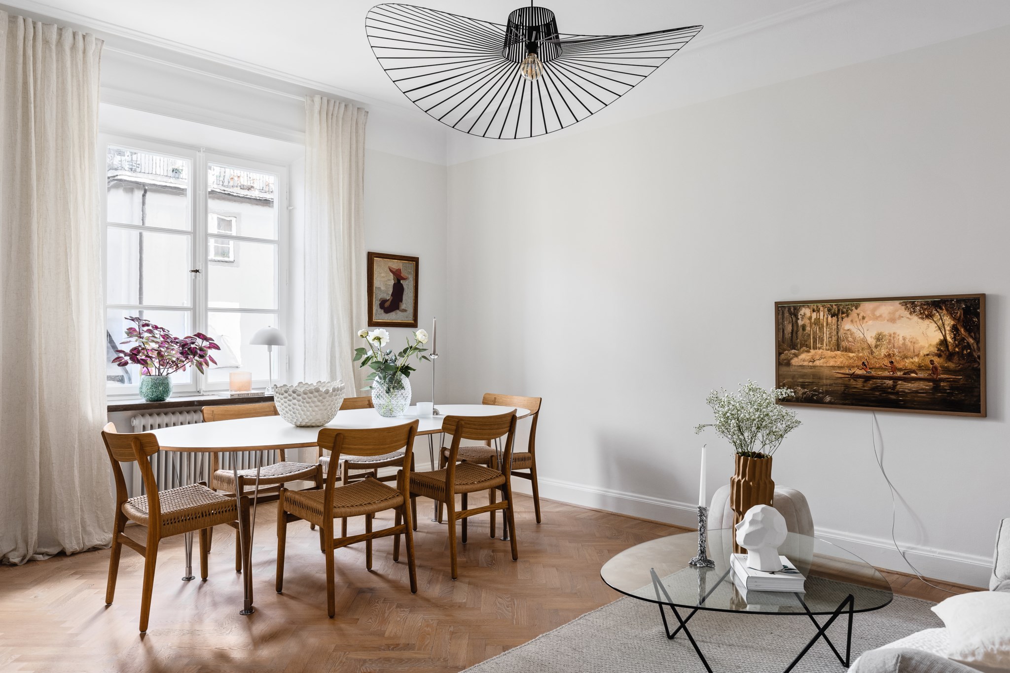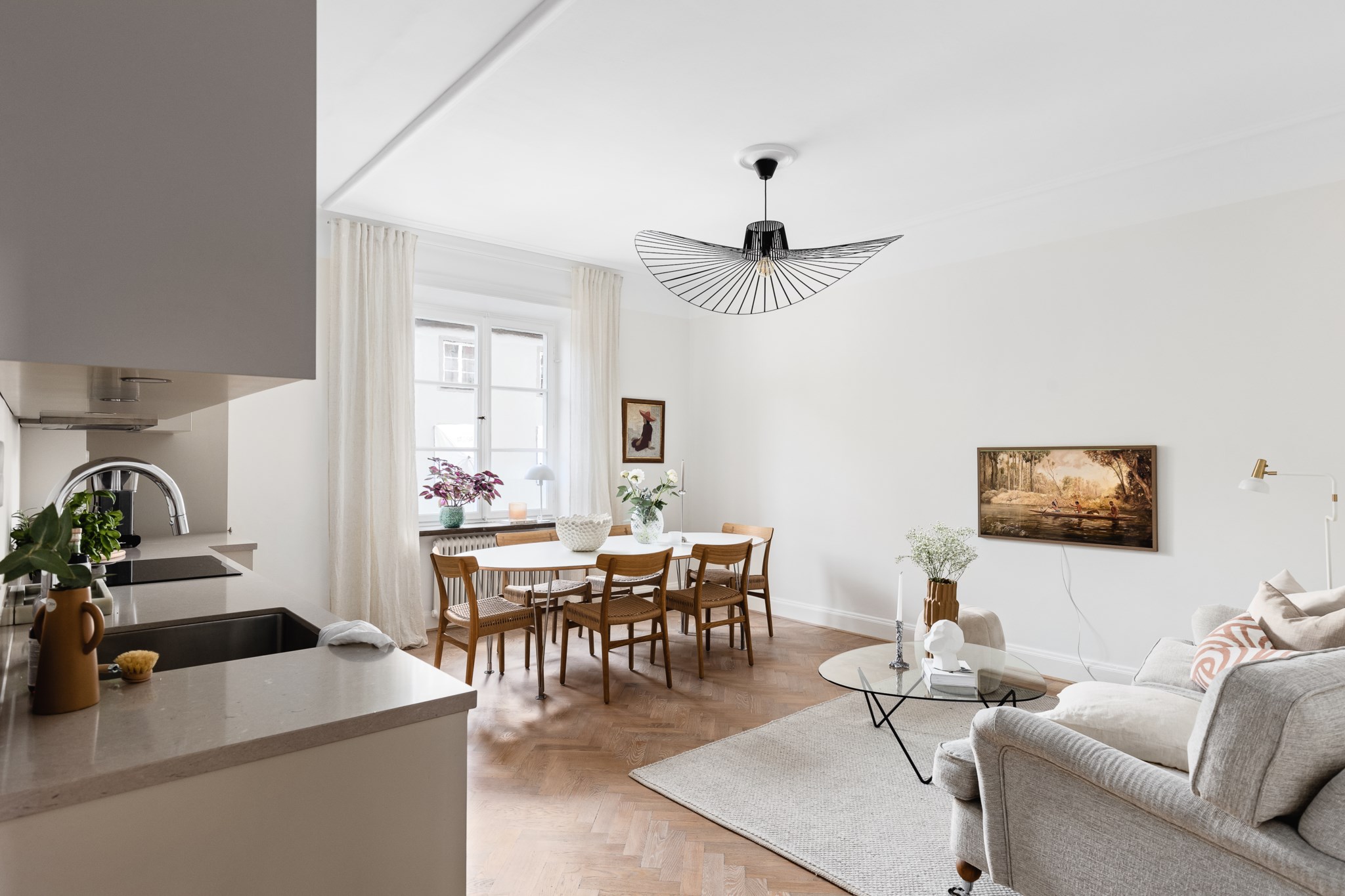 Socialt vardagsrum i anslutning till kök med ljust golv och ljusa väggar med plats för både soffgrupp och matplats. Härligt ljusinsläpp från rummet stora fönster.