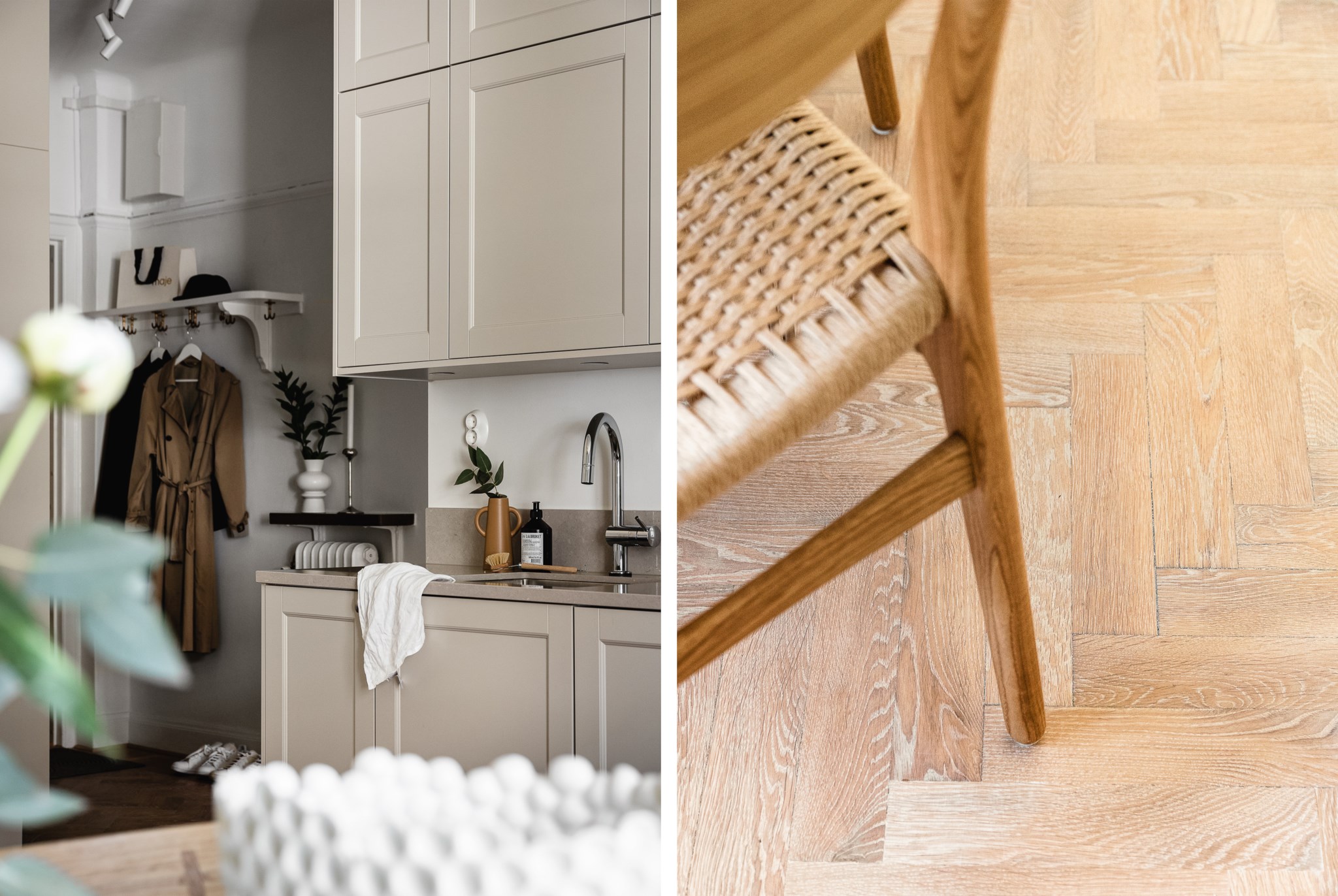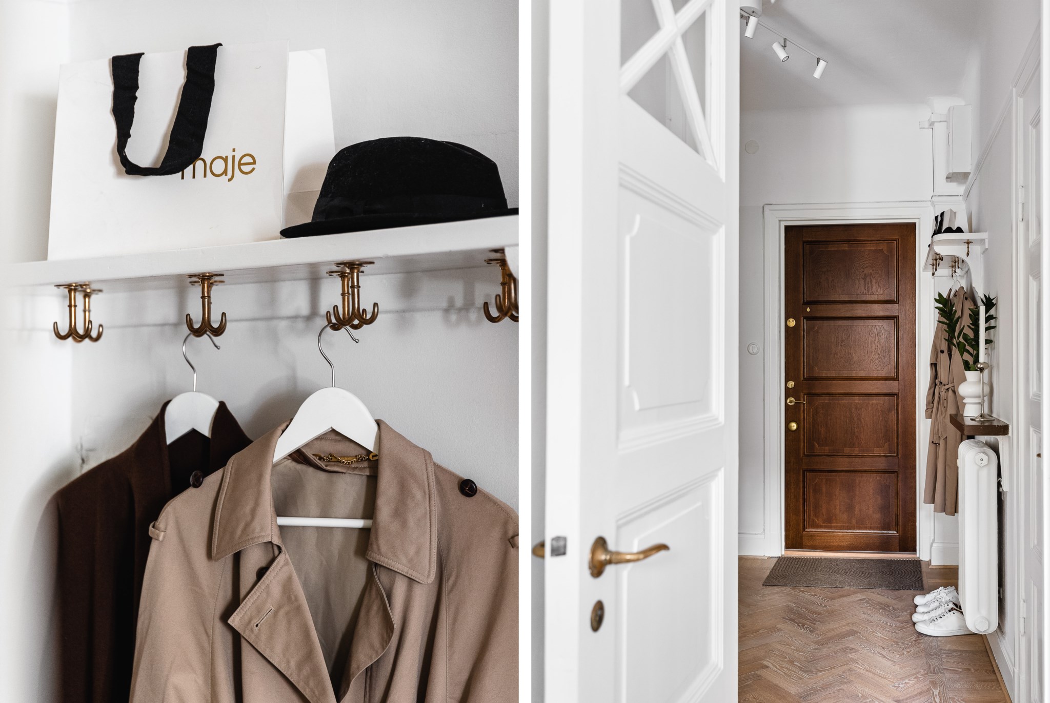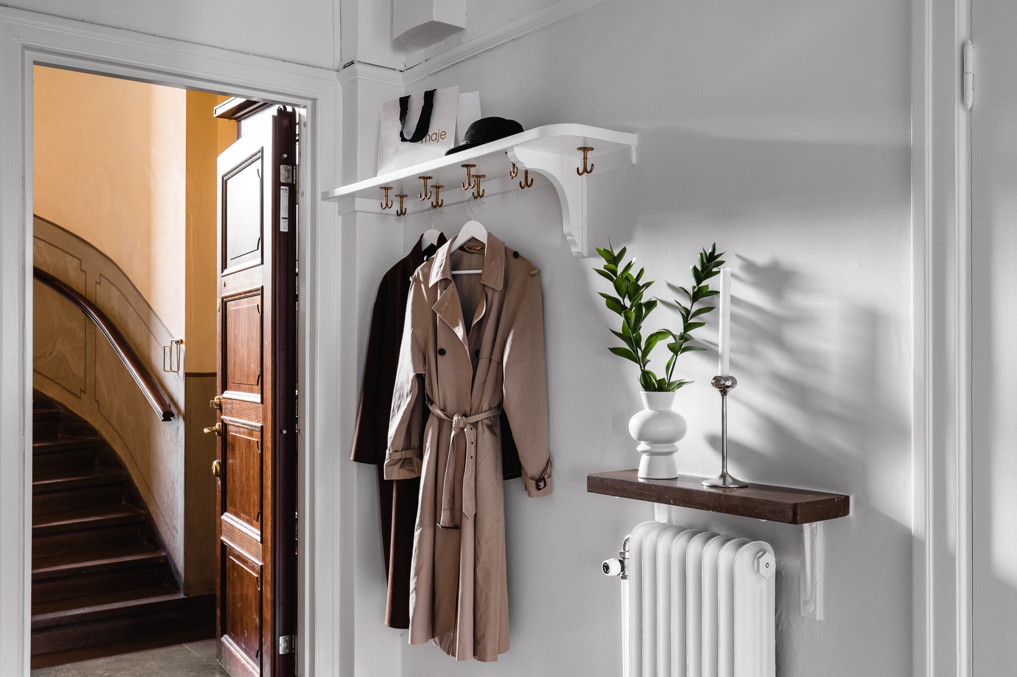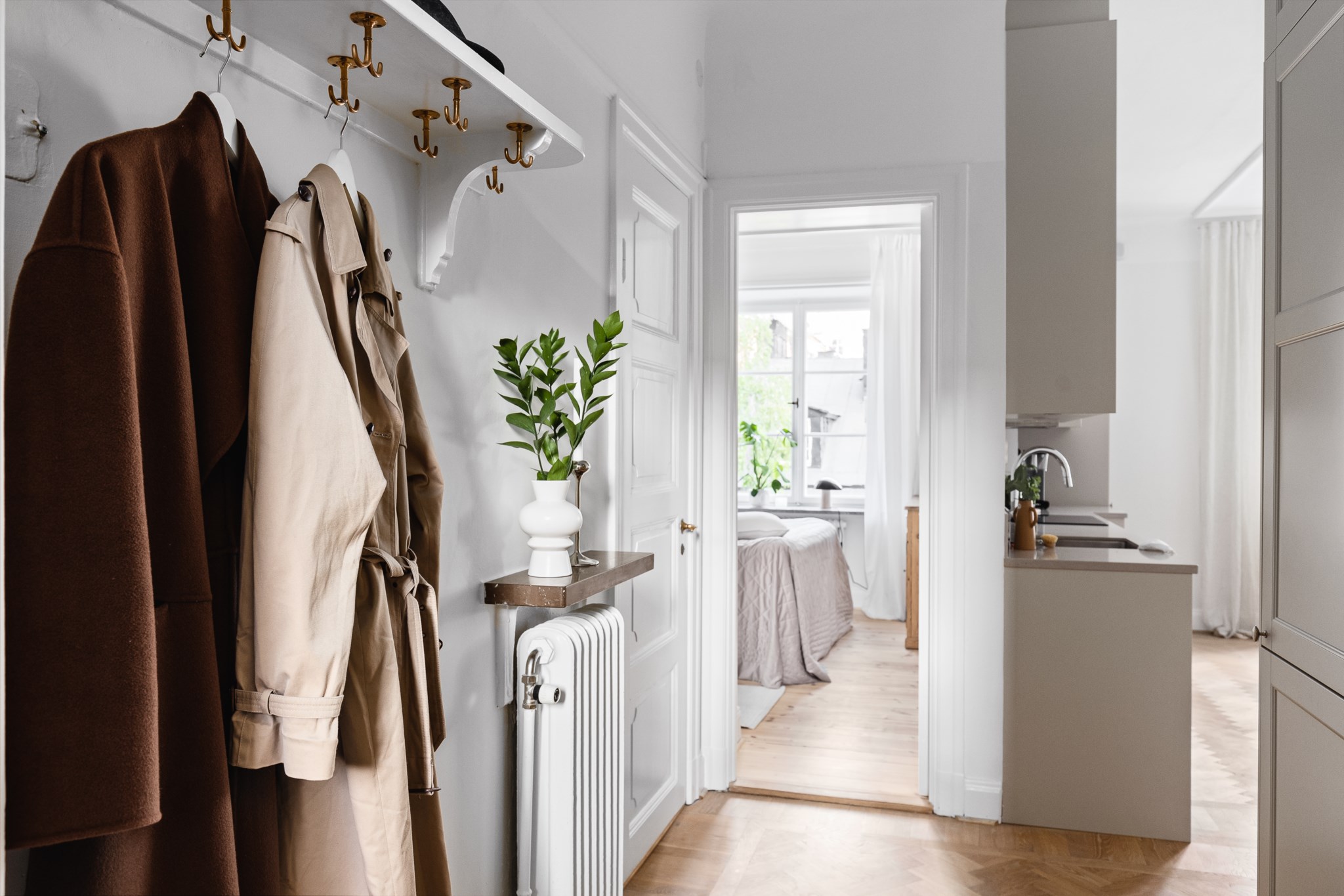 Välkomnade hall med ljust golv och ljusa väggar samt gott om plats för förvaring i garderober, även avhängningsmöjlighet invid entré.