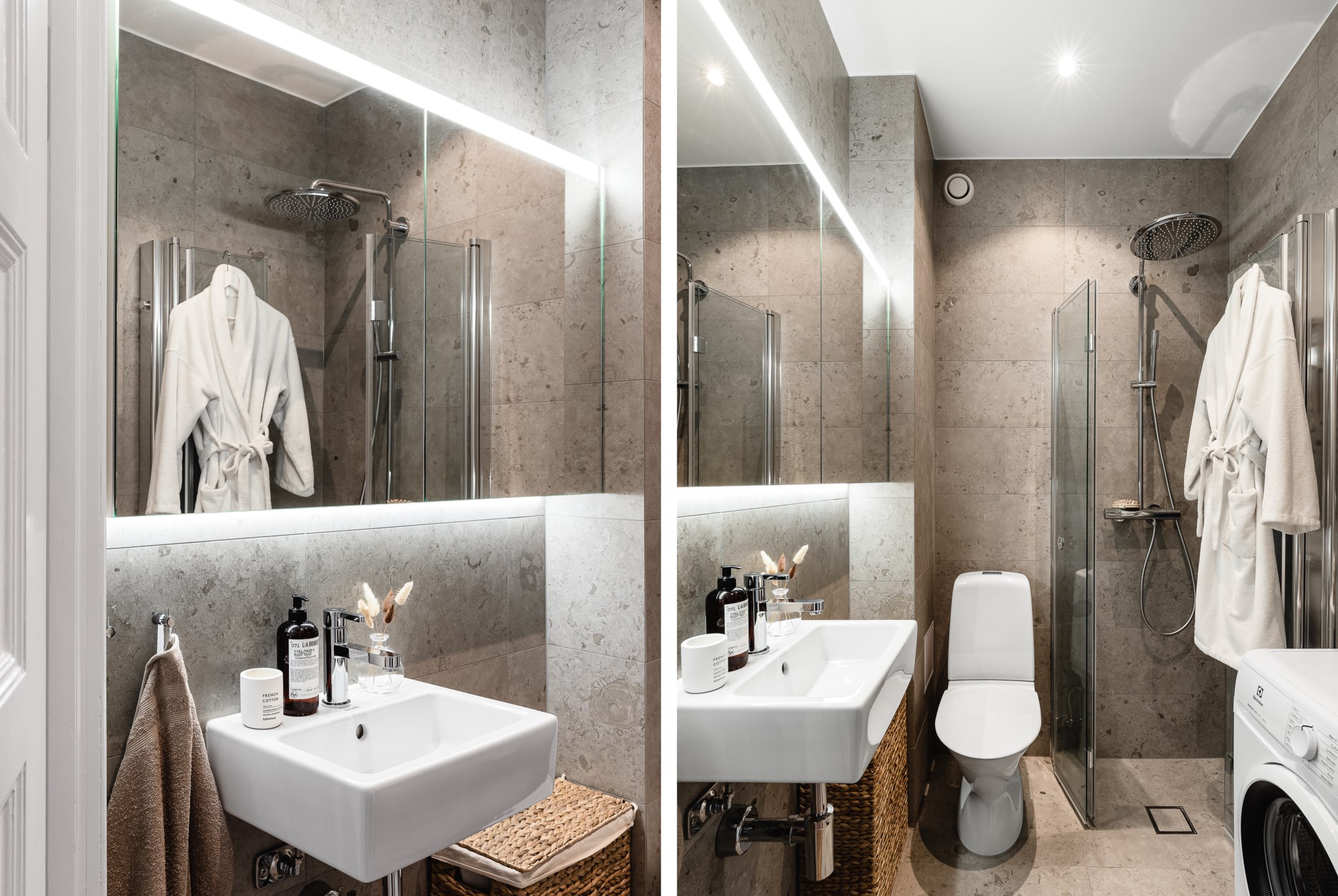 Helkaklat badrum utrustat med WC, handfat, dusch och tvättmaskin. Stor spegel med belysning ovan handfat.