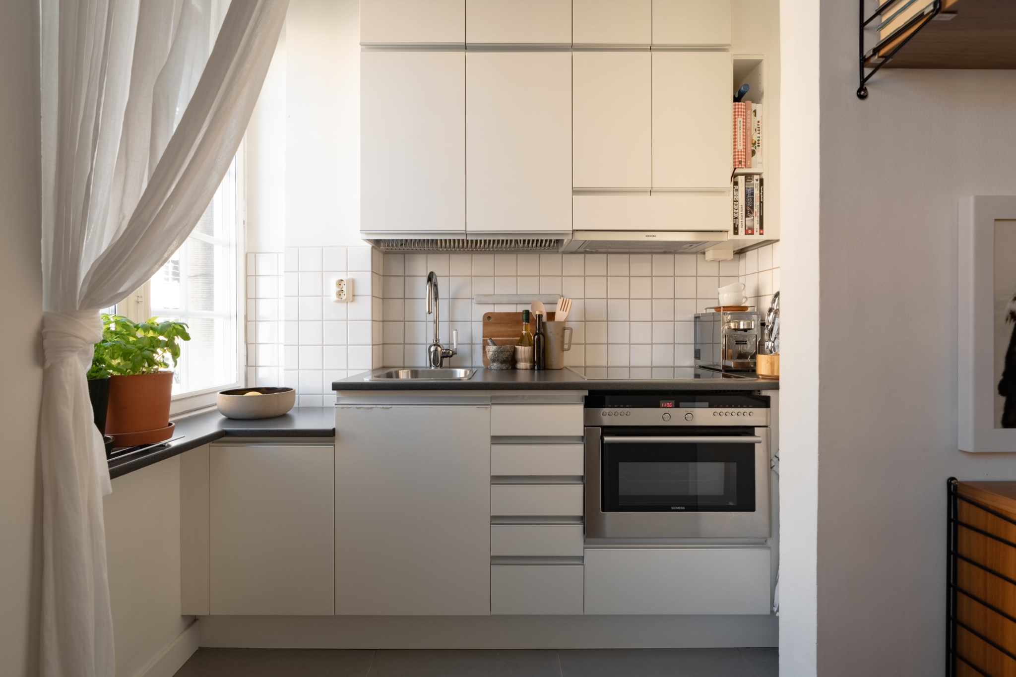 Rymligt kök med tidlösa materialval bestående av ljusa köksluckor och mörk bänkskiva. Köket är utrustat med diskho, spis, fläkt, kombinerad ugn/micro samt kyl och frys. Ytskikten består av ljusa väggar och grått stengolv. Ett härligt ljusinsläpp tar sig in via stort fönster med spröjs.