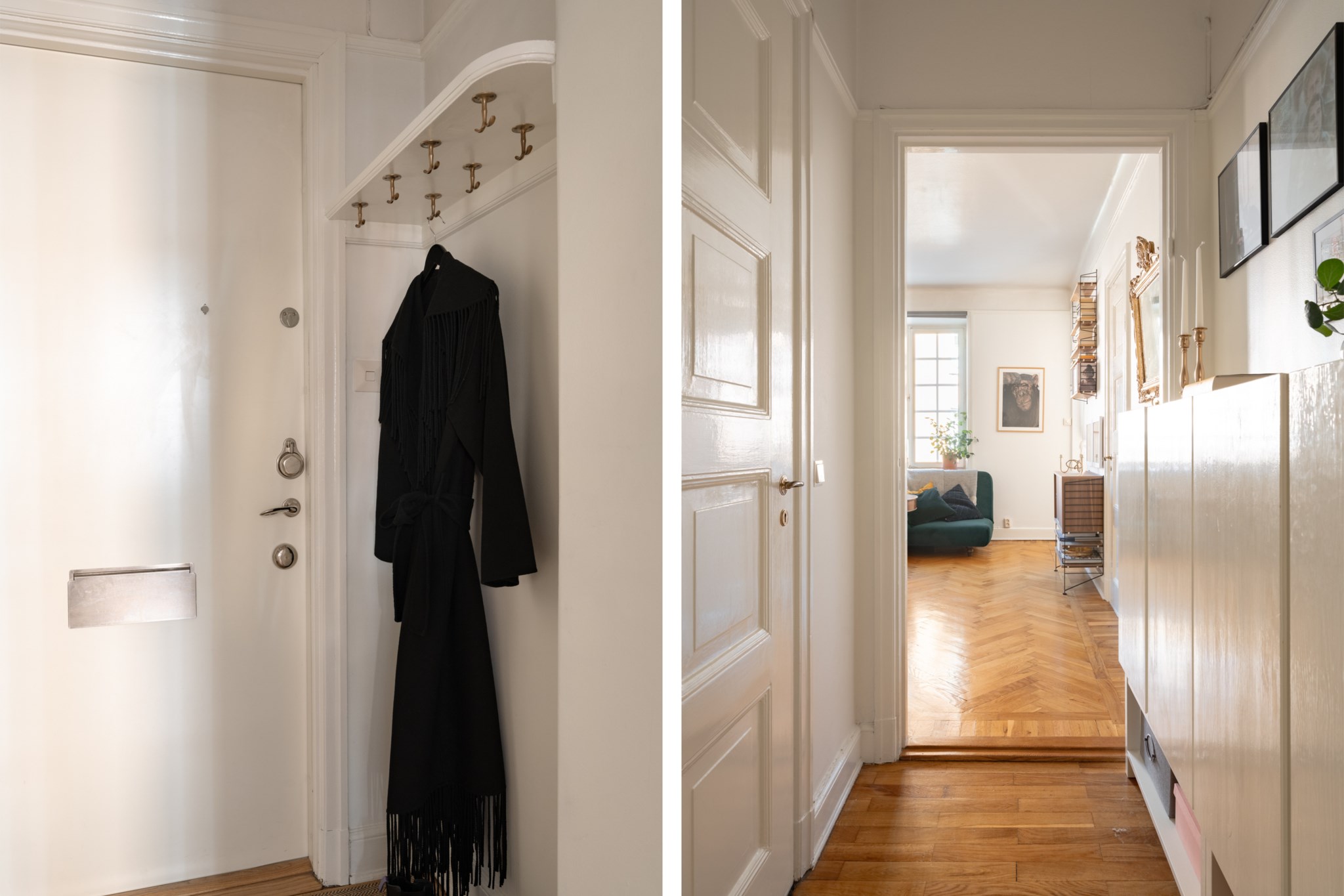 Välkomnande hall med gott om plats för avhängning, skoställ och mindre möblemang efter smak och behov. Ytskikten består av ljusa väggar och parkettgolv.