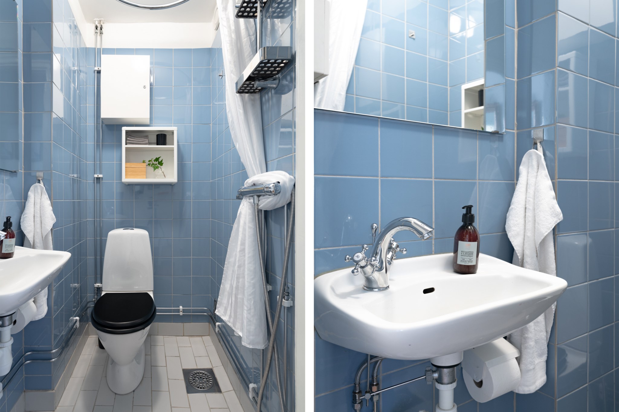 Rymligt badrum med blått kakel och ljust klinker. Badrummet är utrustat med WC, handfat och dusch. Förvaring finns via väggskåp.