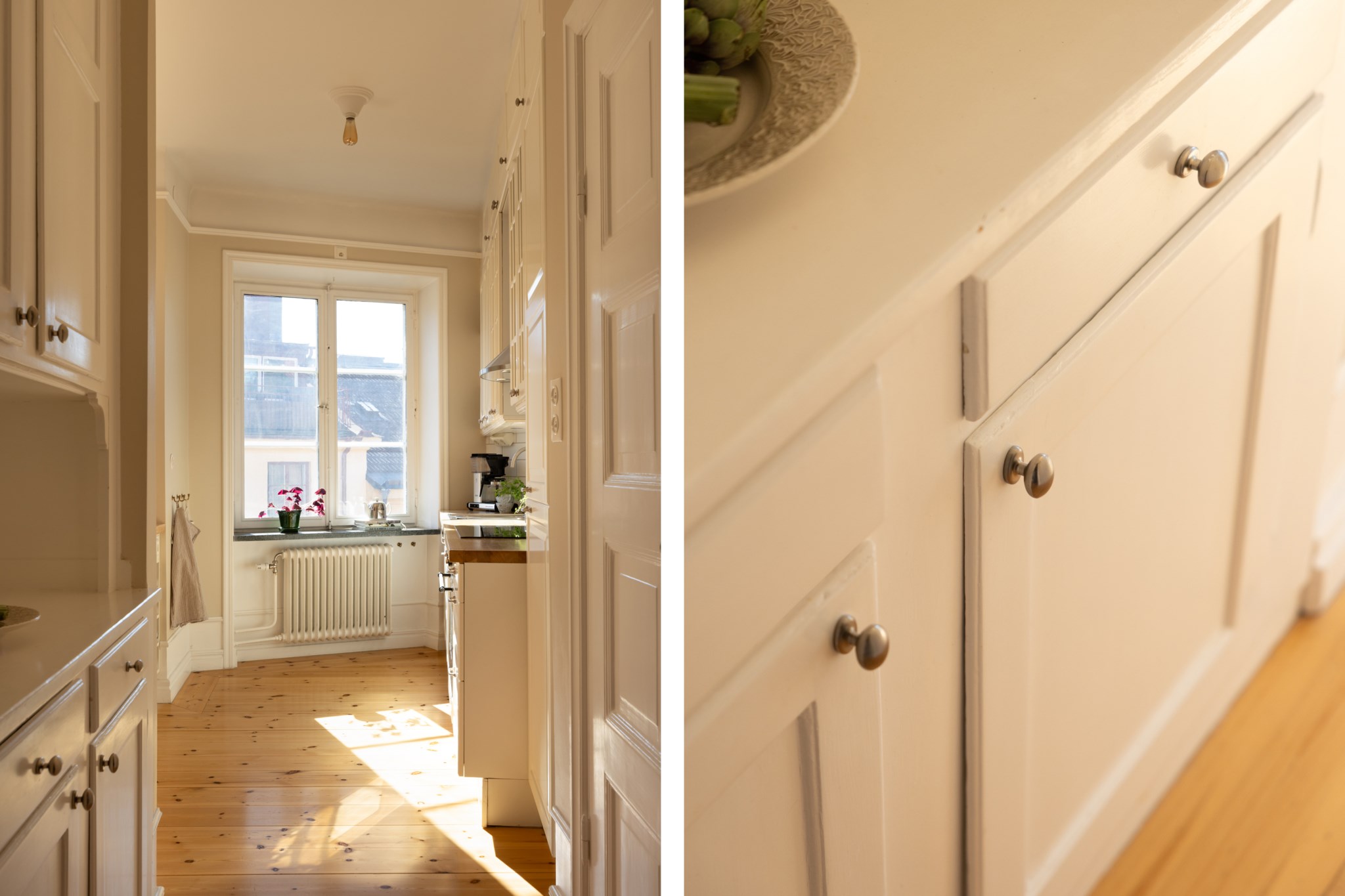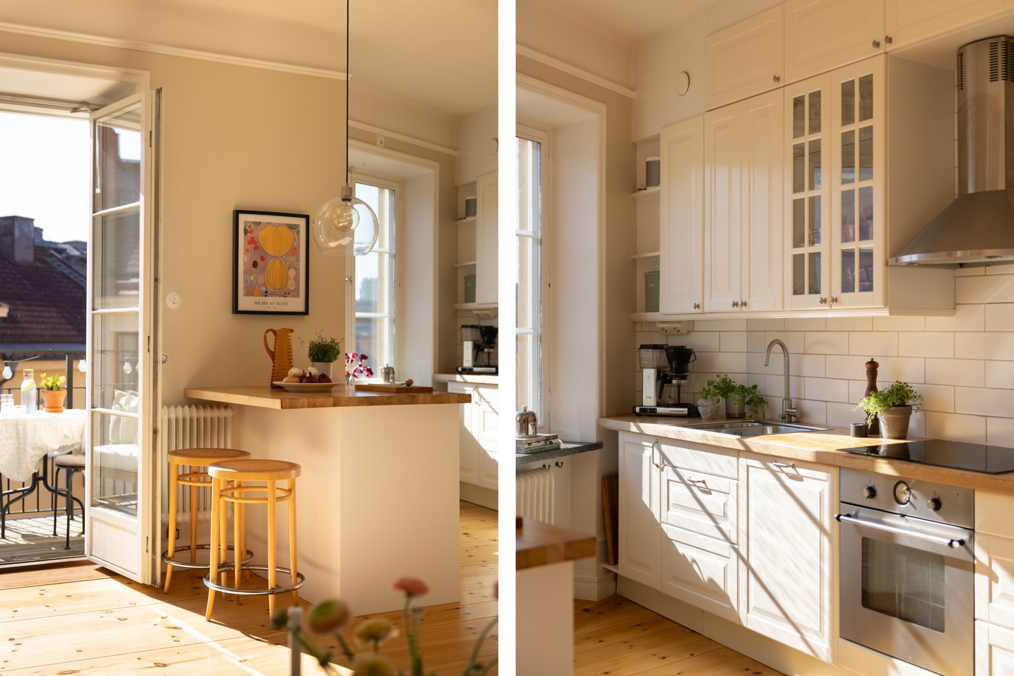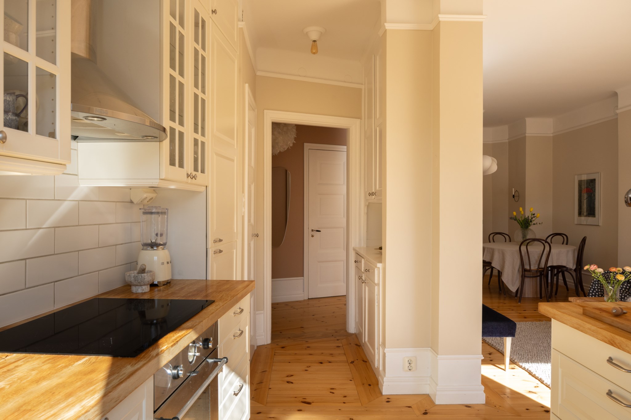 Modernt kök med smakfulla materialval bestående av ljusa köksluckor och bänkskiva i trä med stänkskydd ovan i vitt. Den maskinella utrustningen består av diskho, spis, ugn, köksfläkt, diskmaskin samt kyl och frys. Tidlösa ytskikt bestående av ljusa väggar i en beige nyans och ljust trägolv.