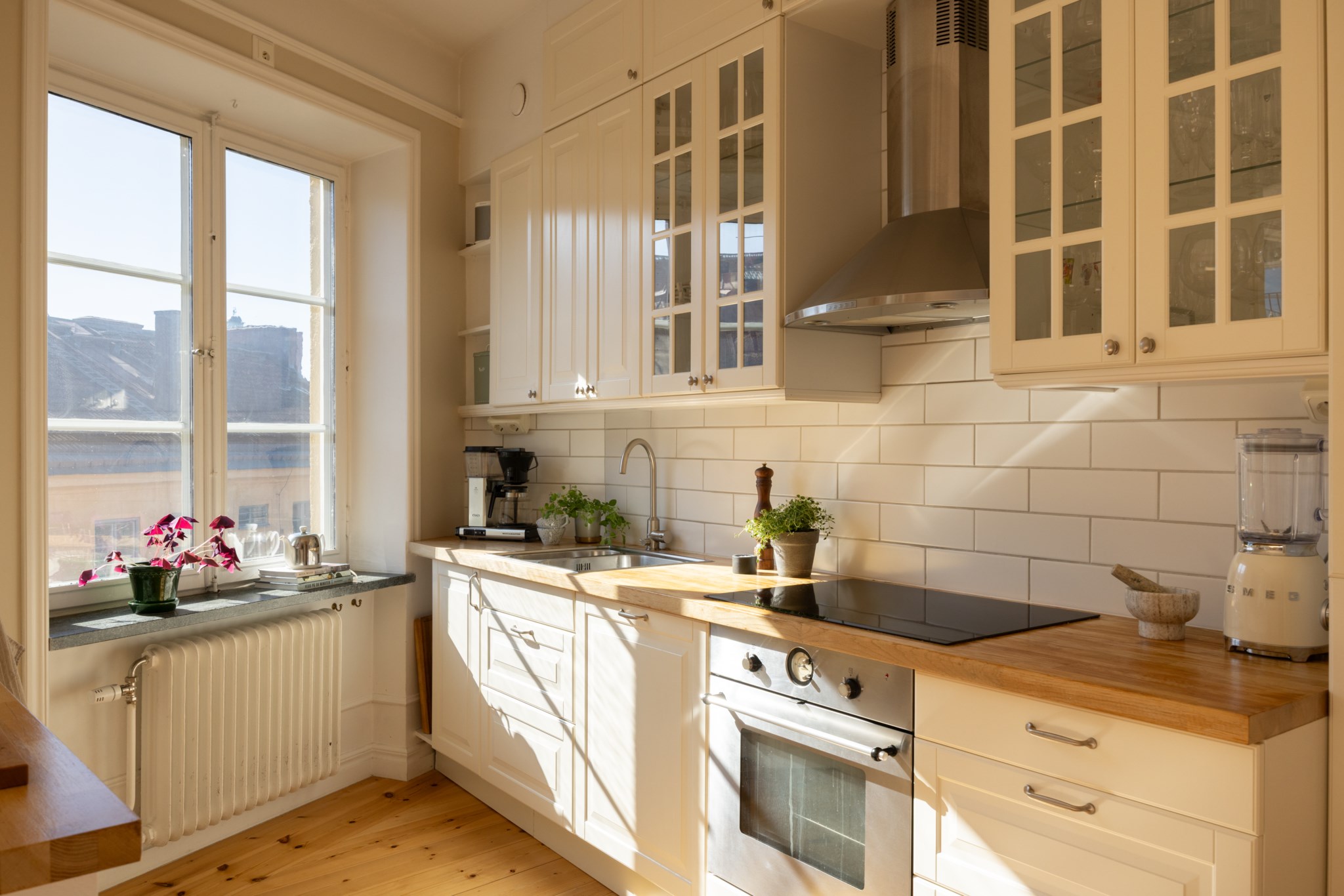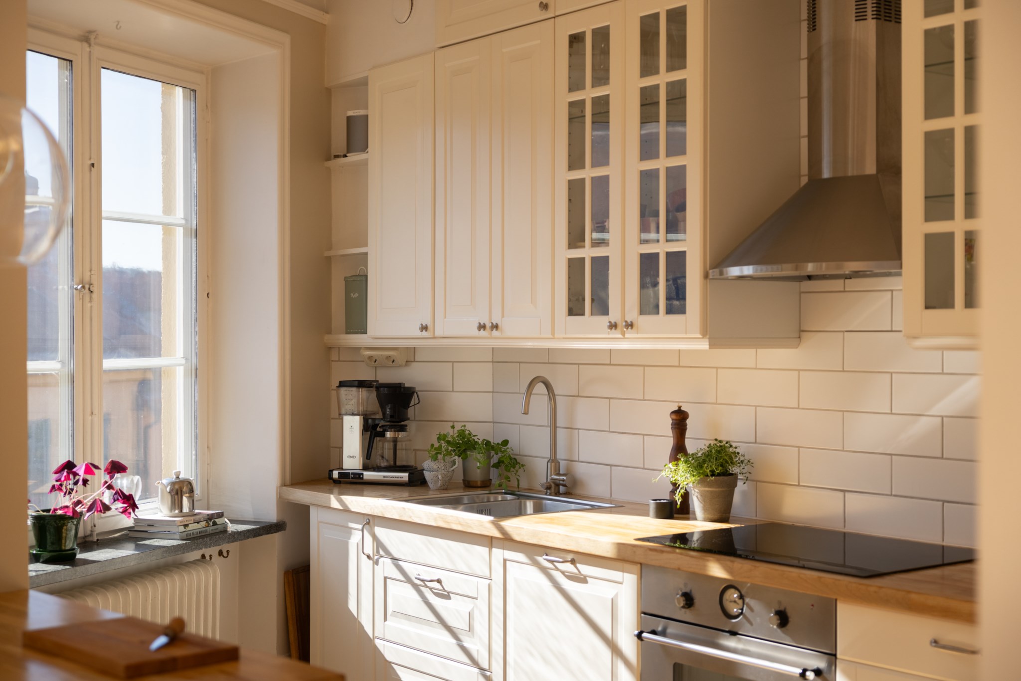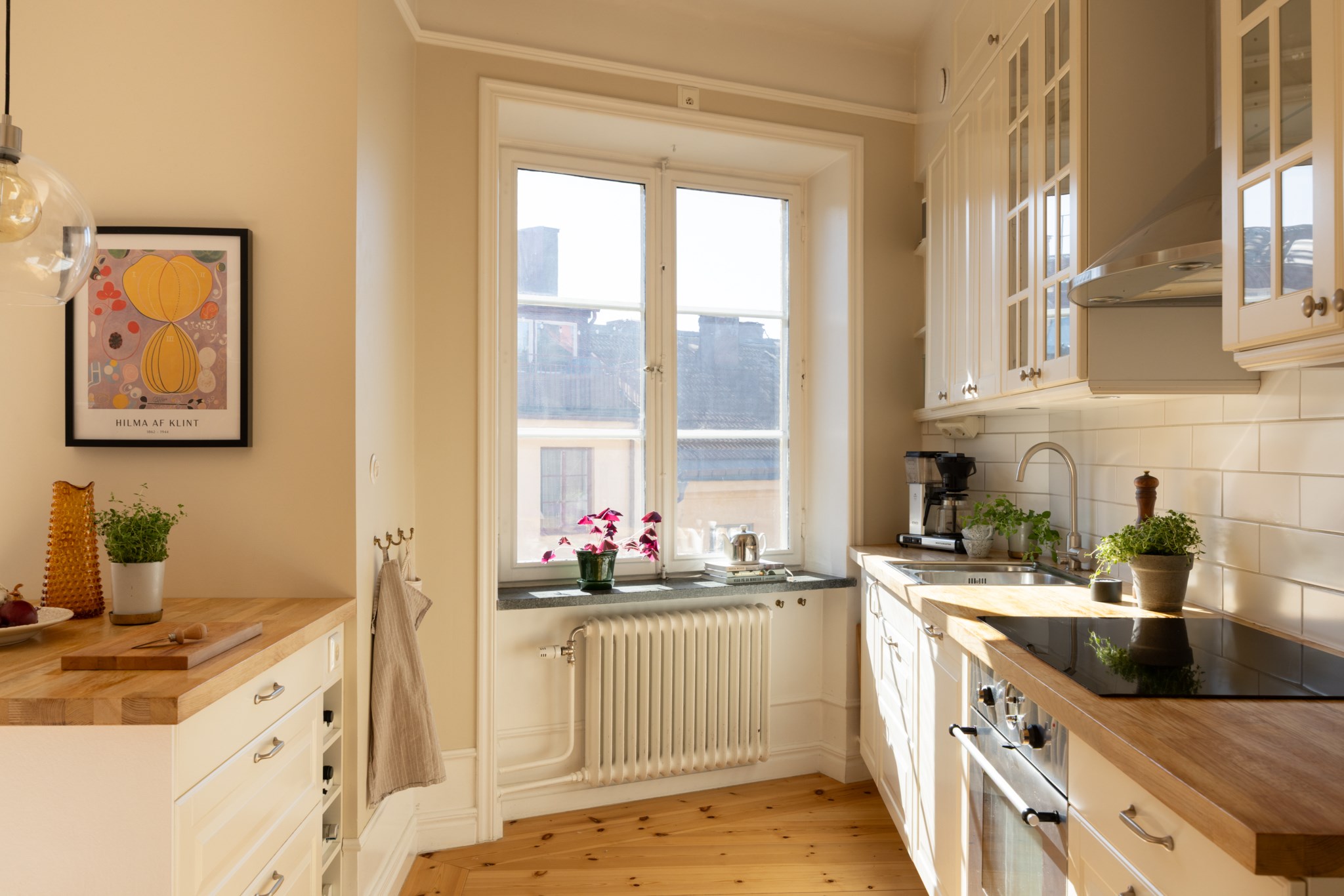 Modernt kök med smakfulla materialval bestående av ljusa köksluckor och bänkskiva i trä med stänkskydd ovan i vitt. Den maskinella utrustningen består av diskho, spis, ugn, köksfläkt, diskmaskin samt kyl och frys. Tidlösa ytskikt bestående av ljusa väggar i en beige nyans och ljust trägolv.
