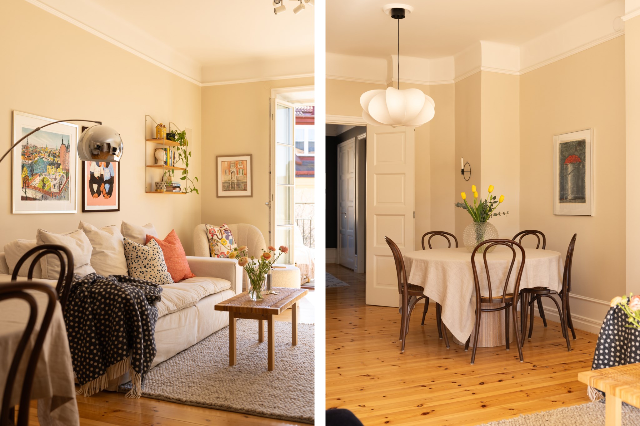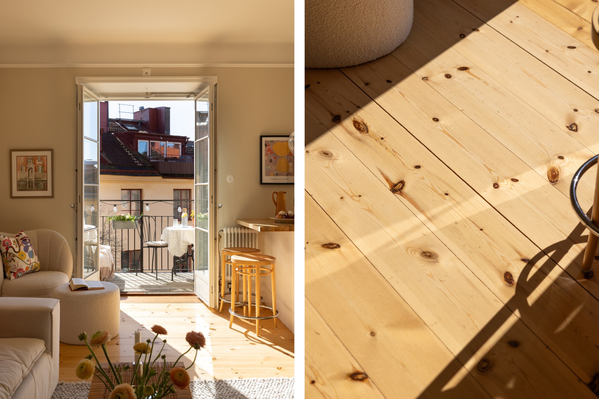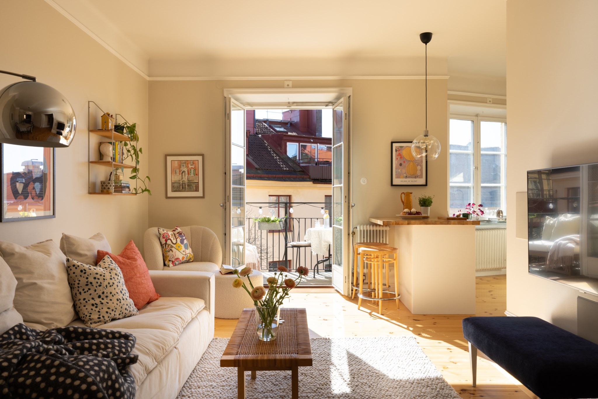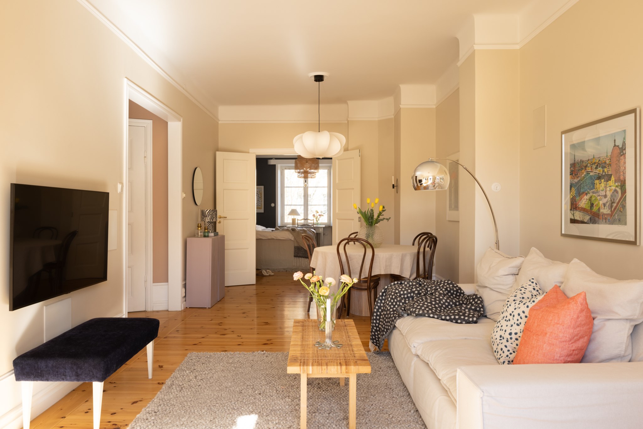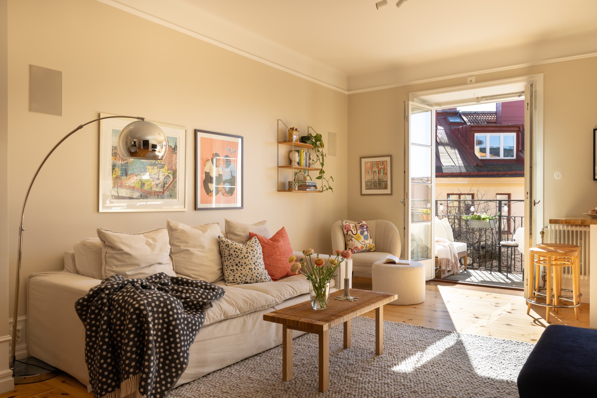 Luftigt vardagsrum med tidlösa ytskikt bestående av ljusa väggar i en beige nyans och ljust trägolv. I vardagsrummet inryms matgrupp, soffa, soffbord, TV-möbel samt annat möblemang efter smak och behov. Här möts du av ett härligt ljusinsläpp via stora fönster. Från vardagsrummet nås även lägenhetens härliga balkong.