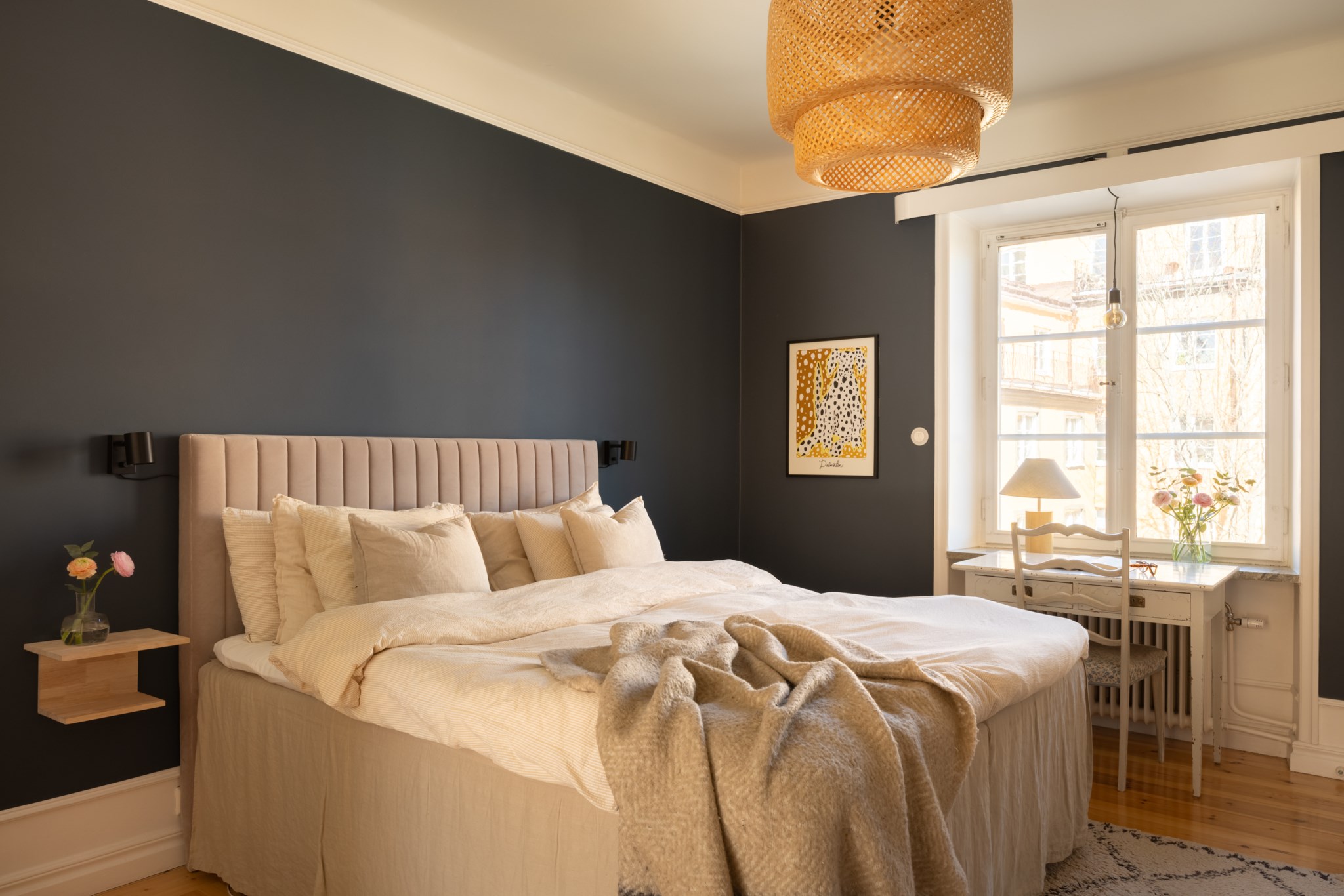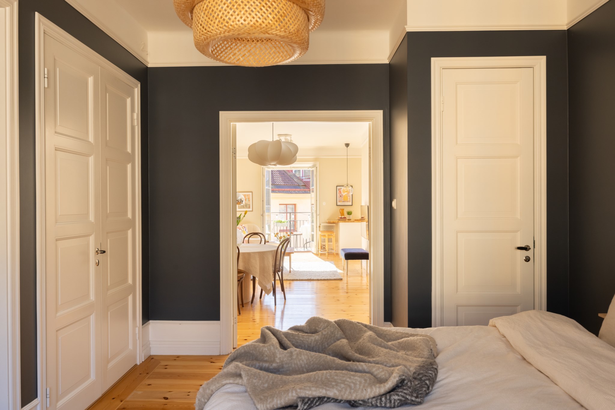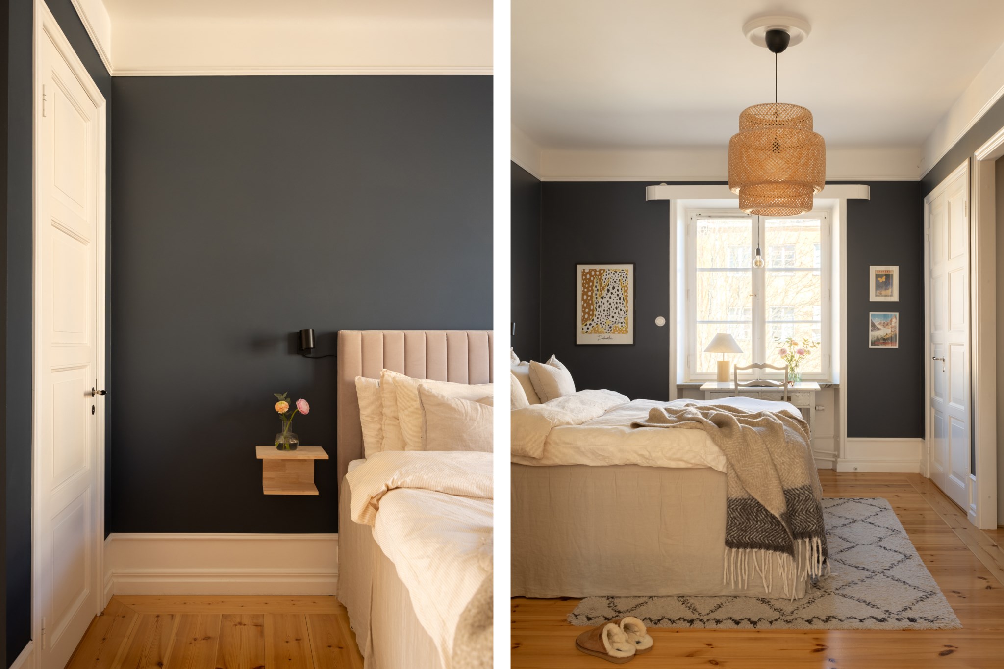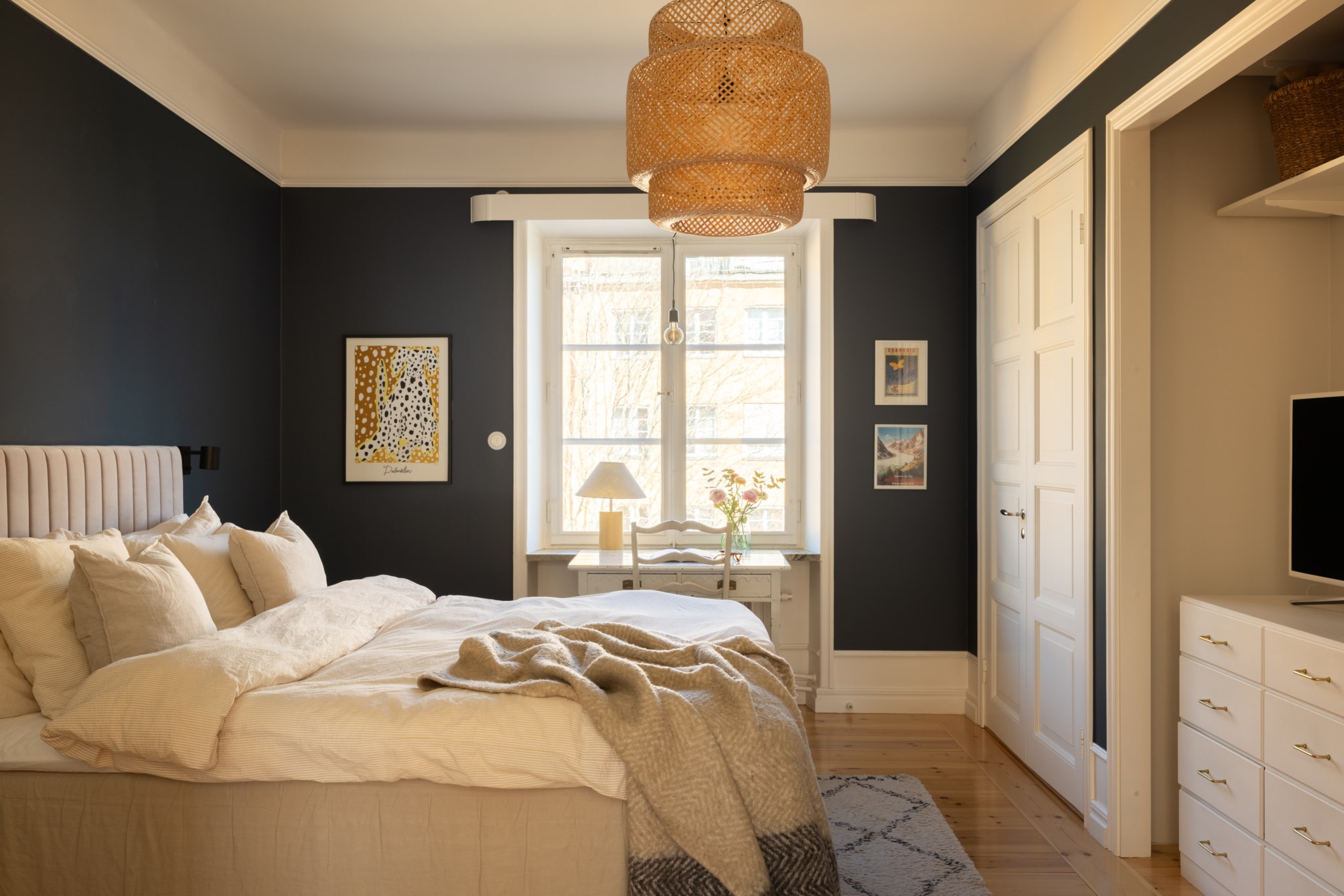 Stort sovrum med plats för dubbelsäng och annat möblemang efter smak och behov. Gott om plats för förvaring via garderob. Ett härligt ljusinsläpp tar sig in via fönster. Tidlösa ytskikt bestående av mörka väggar i en blå nyans och ljust trägolv.