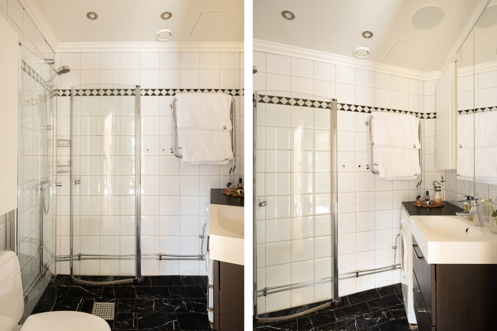 Rymligt badrum med ljust kakel och mörkt klinker. Badrummet är utrustat med WC, handdukstork, handfat ovan kommod, spegelskåp, samt dusch med glasvägg. Extra bekvämligheter genom en tvättmaskin.