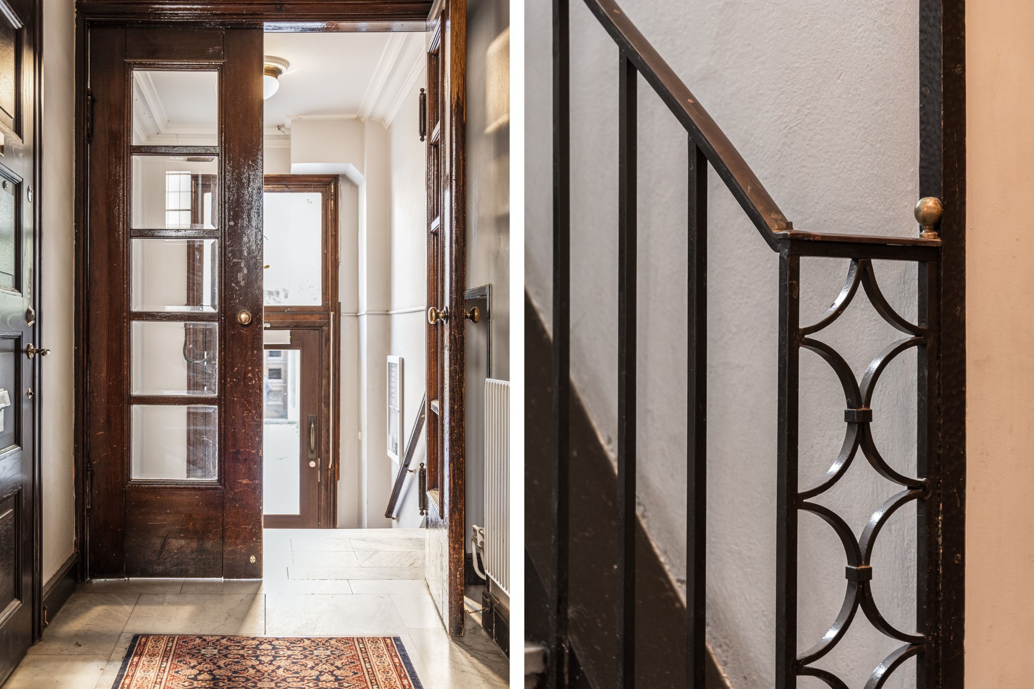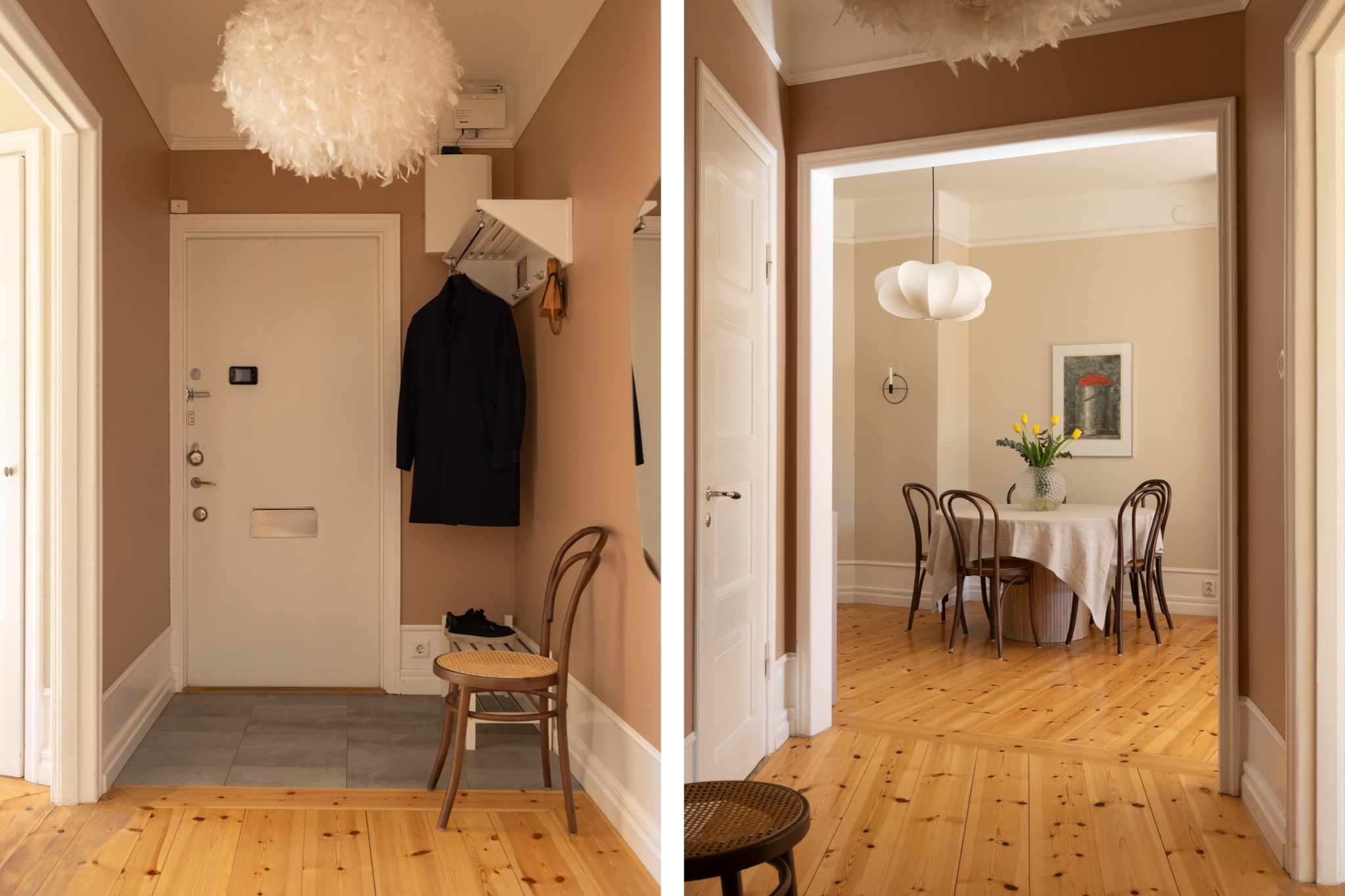 Välkomnande hall med plats för avhängning, skoställ samt mindre avlastningsmöblemang efter smak och behov. Tidlösa ytskikt bestående av ljusa väggar i en rosa nyans och ljust klinker.