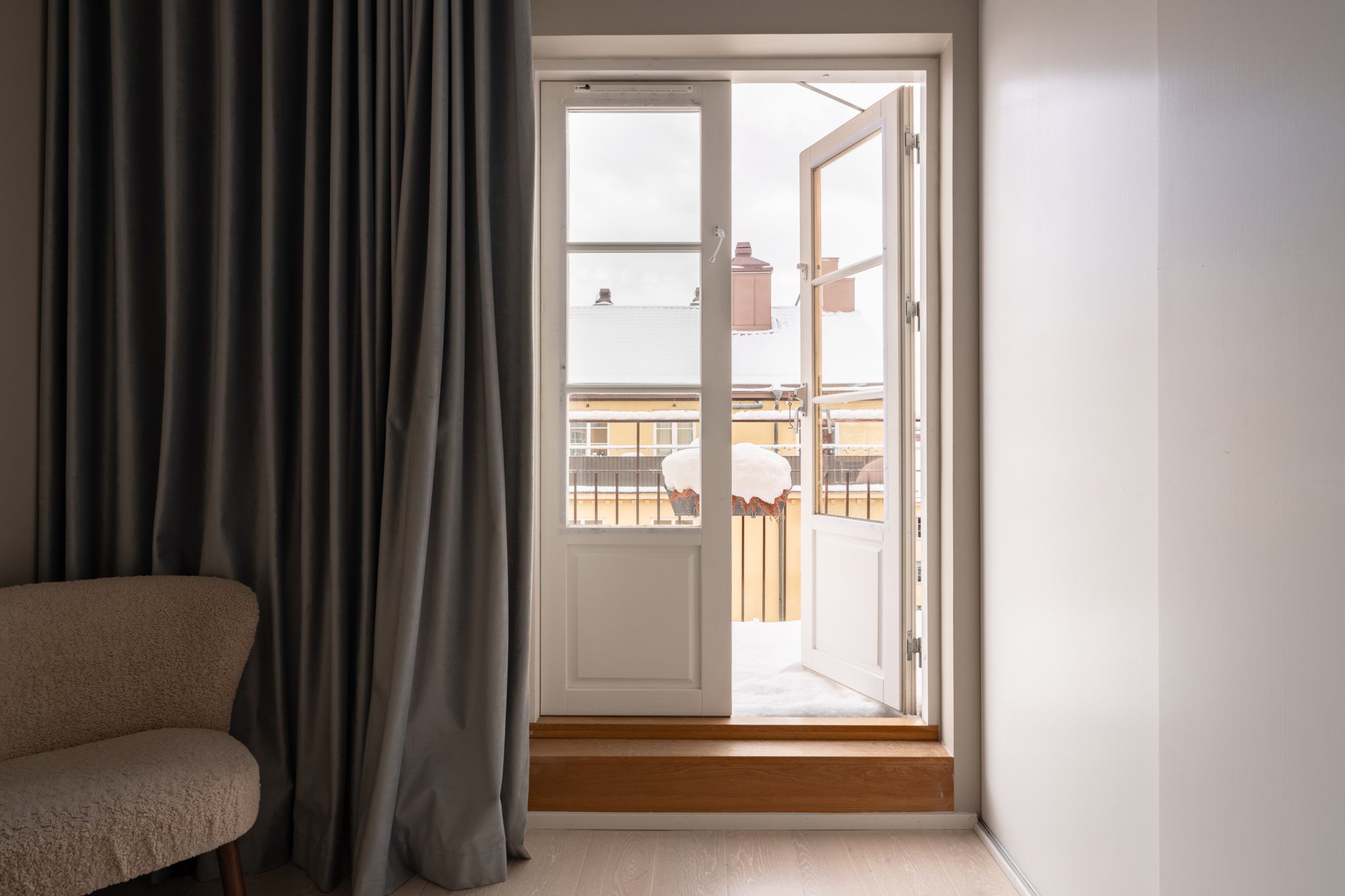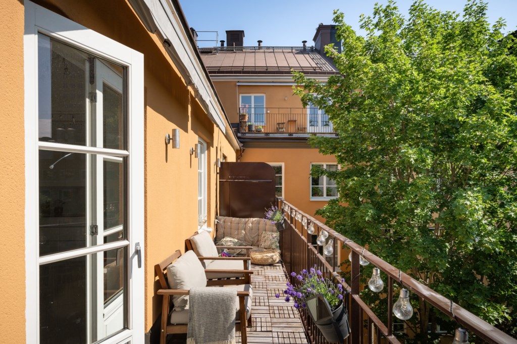 Till lägenheten hör en generös kungsbalkong som går längs med hela bostaden och nås via vardagsrum och sovrum. Här finns plats att möblera med soff- och sittgrupp, växtligheter samt grill. Balkongdel som nås via kök och vardagsrum är i söderläge/sydvästläge.