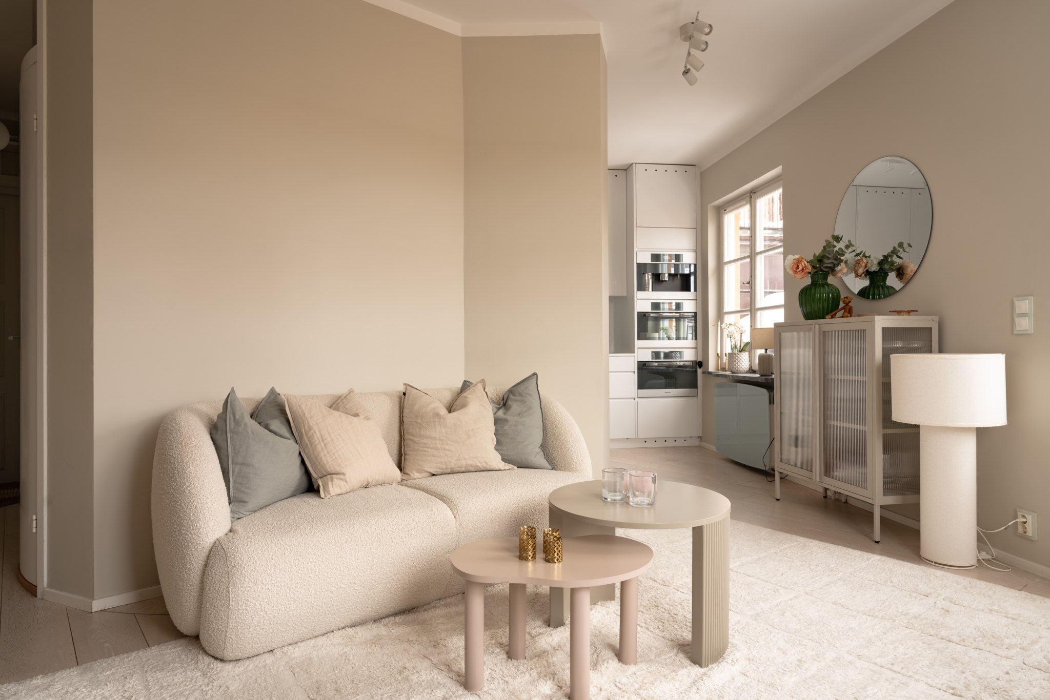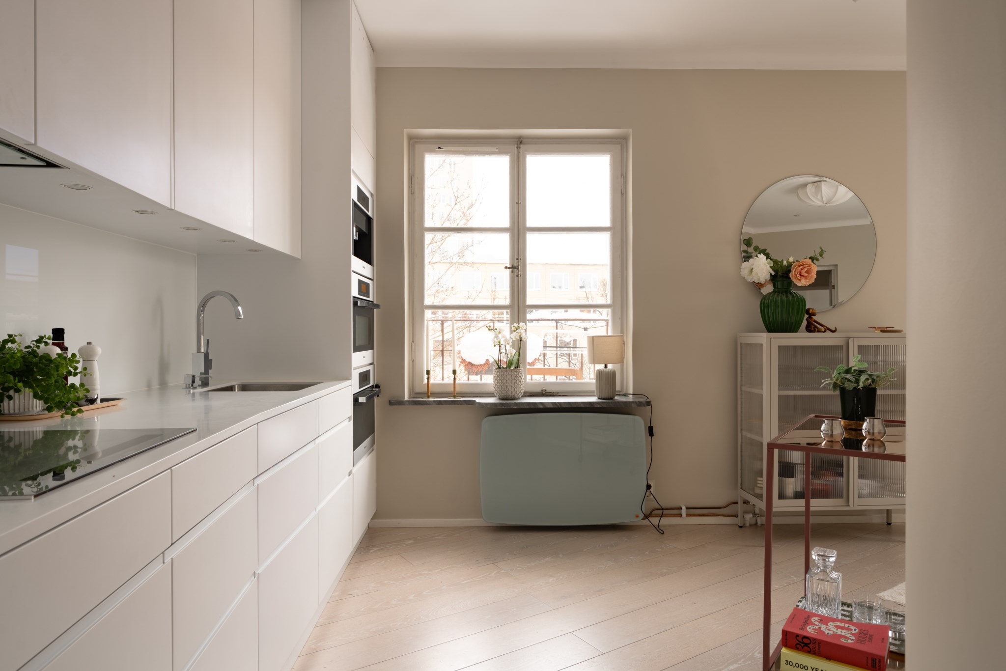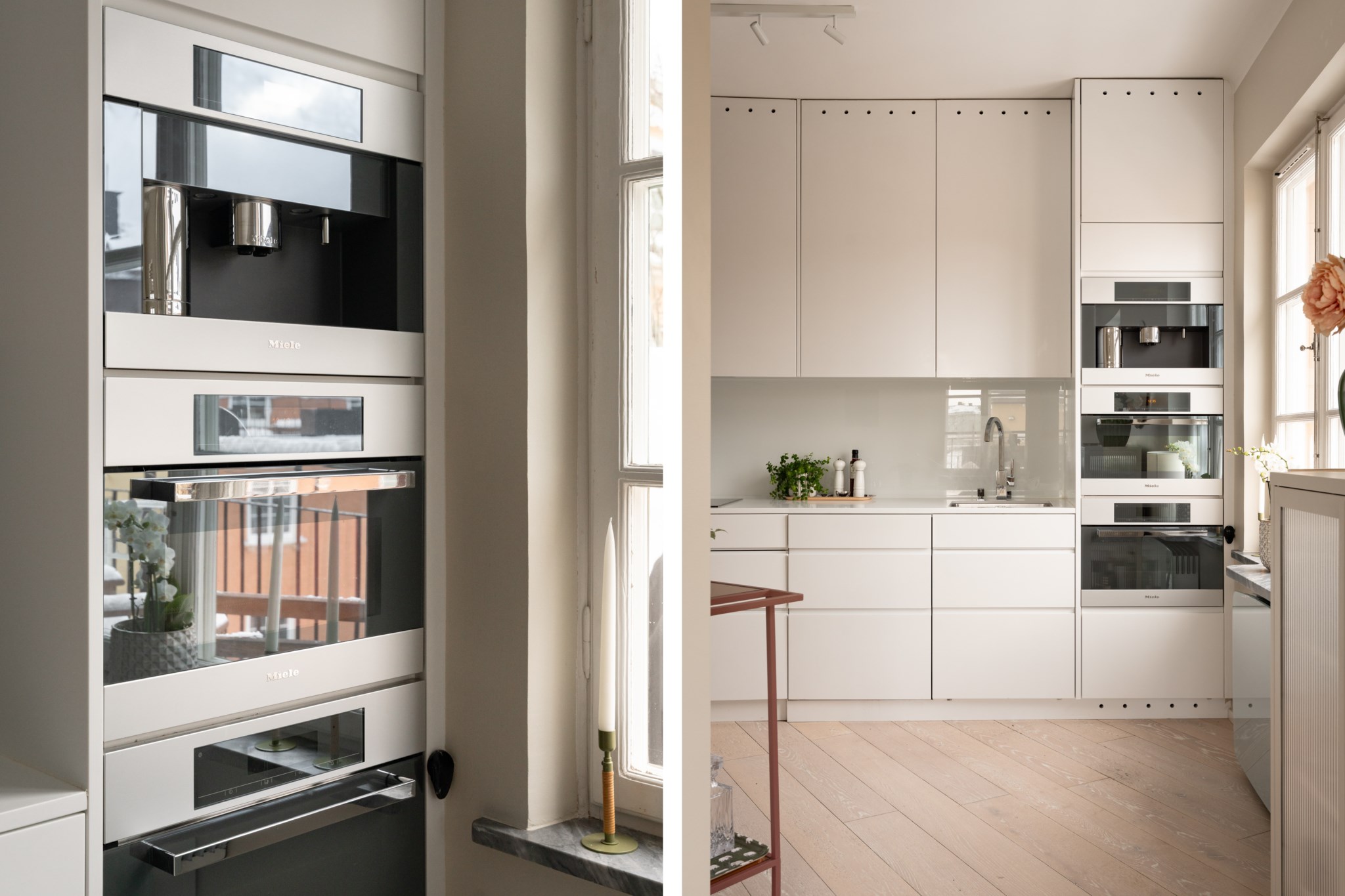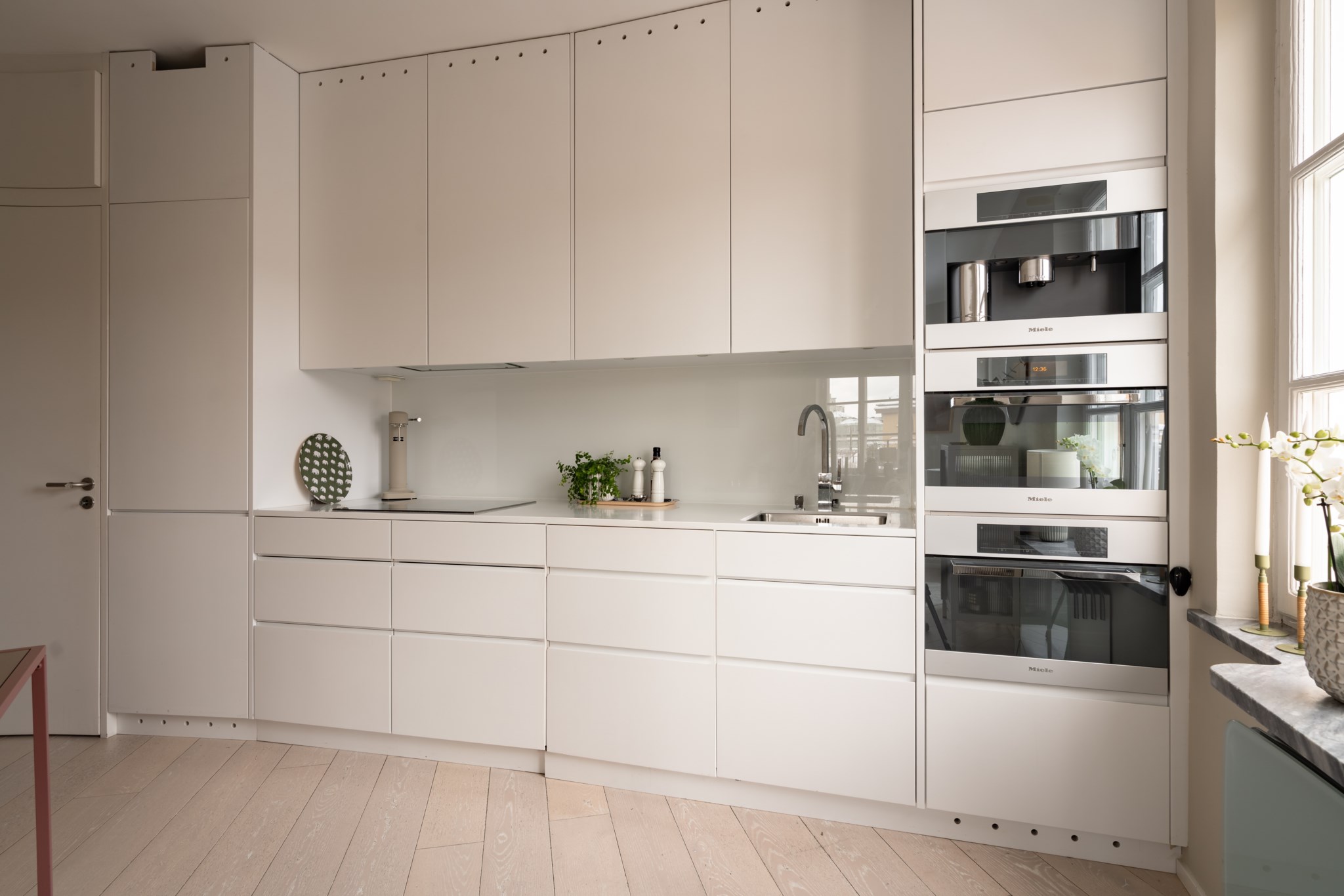 Stilrent kök i genomgående vita skåpsluckor och vit bänkskiva i Corian. Utrustat med spishäll, fläkt, kombinerad mikro/ugn, kombinerad ångugn/vanlig ugn, diskmaskin samt kyl- och frys. Alla köksmaskiner är från Miele. Plats för en matgrupp. Väggar i beige kulör och ljust golv.