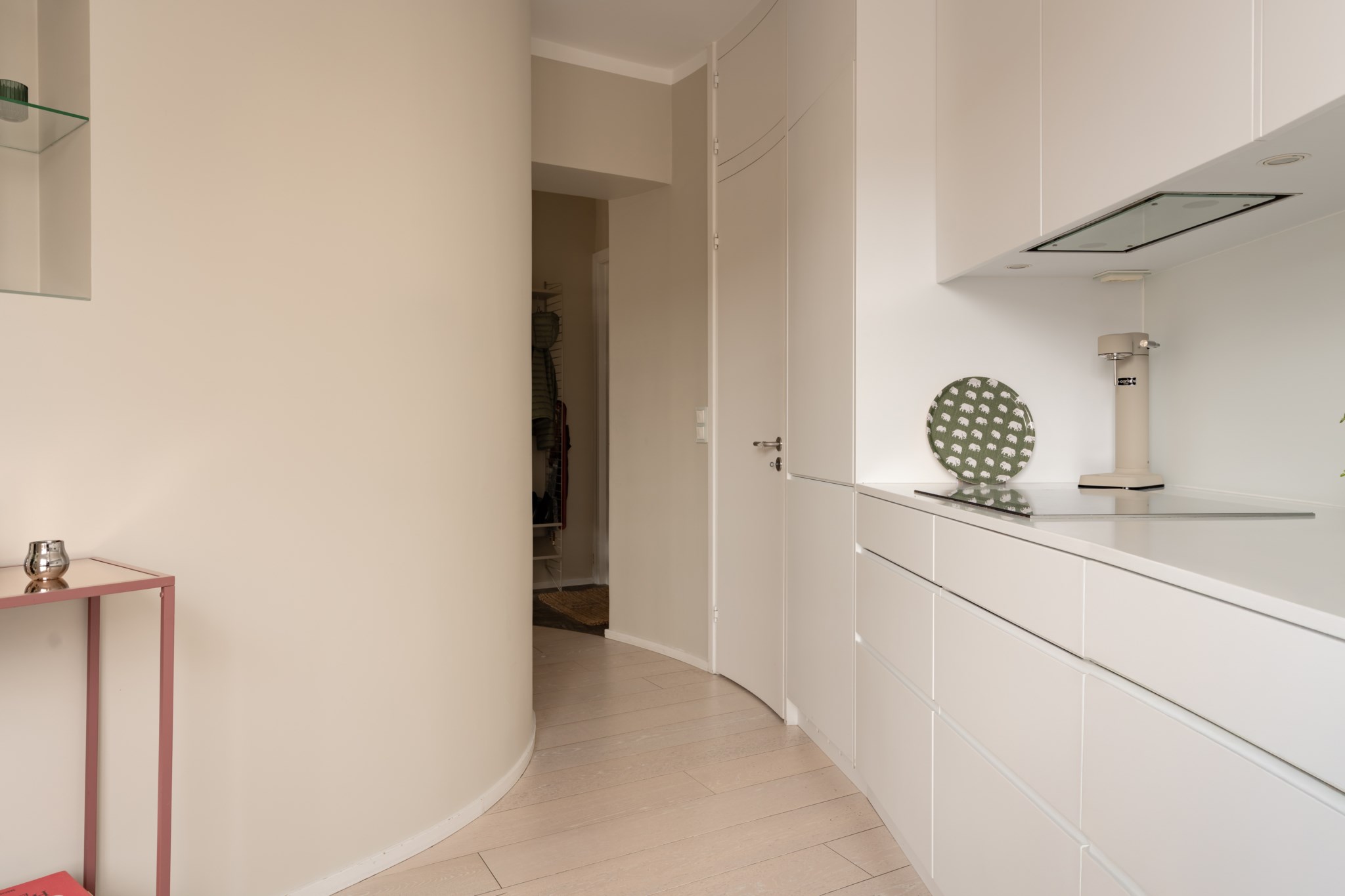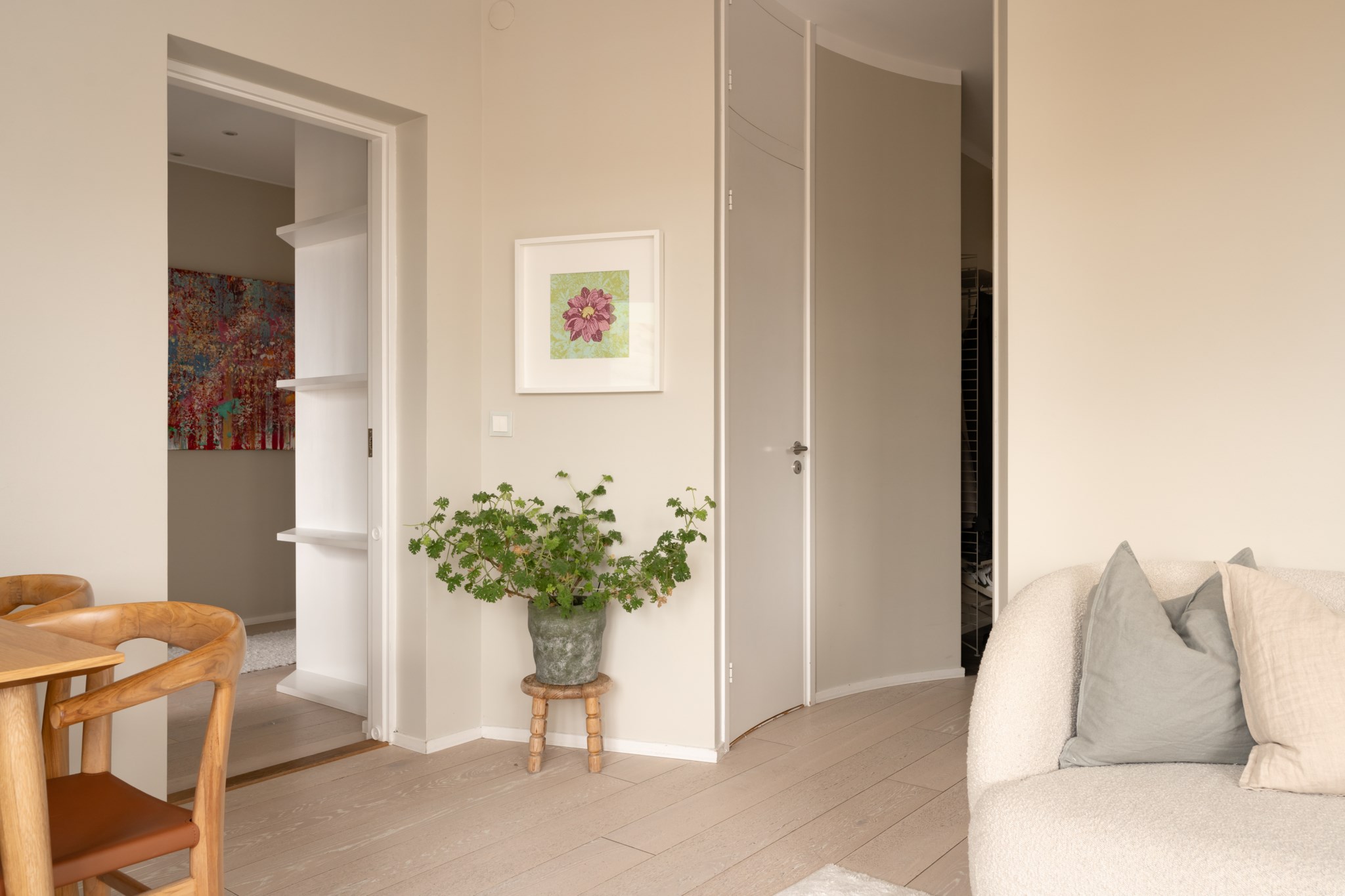Välkomnande hall med väggar i vit kulör och ljust golv. Avhängningsmöjligheter i form av hatthylla och skoställ.