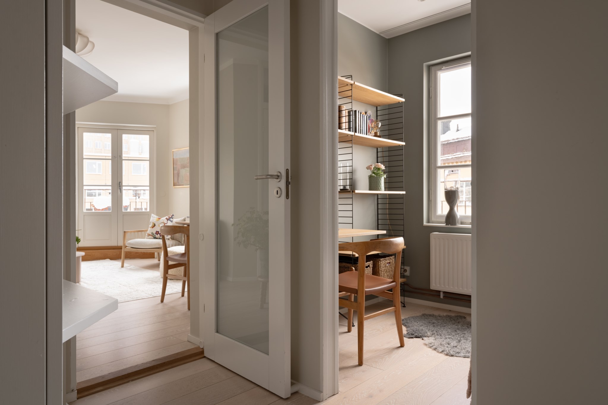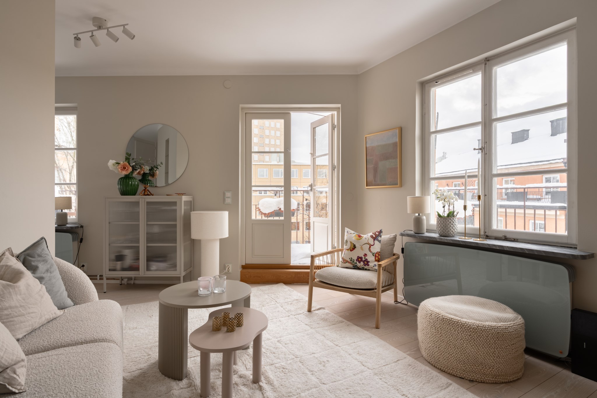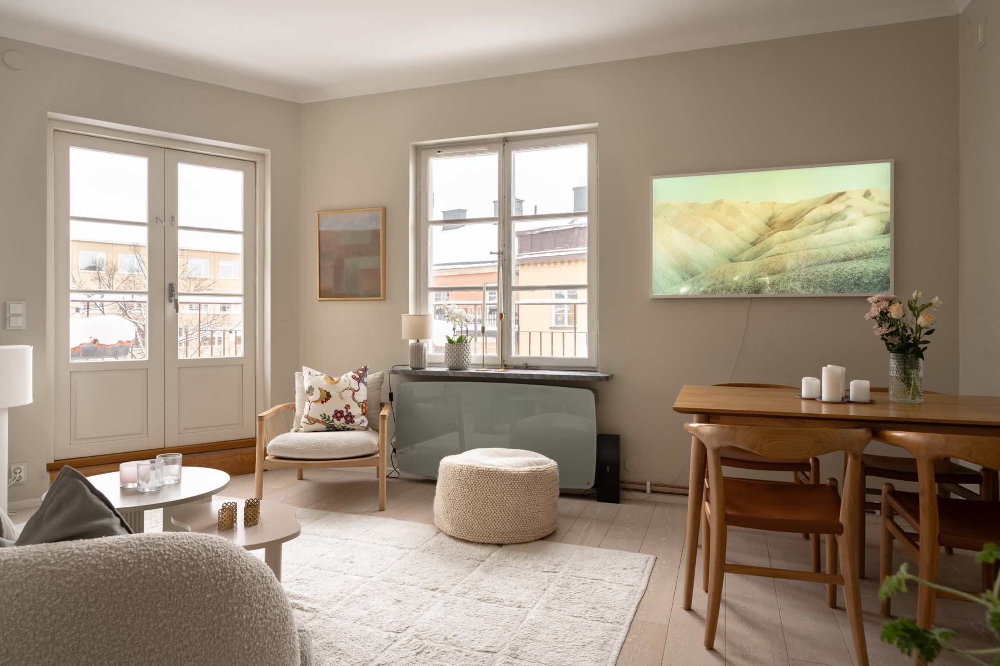 Luftigt vardagsrum med generöst ljusinsläpp från spröjsade fönster och dubbla balkongdörrar. Plats att möblera med soffgrupp och övrigt tv-möblemang efter smak och behov. Väggar i beige kulör och ljust golv.