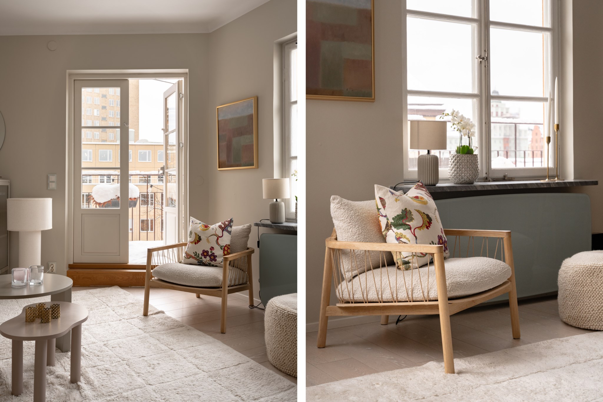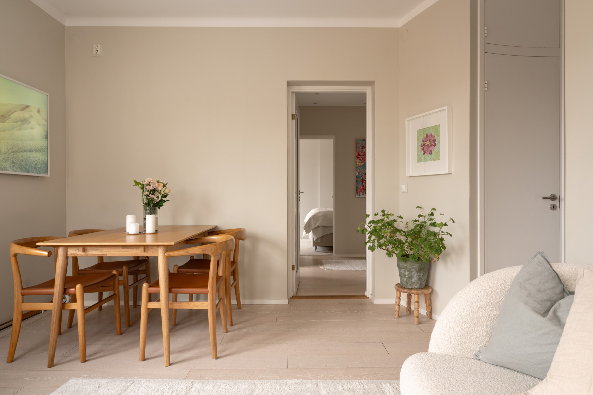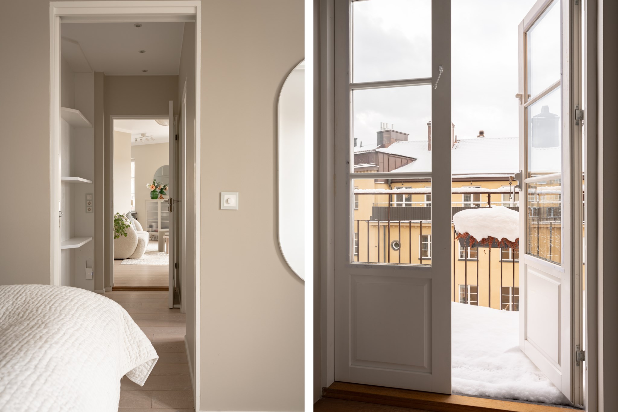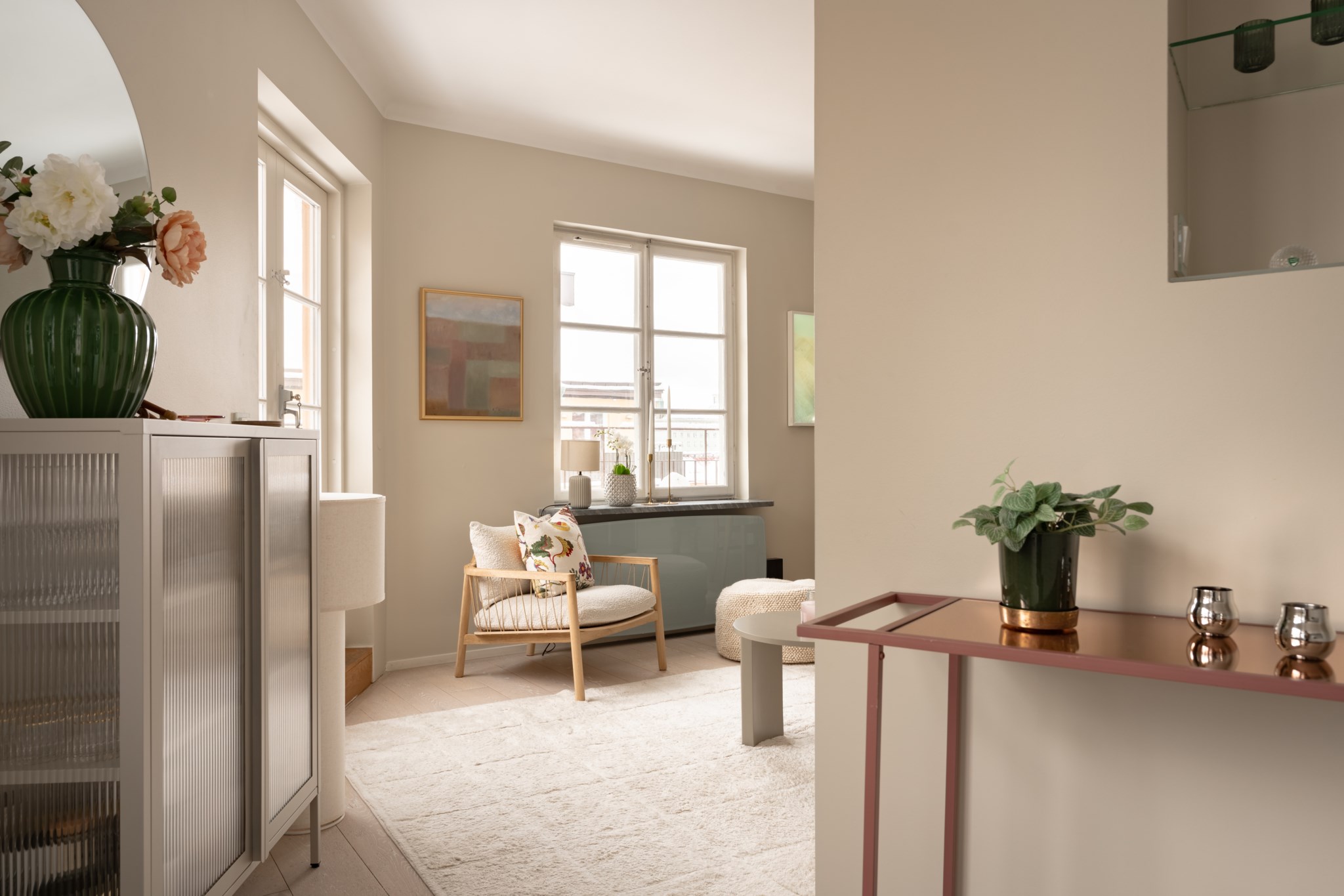 Luftigt vardagsrum med generöst ljusinsläpp från spröjsade fönster och dubbla balkongdörrar. Plats att möblera med soffgrupp och övrigt tv-möblemang efter smak och behov. Väggar i beige kulör och ljust golv.