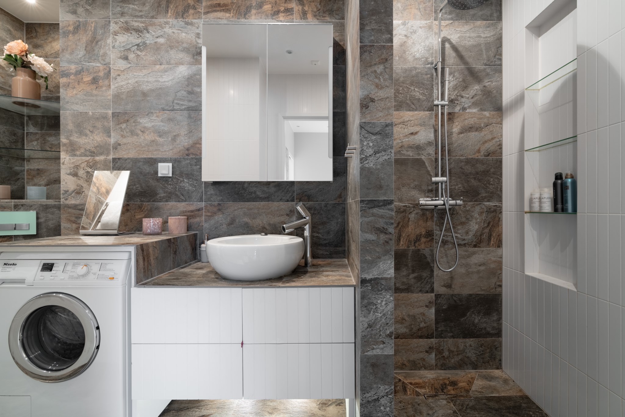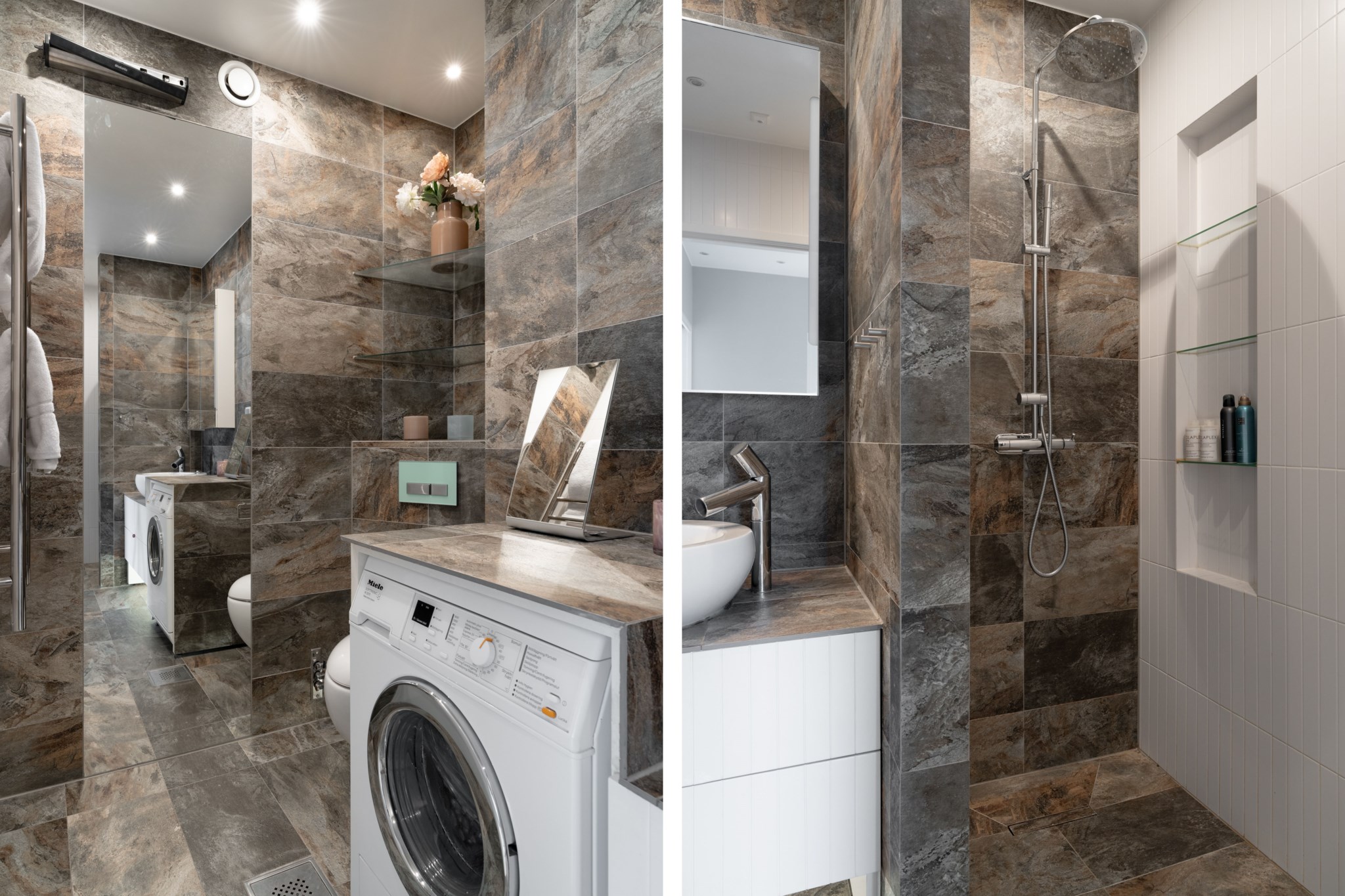 Exklusivt helkaklat badrum i mörkare kakel och klinker. Utrustat med handfat ovan kommod, wc, regndusch och tvättmaskin.