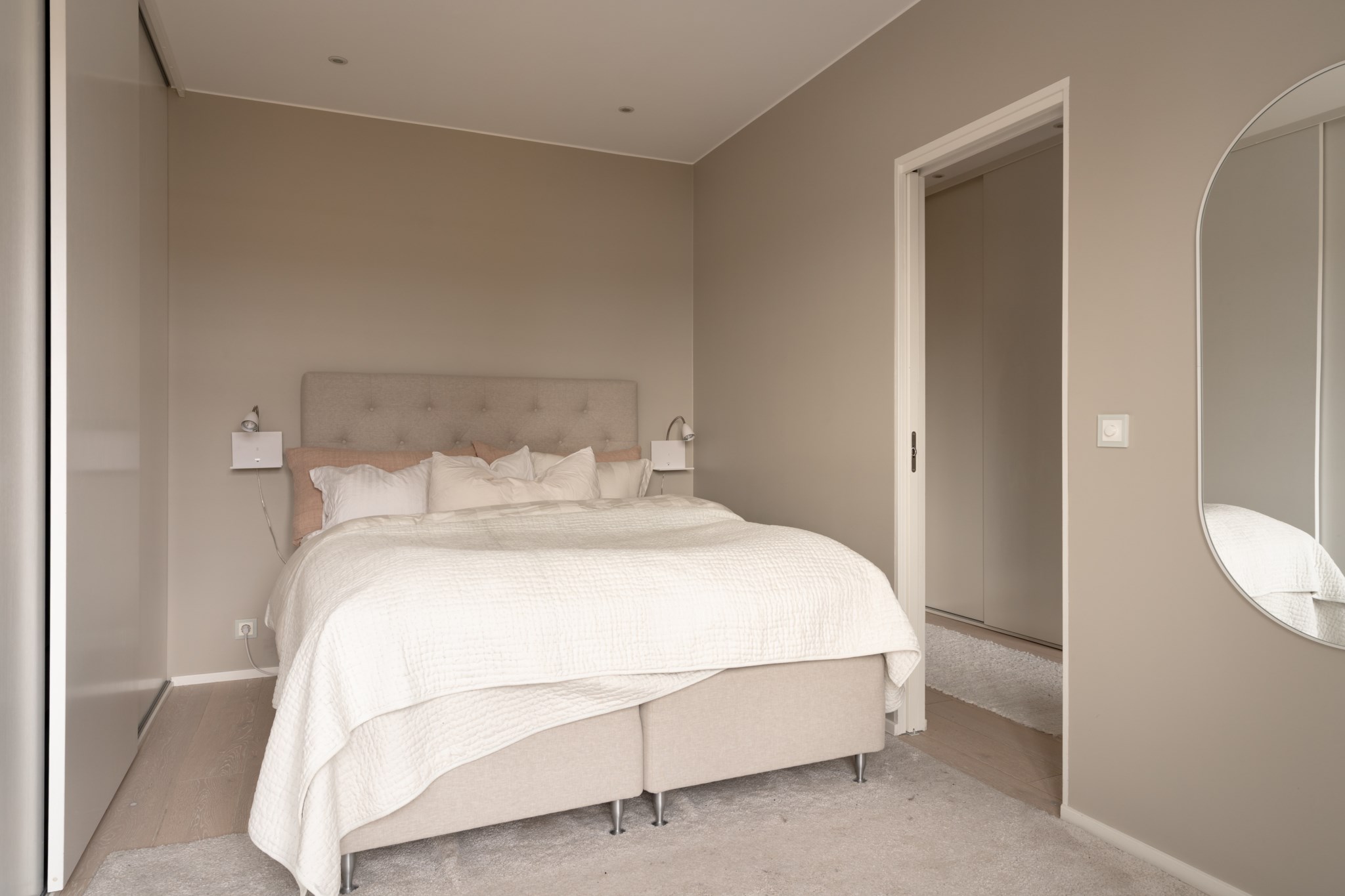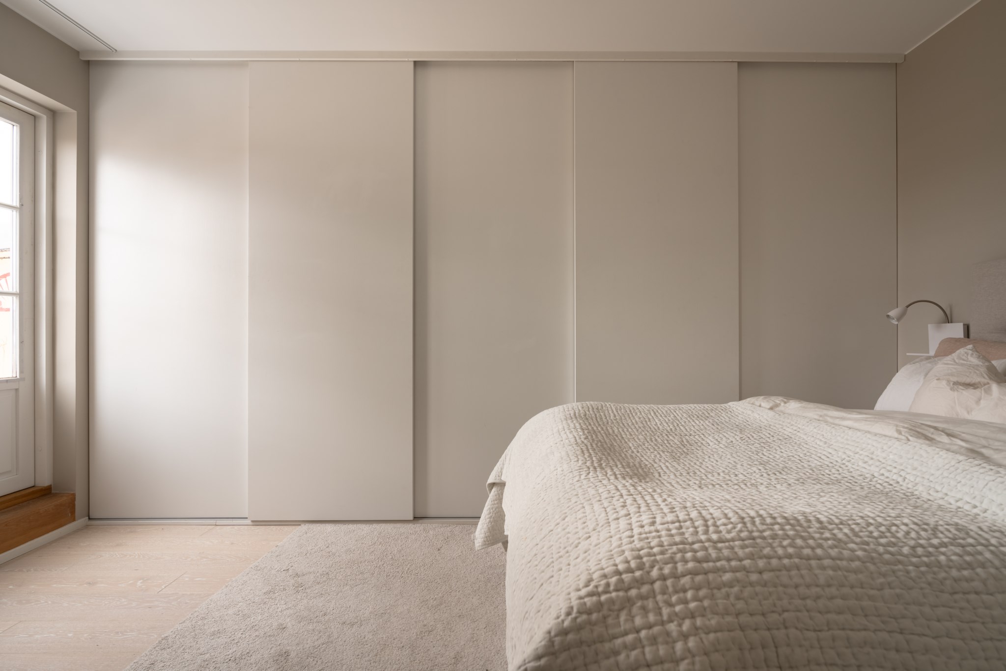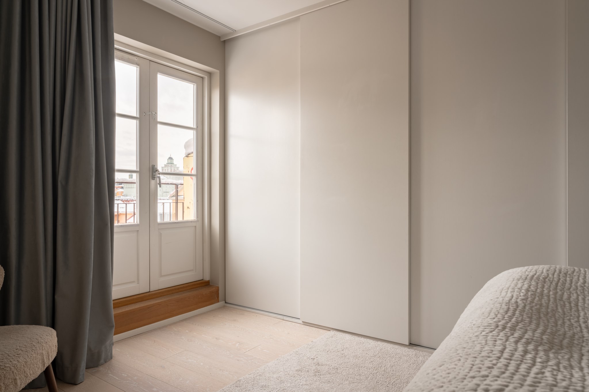 Rogivande sovrum med generöst ljusinsläpp från dubbla balkongdörrar som vetter ut mot bostadens generösa kungsbalkong. Plats för dubbelsäng och sängbord. Gott om klädförvaring i garderober. Väggar i beige kulör och ljust golv.