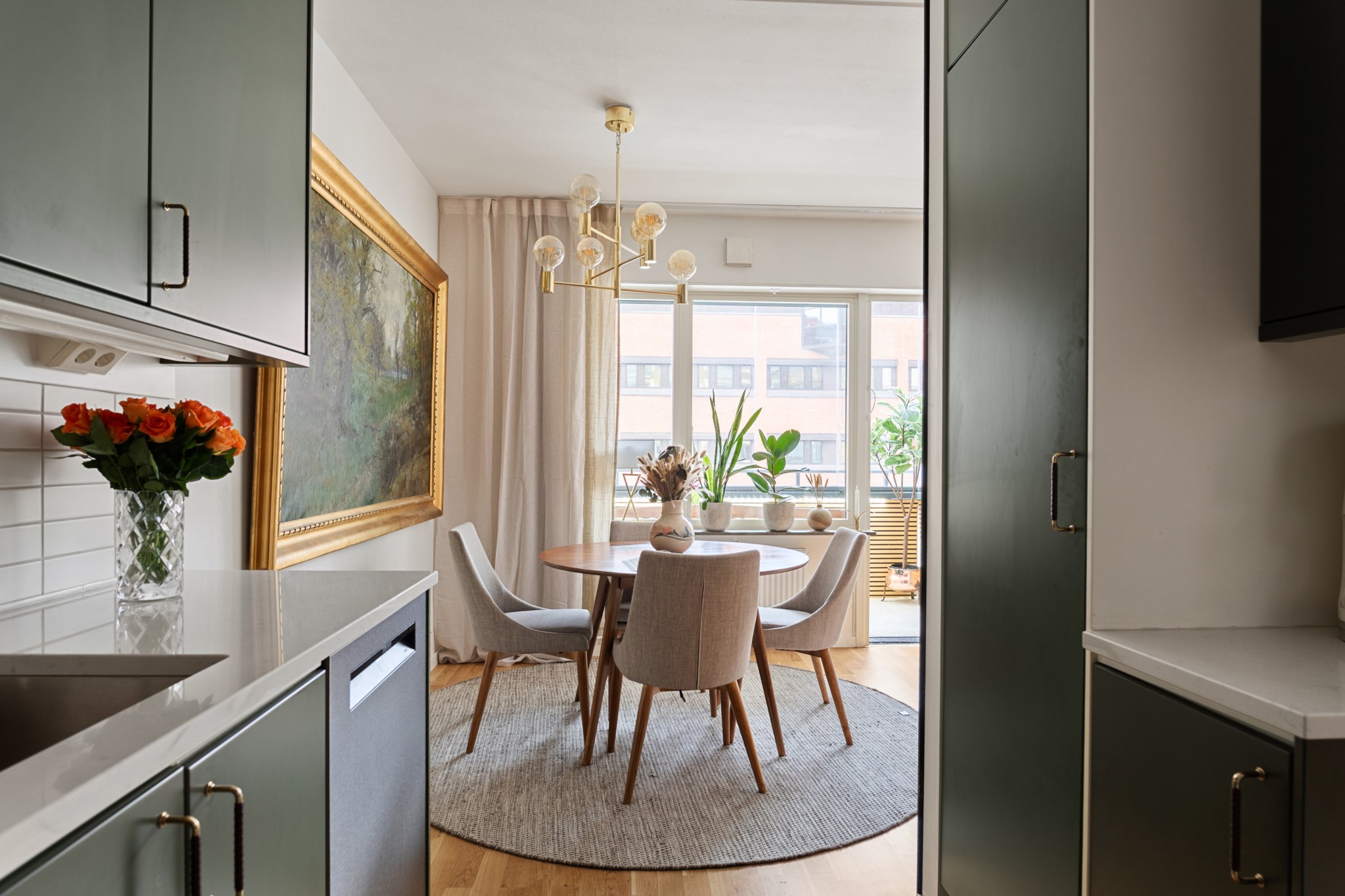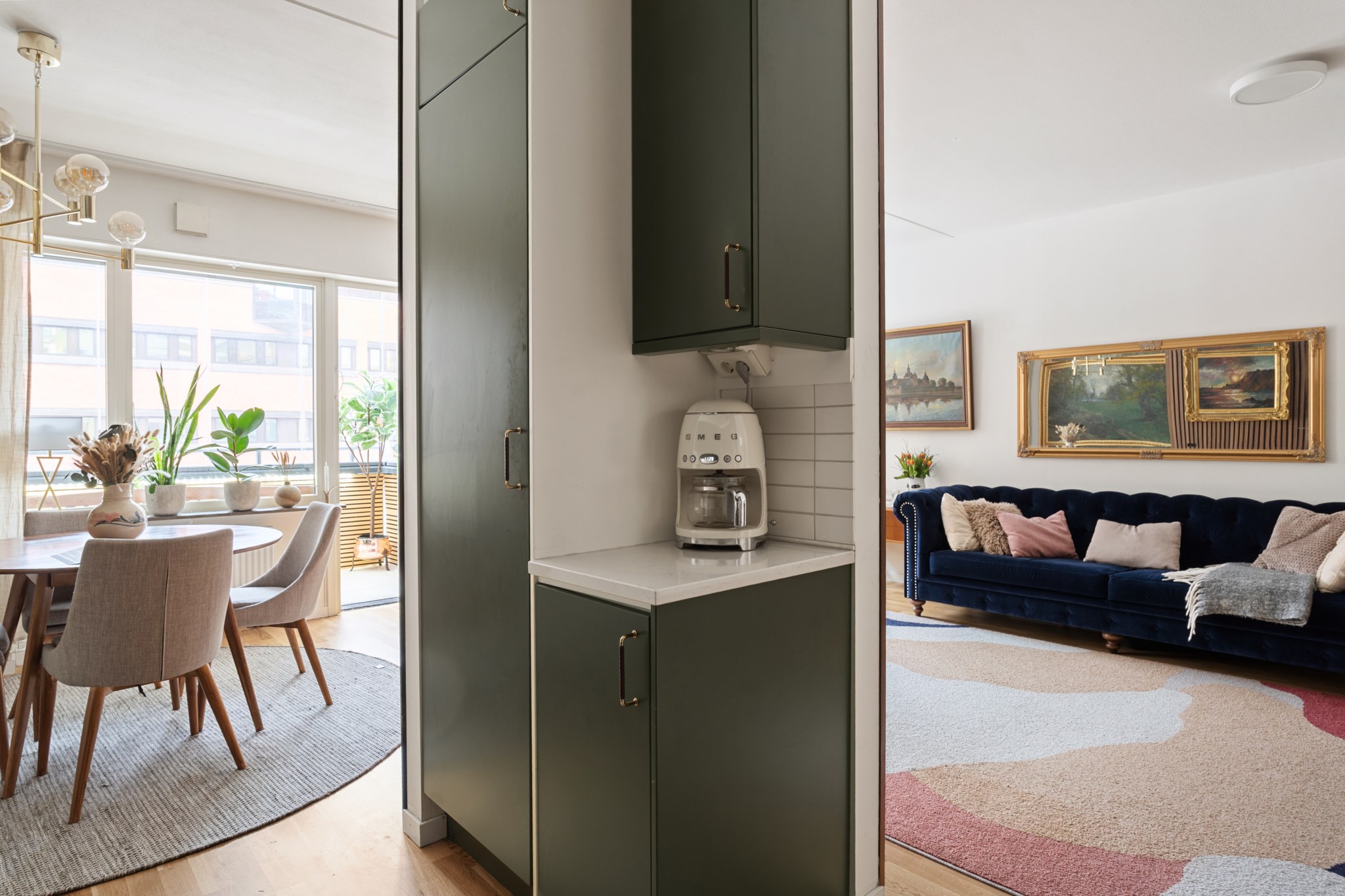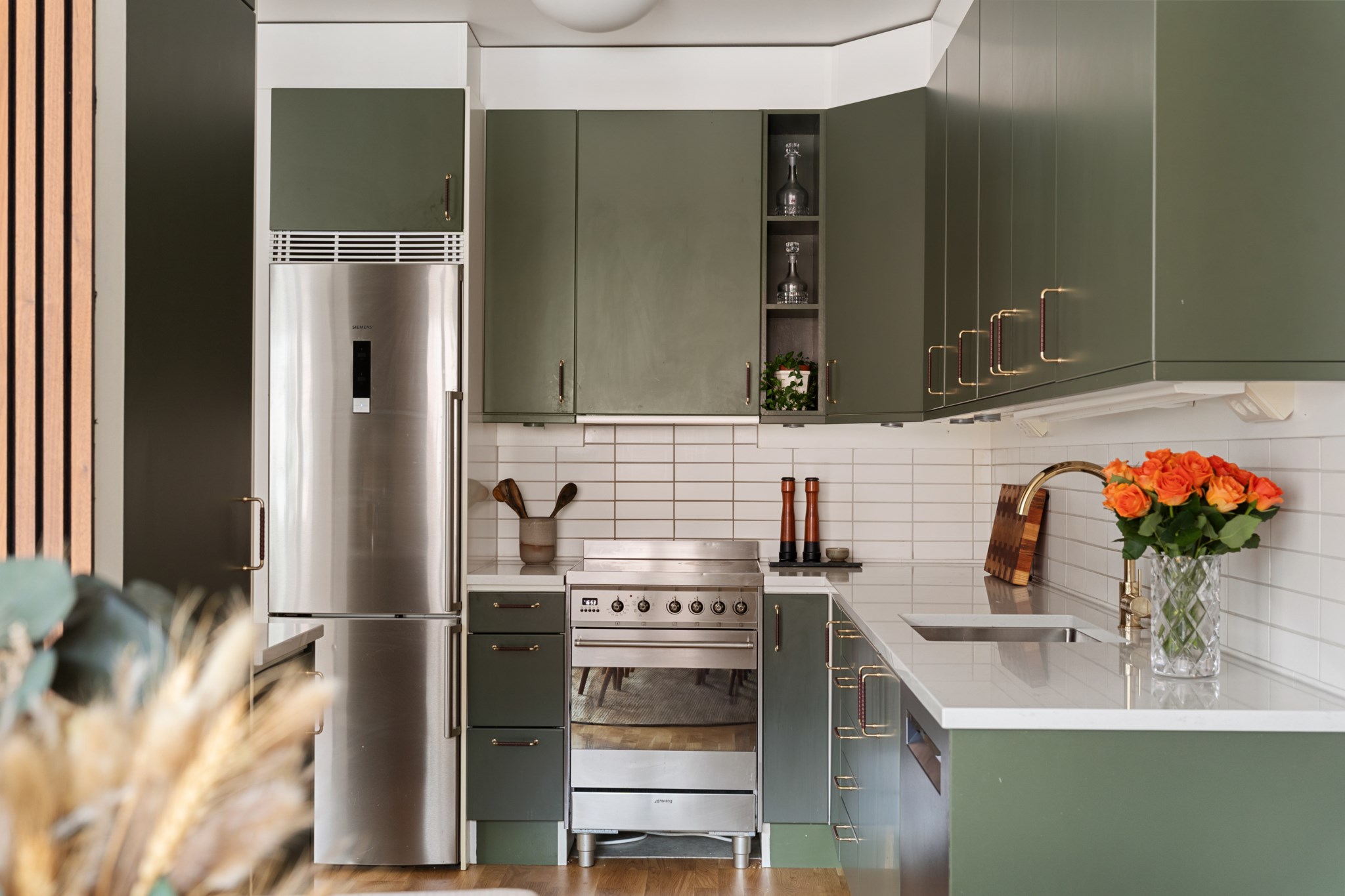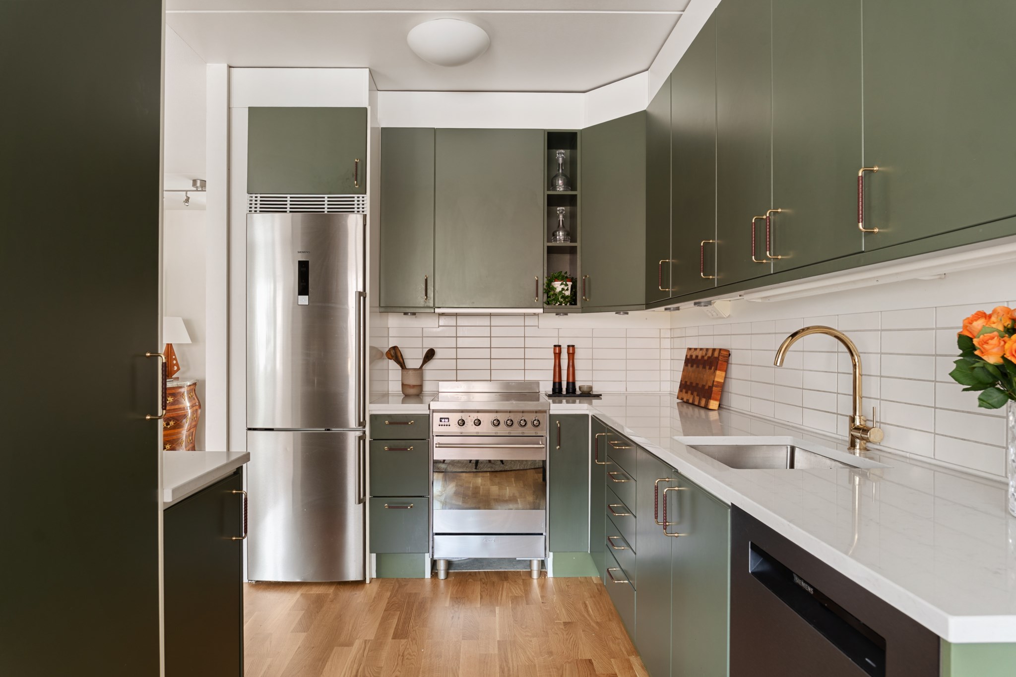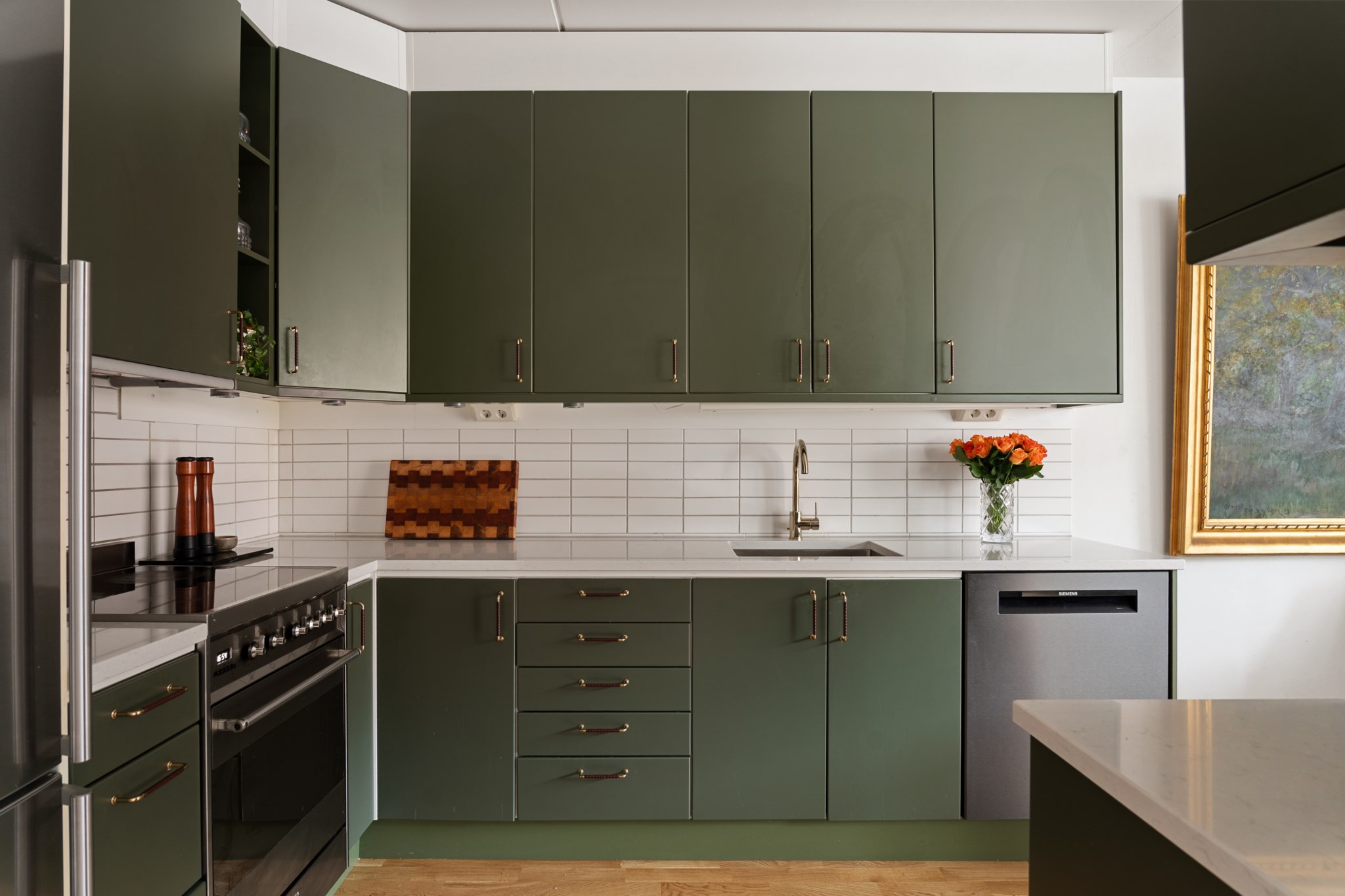 Stilrent och funktionellt grönt kök med goda arbetsytor och förvaring. Den öppna planlösningen mot vardagsrummet gör köket socialt och inbjudande, idealiskt för både vardag och middagar med vänner. Utrustat med moderna vitvaror så som ugn, köksfläkt, kyl/frys, diskmaskin, diskho samt mikrovågsugn.