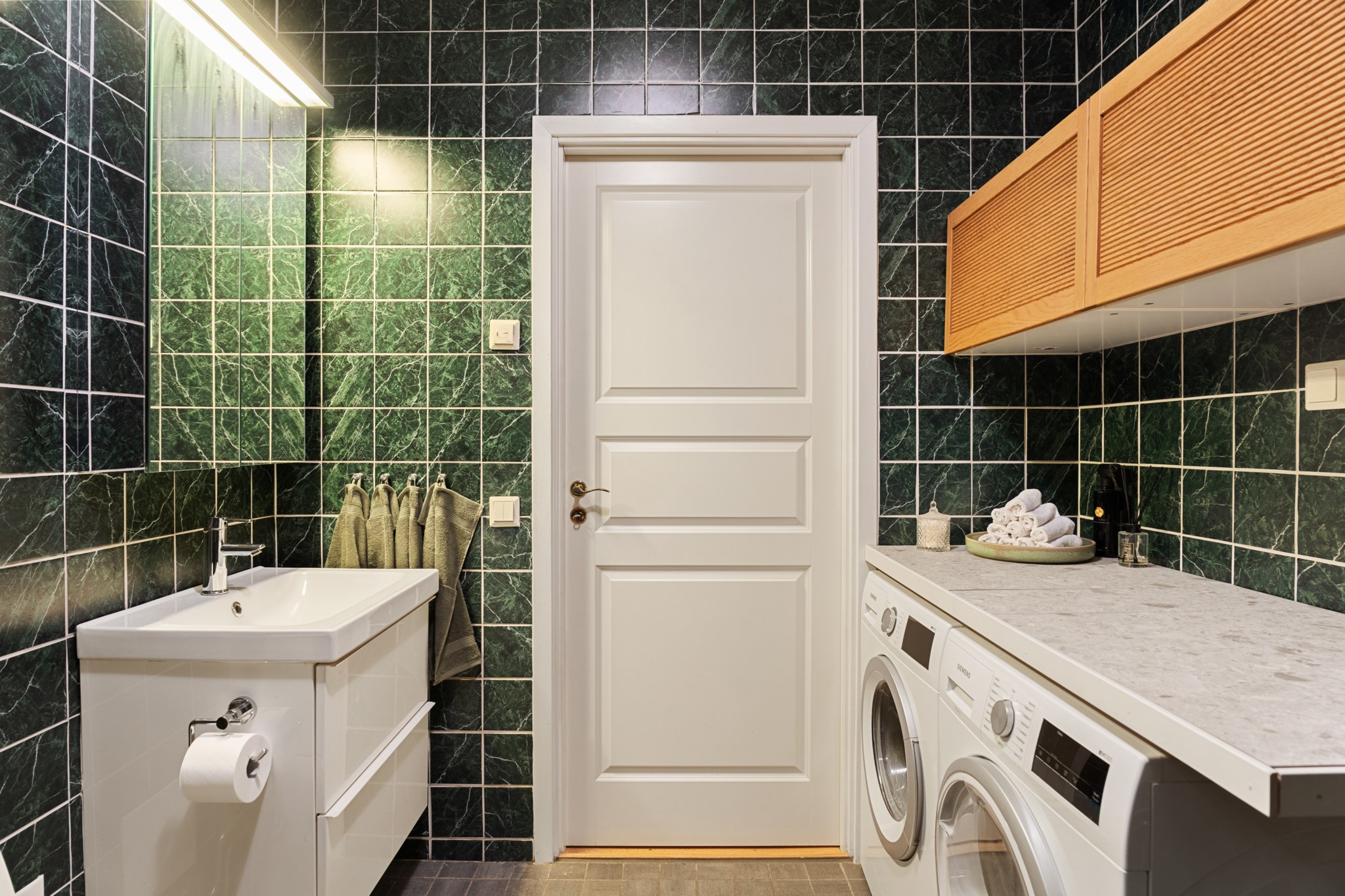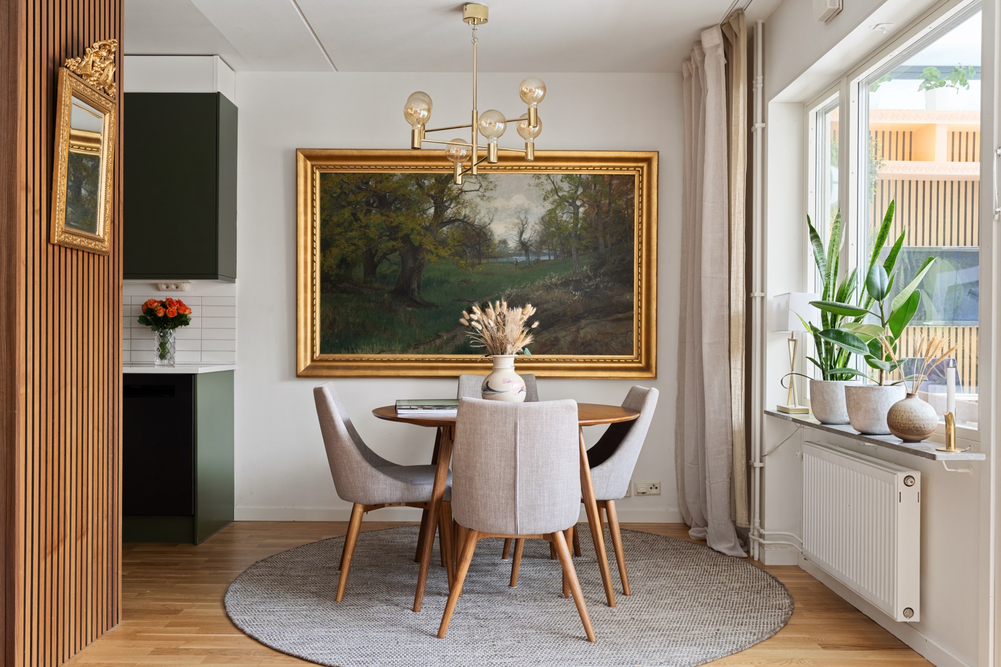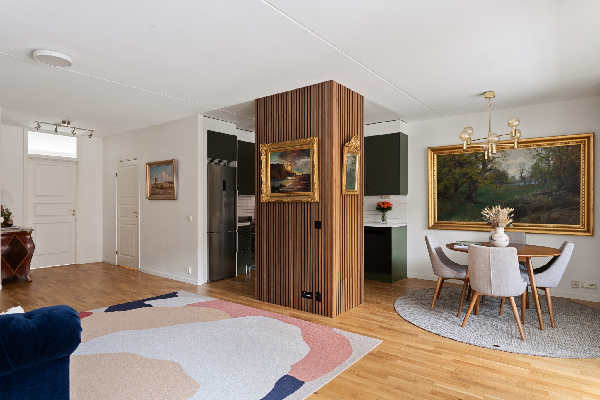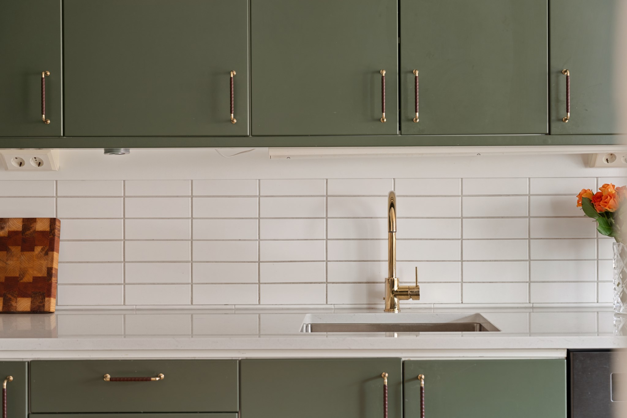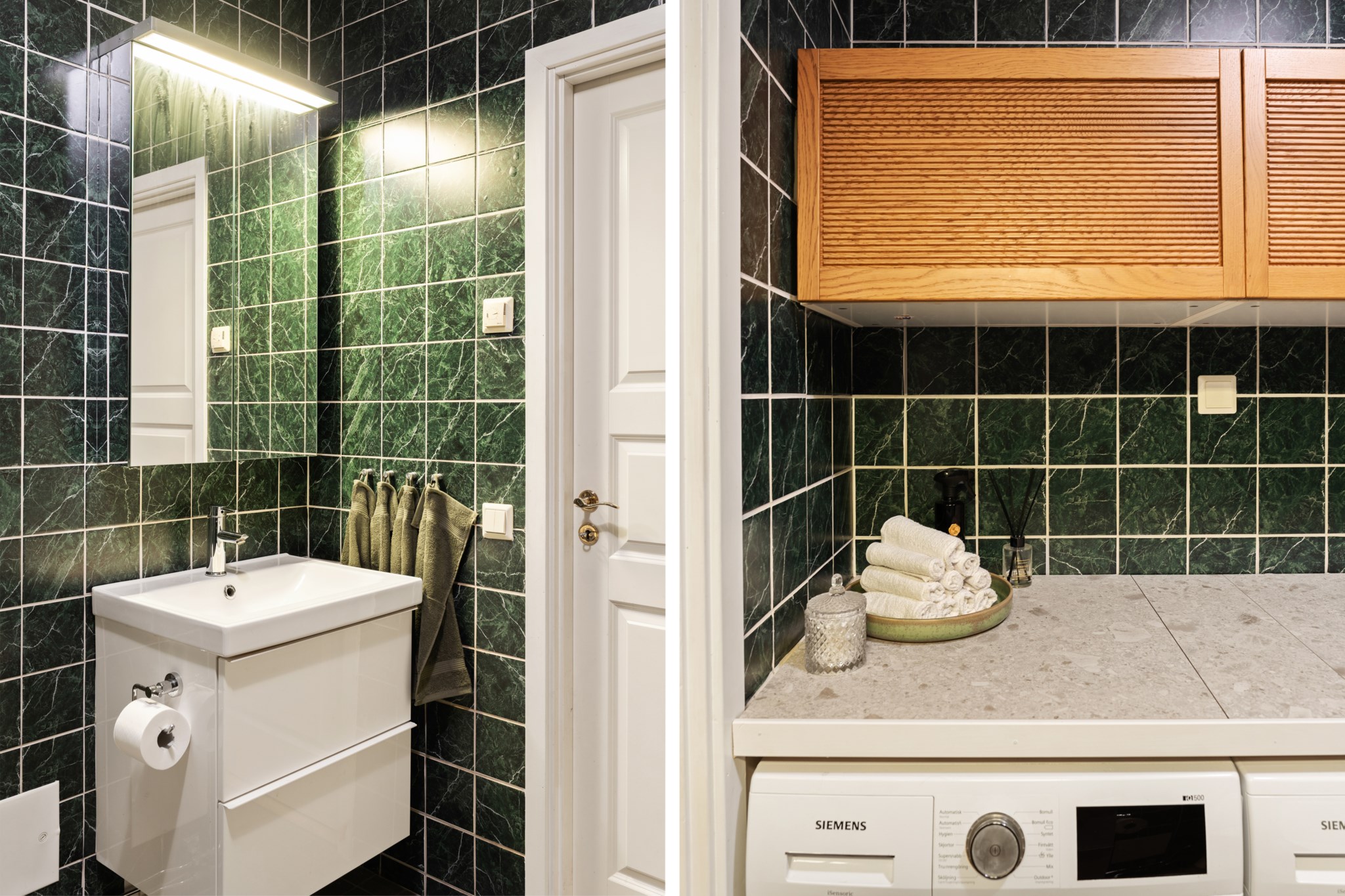 Stilrent och funktionellt grönt kök med goda arbetsytor och förvaring. Den öppna planlösningen mot vardagsrummet gör köket socialt och inbjudande, idealiskt för både vardag och middagar med vänner. Utrustat med moderna vitvaror så som ugn, köksfläkt, kyl/frys, diskmaskin, diskho samt mikrovågsugn.
