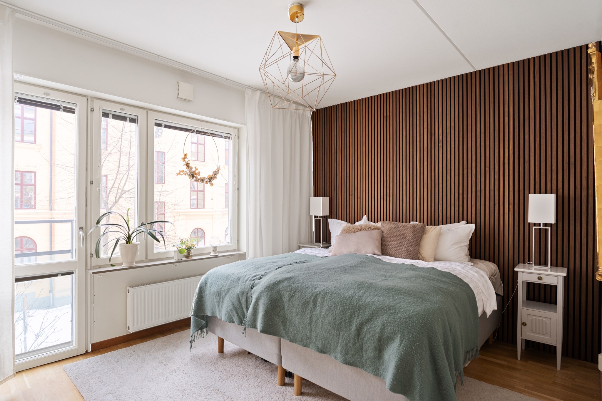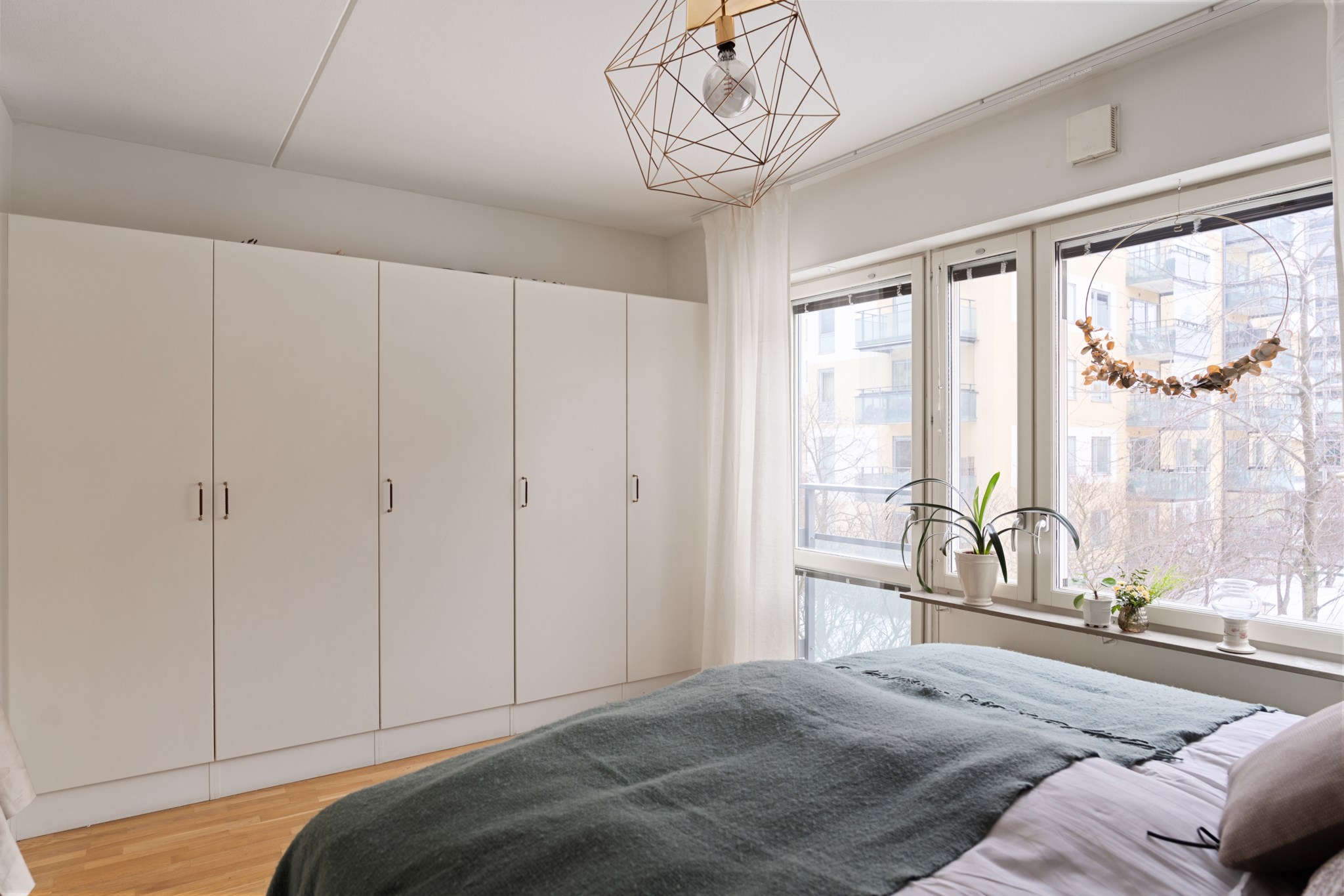Rofyllt sovrum med plats för dubbelsäng och tillhörande möbler. Förvaring i garderob. Ett lugnt rum som passar utmärkt som master bedroom. Här finns även utgång till fransk balkong som bidrar med extra ljus och rymd.