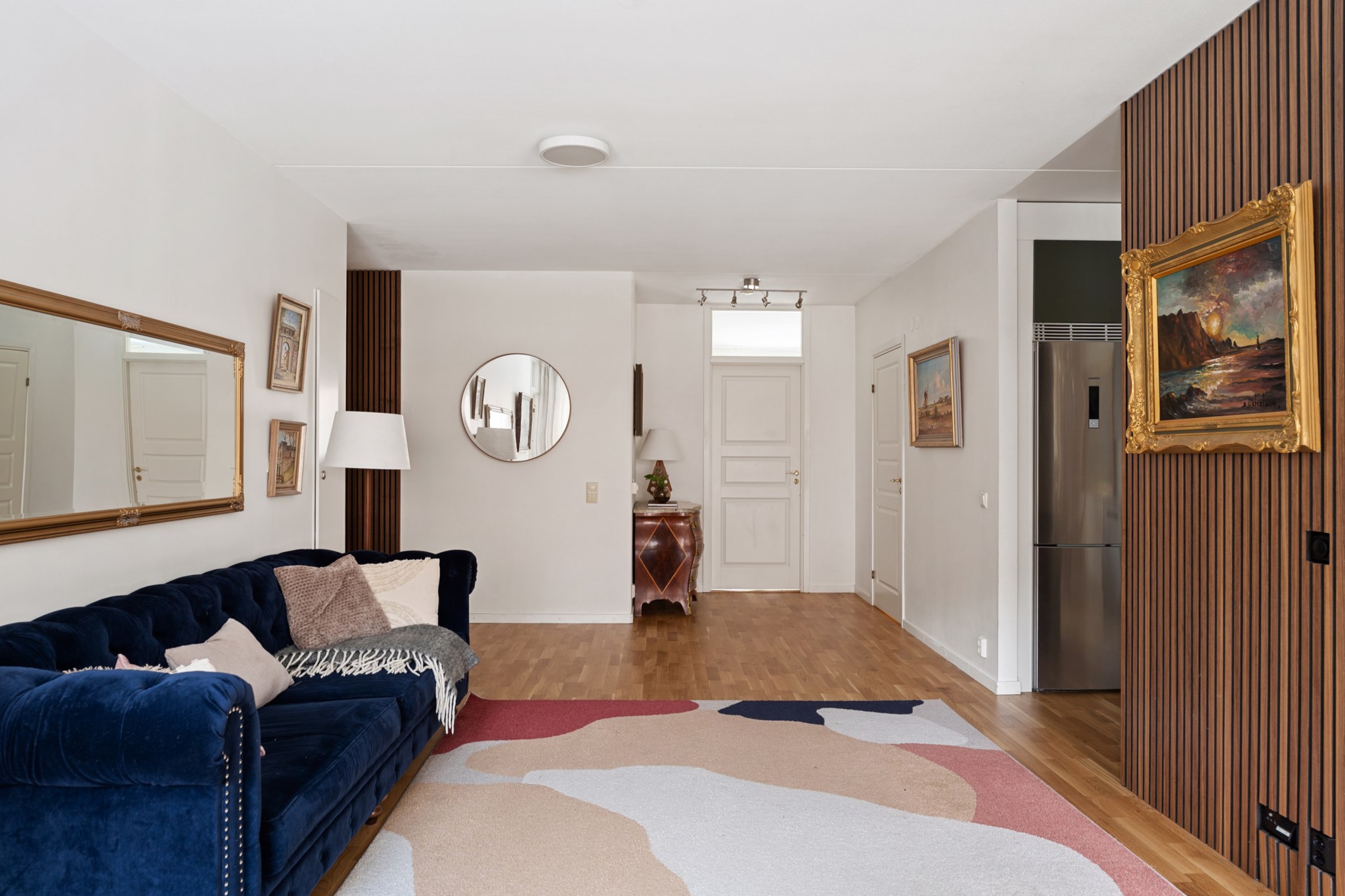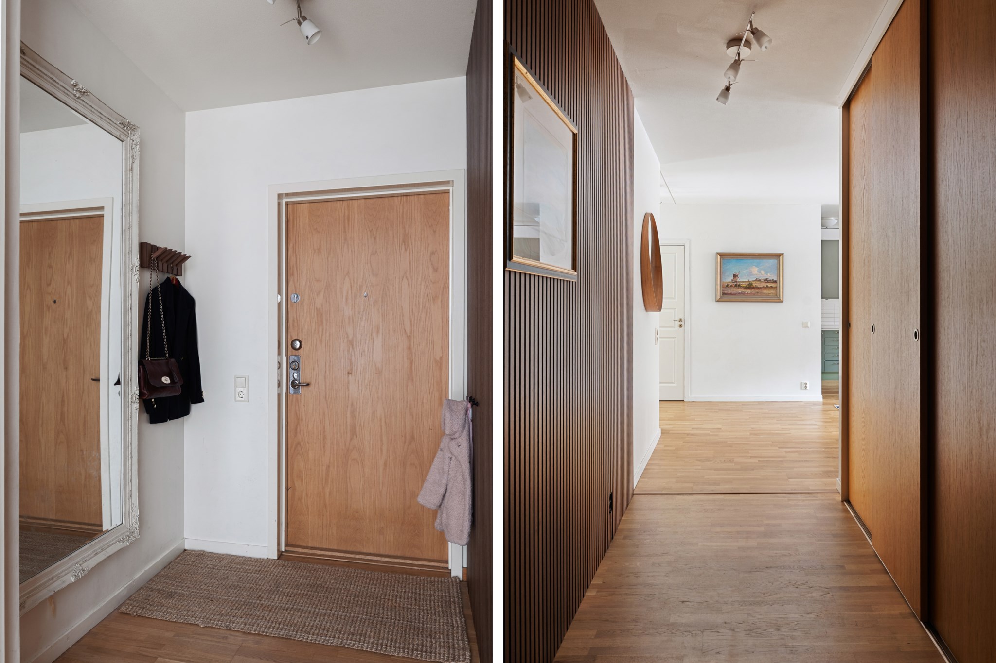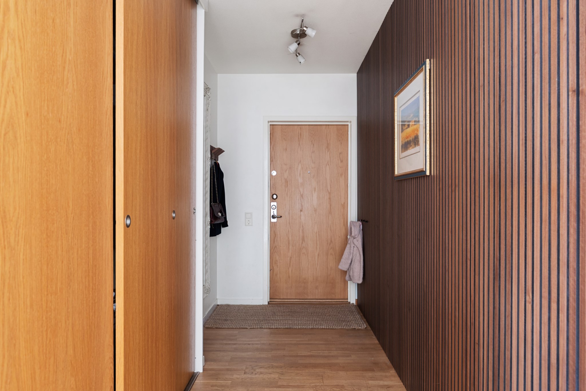 Välkomnande hall med goda avhängningsmöjligheter och garderob som erbjuder utmärkt förvaring. Hallen binder samman bostadens rum på ett praktiskt och lättmöblerat sätt.