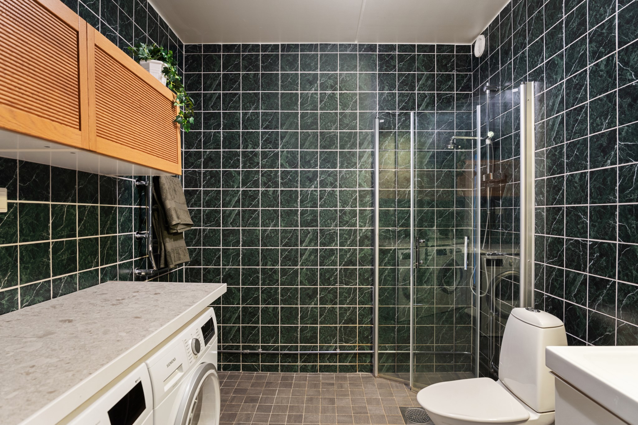 Helkaklat badrum utrustat med WC, dusch och handfat med kommod. Belysning ovanför spegeln ger ett behagligt ljus. Badrummet är även utrustat med tvättmaskin och torktumlare med praktiska överskåp ovanför som erbjuder god förvaring.