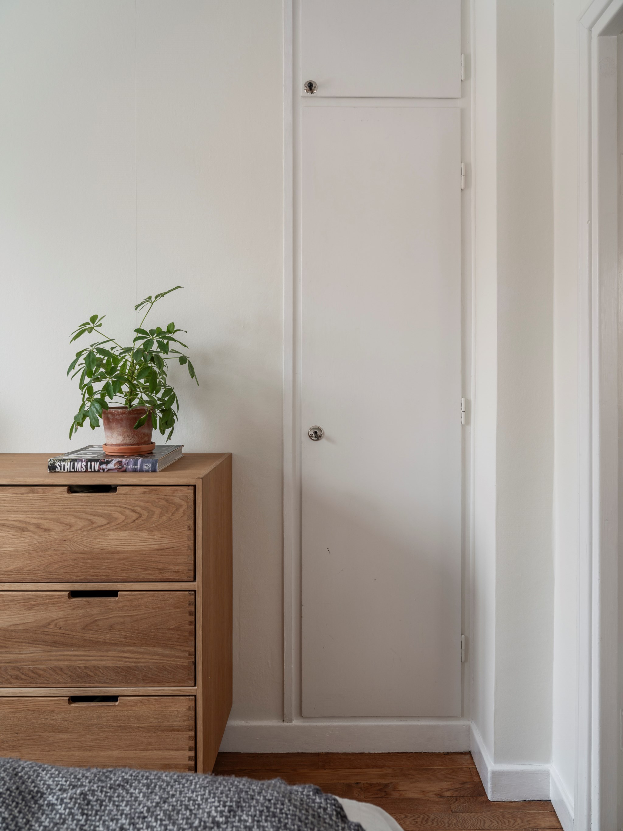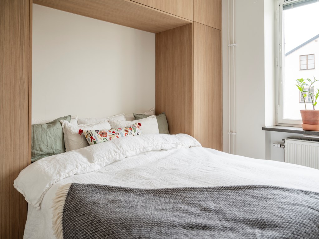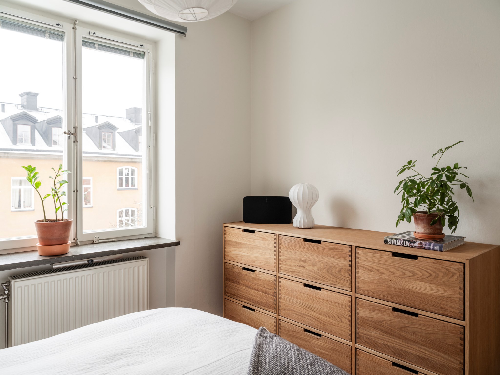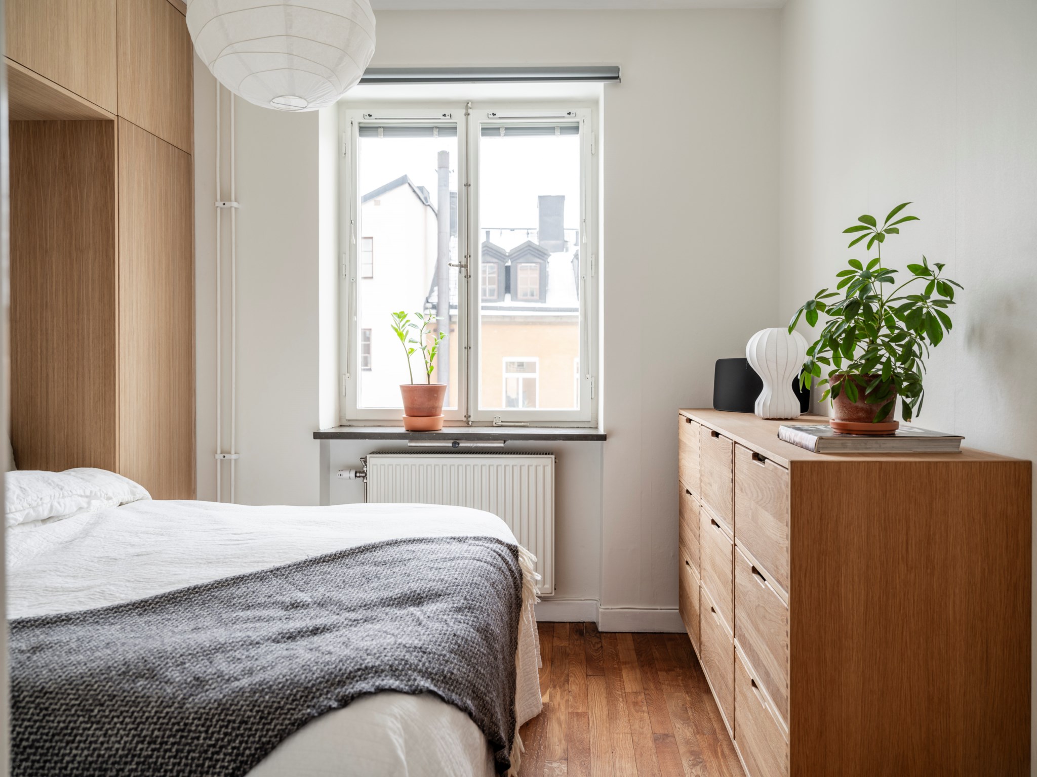 Trivsamt sovrum med fönsterparti mot vackra fastigheter och rofyllda kvarter. Rummet rymmer enkelt en dubbelsäng med nattduksbord och erbjuder utmärkta förvaringslösningar i platsbyggd förvaring runt sängen samt en elegant platsbyggd byrå från ett skånskt finsnickeri i vackert träslag.
