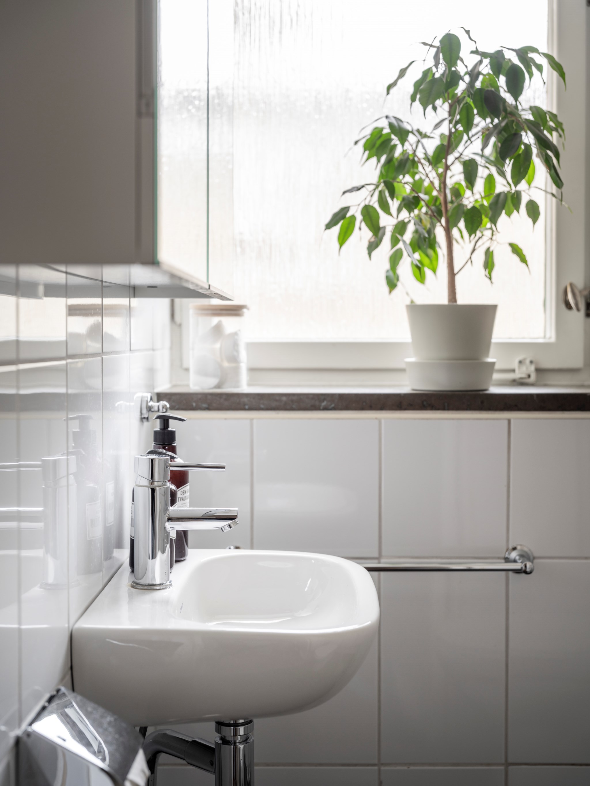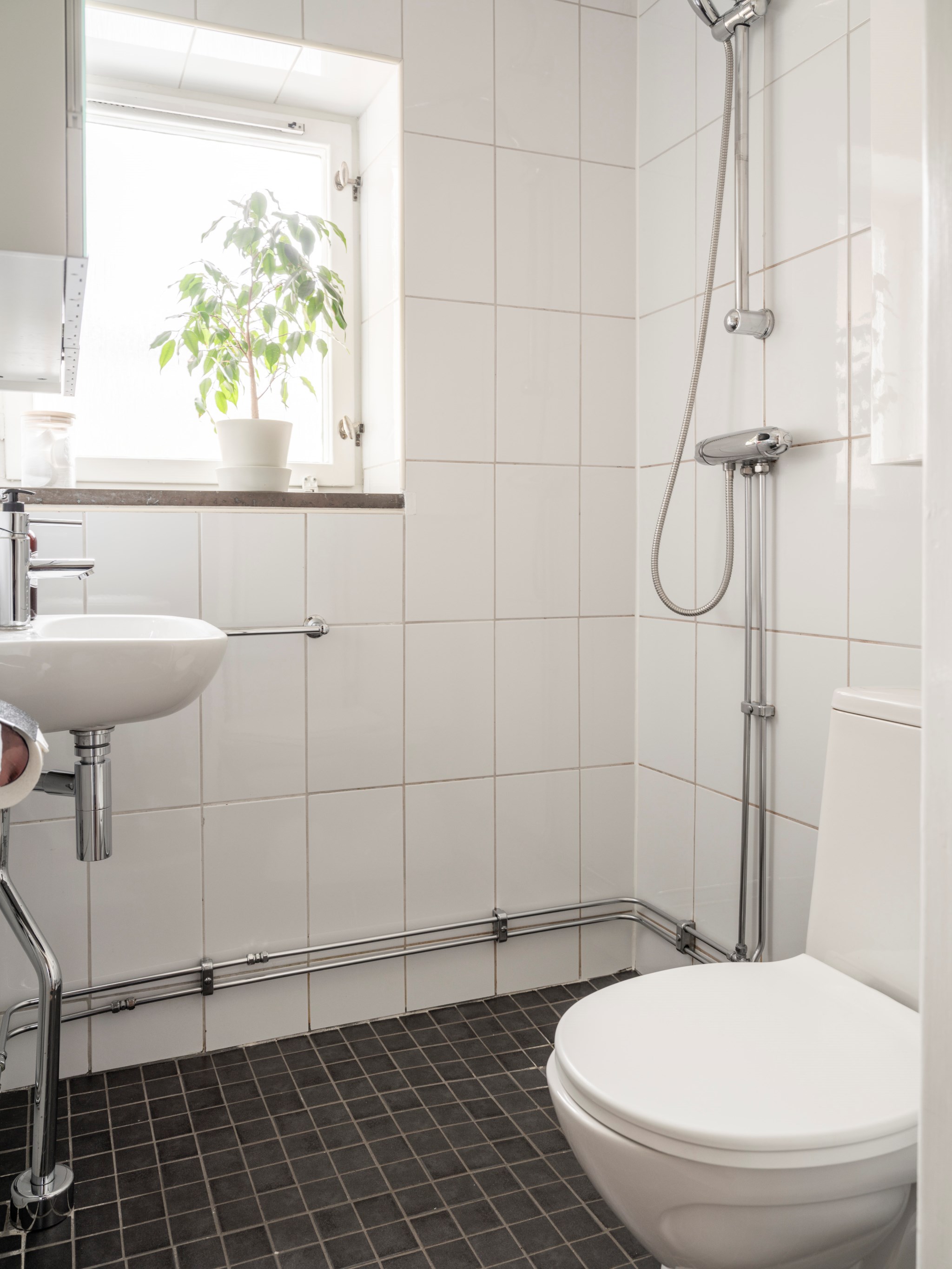 I anslutning till hallen ligger badrummet med fönster. Väggarna är vitkaklade och på golvet ligger grå klinkers. Badrummet är försett med dusch, wc, handfat samt spegelskåp.