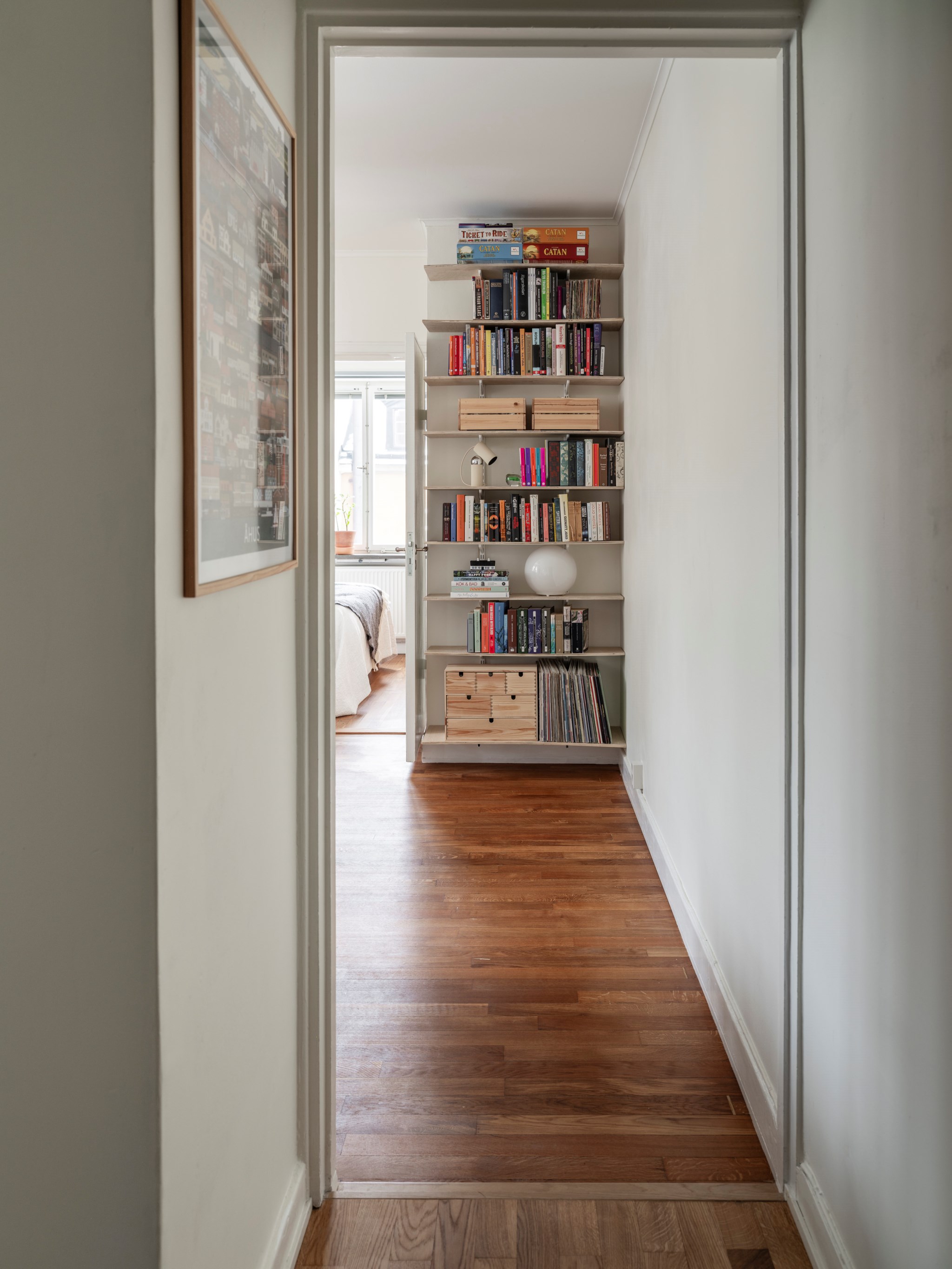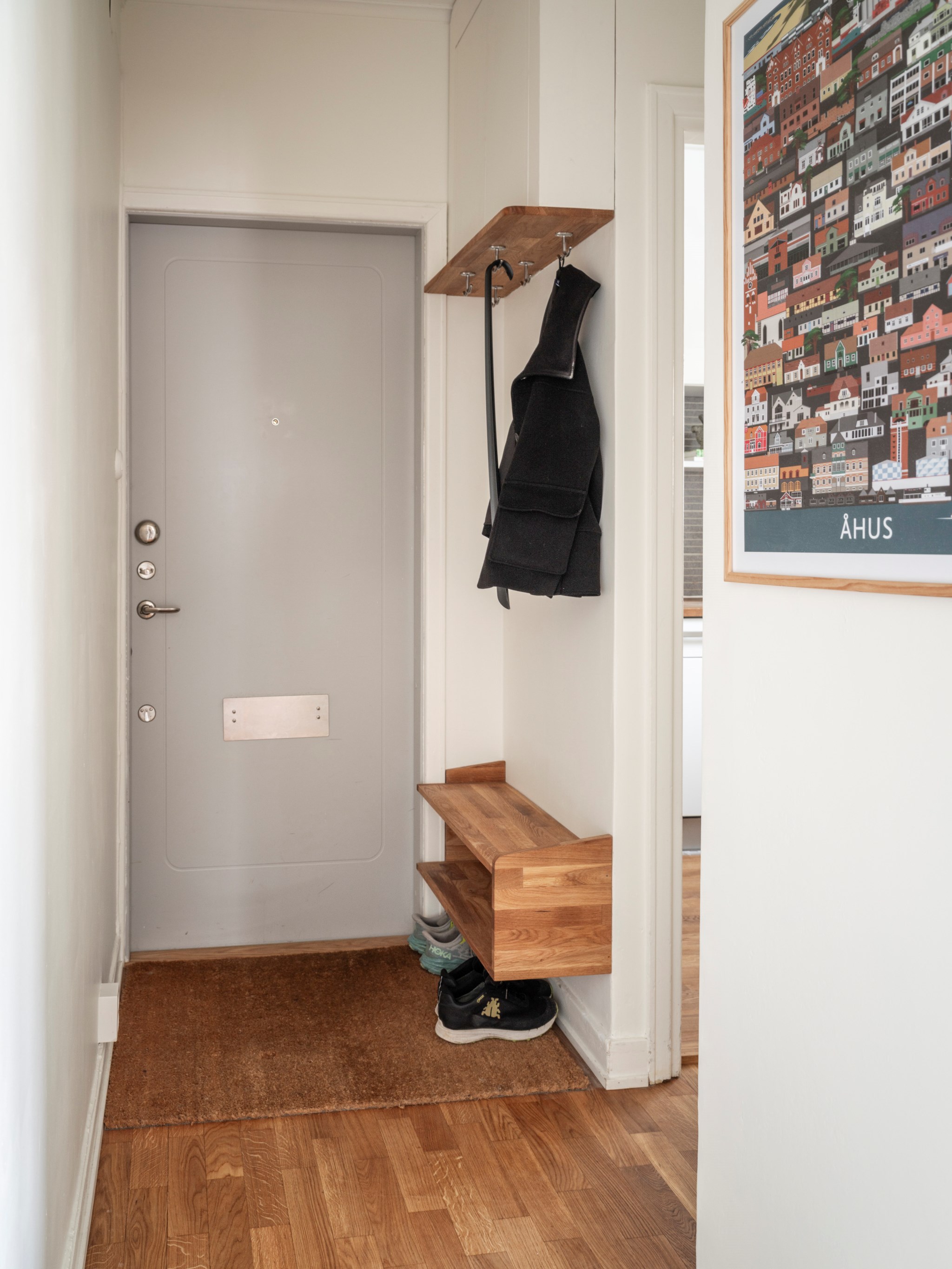 Välkomnande hall med praktisk avhängning på hatthylla och god förvaring i inbyggd orginalgarderob. Parkettgolv ger ett stilrent och enhetligt intryck.