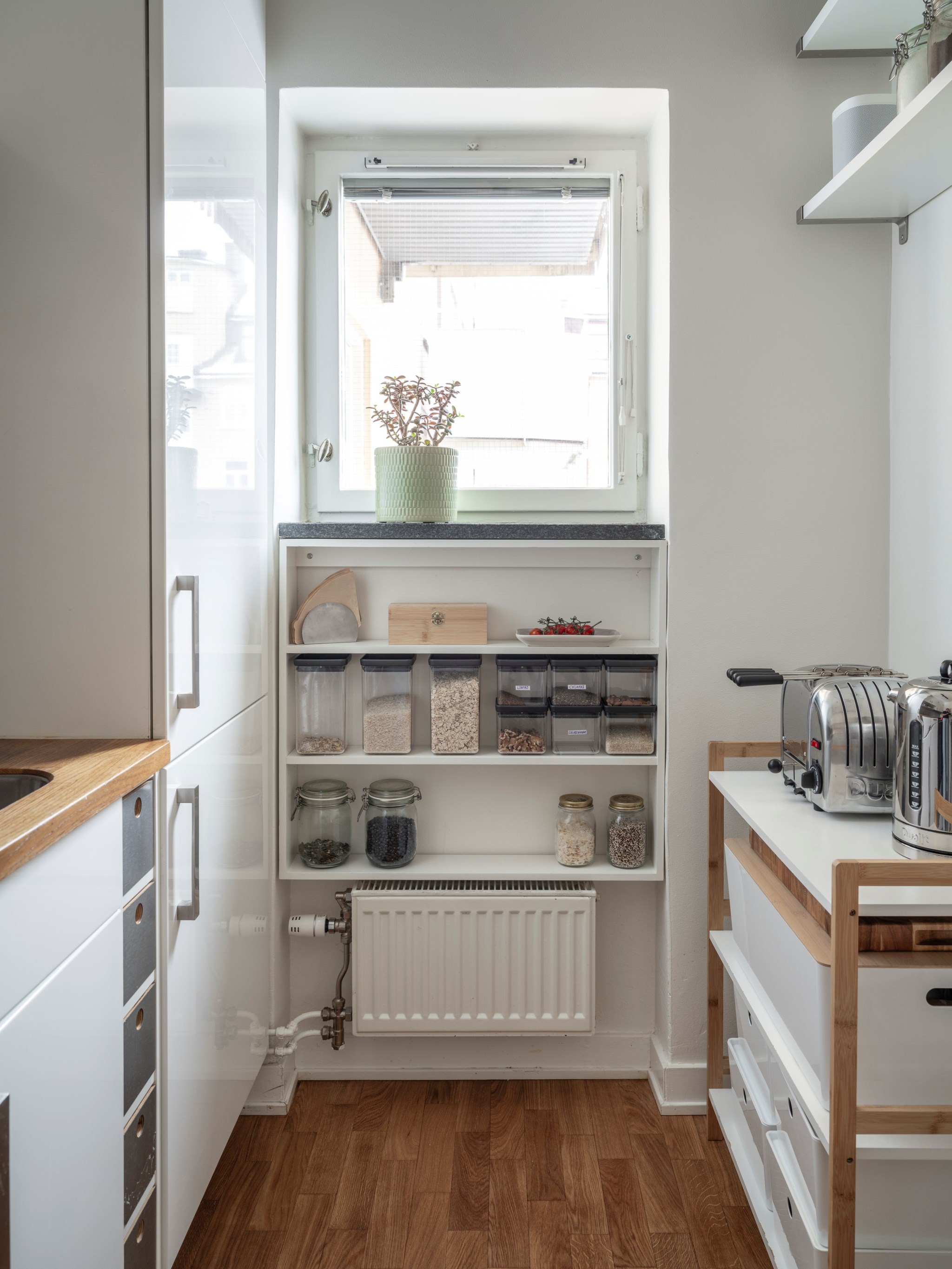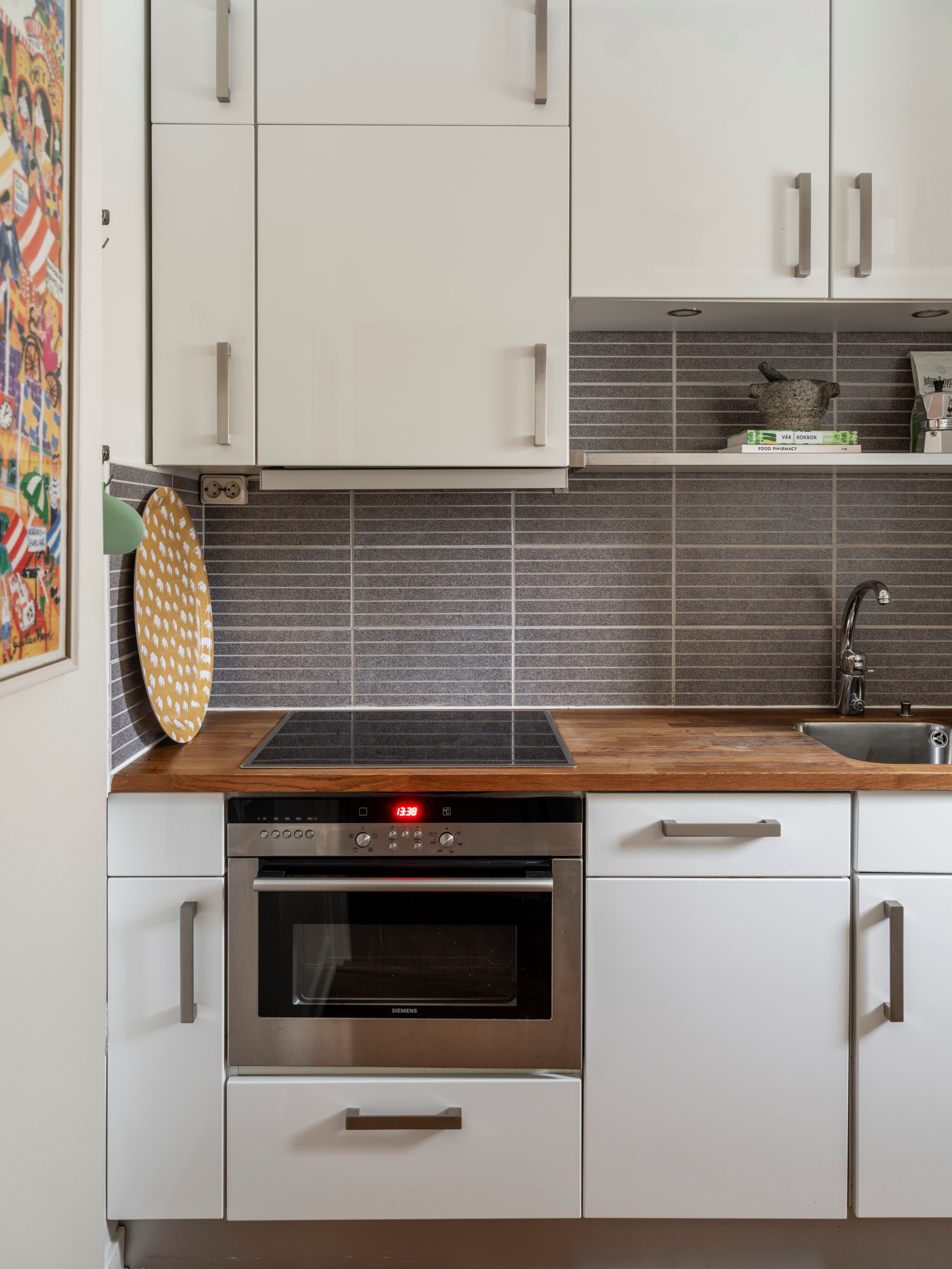 Från hallen nås det välplanerade köket med vita fronter som snyggt bryter av mot arbetsbänken i trä. Tack vare fönstret får man ett fint ljusinsläpp och den djupa fönsterbrädan i sten blir en naturlig avställningsyta. Köket är utrustat med diskmaskin, integrerad kyl/frys, spishäll, kombinerad mikro/ugn samt fläkt.