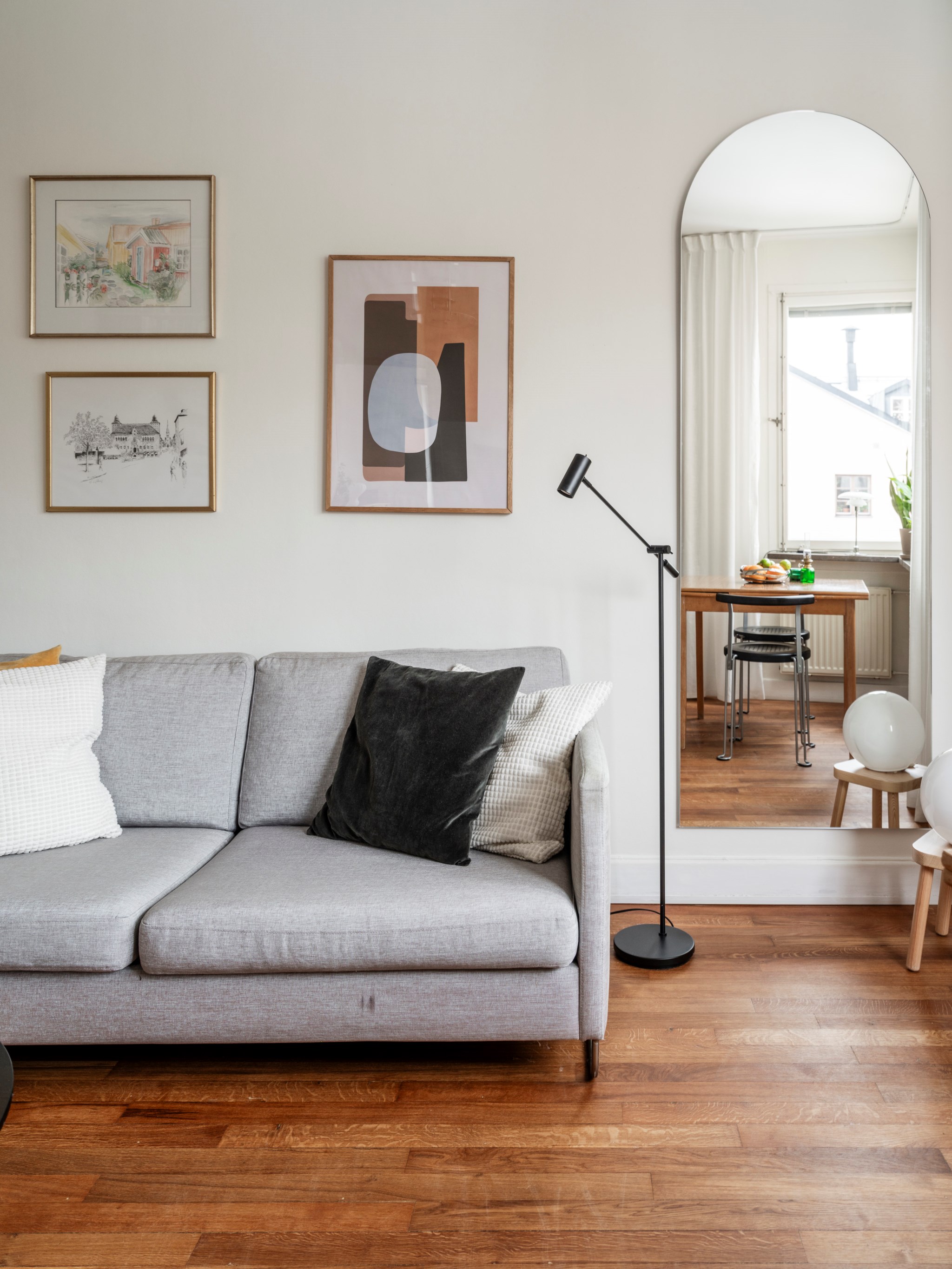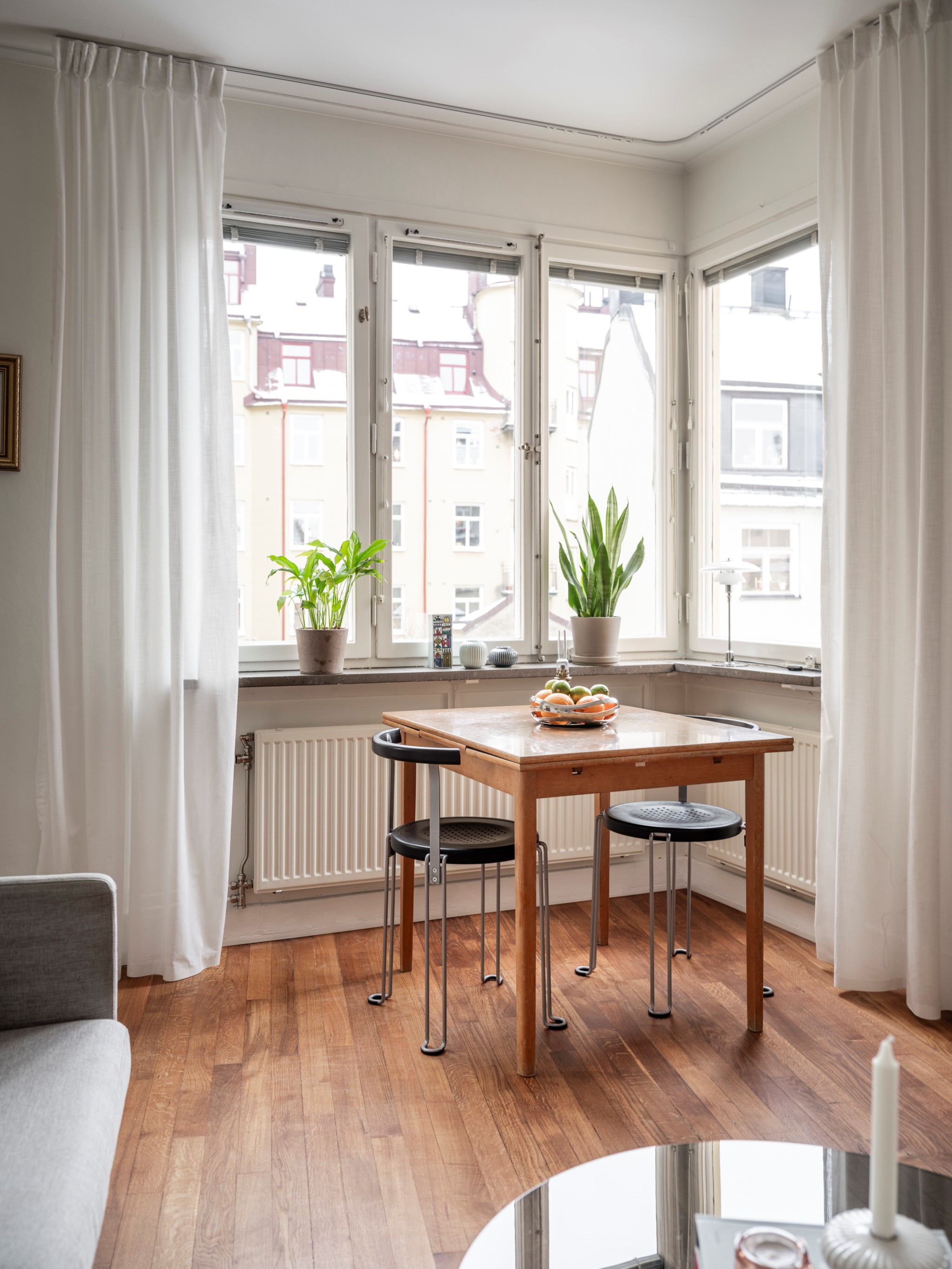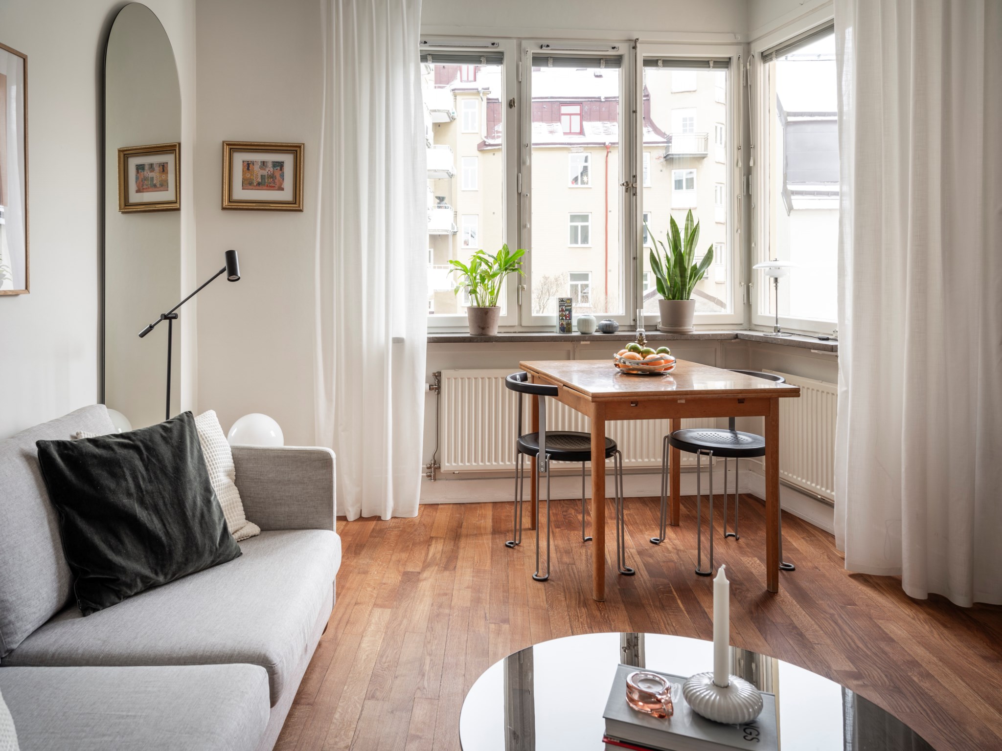 Det ljusa vardagsrummet pryds av ett stort fönsterparti i burspråk. Fönstren vetter mot lugna och, om sommaren, grönskande innergårdar som skapar kvarterets genuina atmosfär. I vardagsrummet möblerar man enkelt med både soffa och matgrupp.
