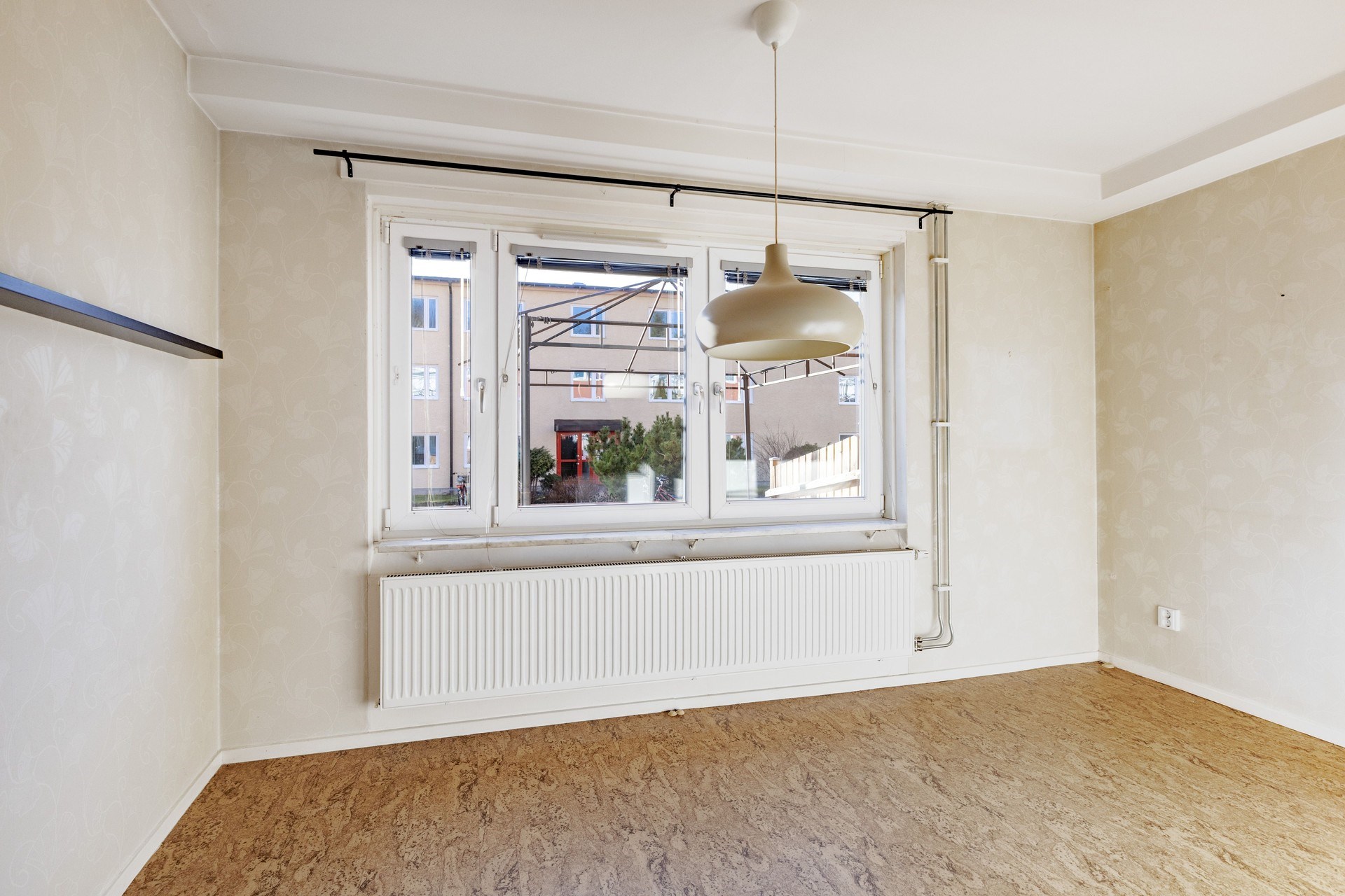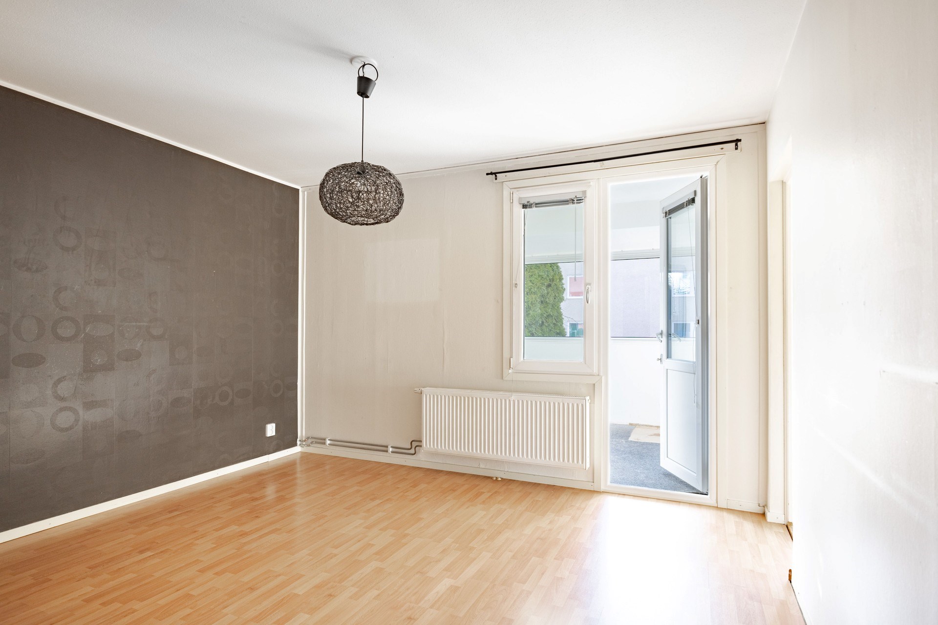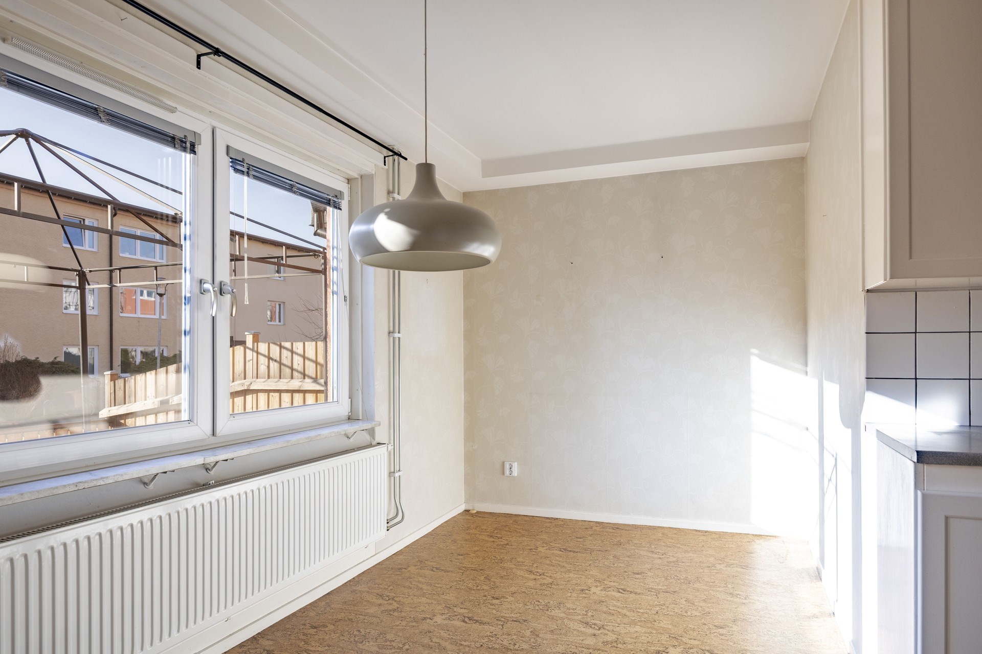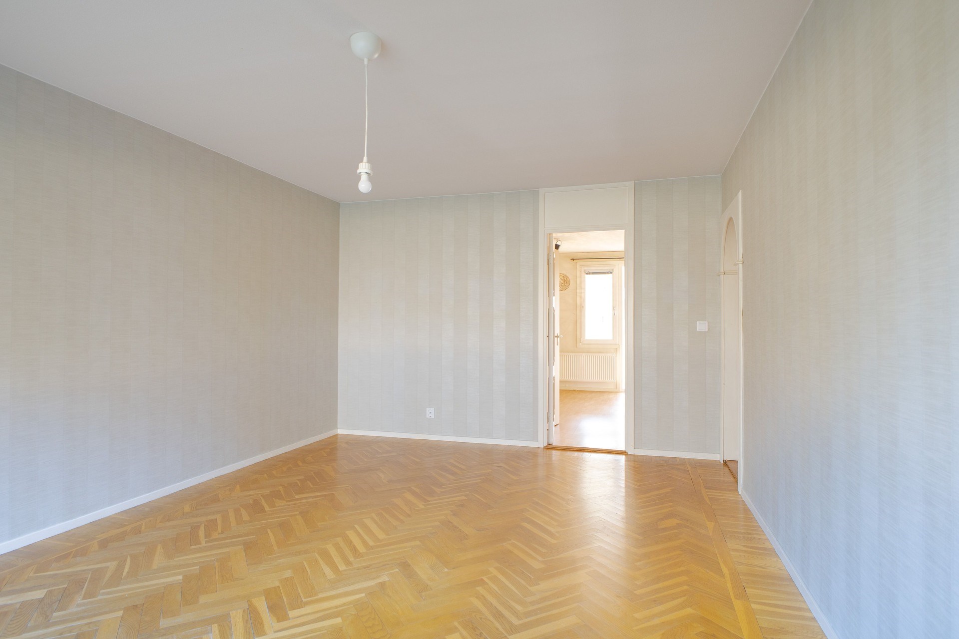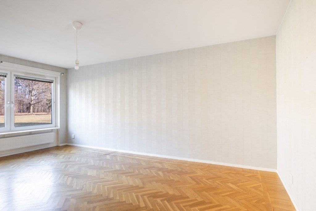 Fiskbensparkett och ljust tapetserade väggar. Generöst ljusinsläpp från stort fönsterparti. Gott om plats till sällskapsyta som rymmer hela familjen både till vardag och fest.