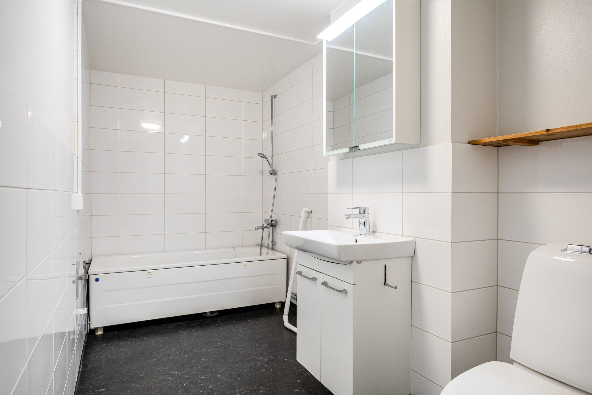 Renoverat badrum 2022 med mörk våtrumsmatta och ljust kaklade väggar. Wc, kommod, badrumsskåp med spegeldörrar samt badkar. Plats för tvättmaskin.