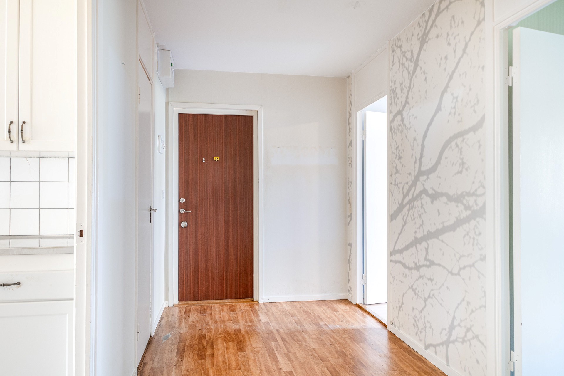 Välkomnande hall med gott om plats till förvaring av ytterkläder och skor.