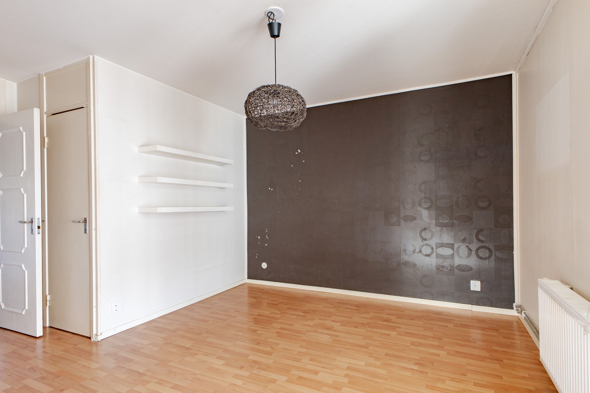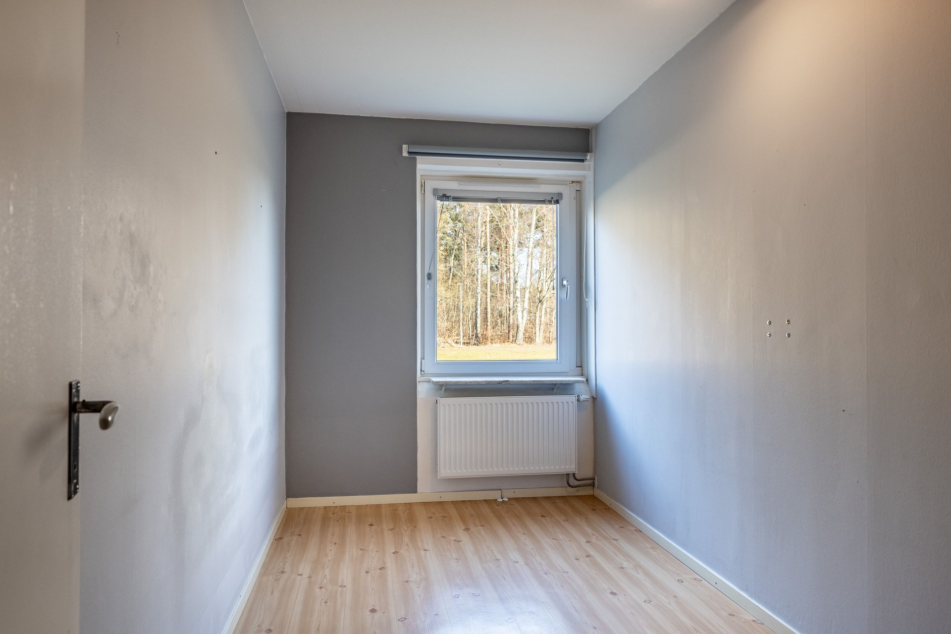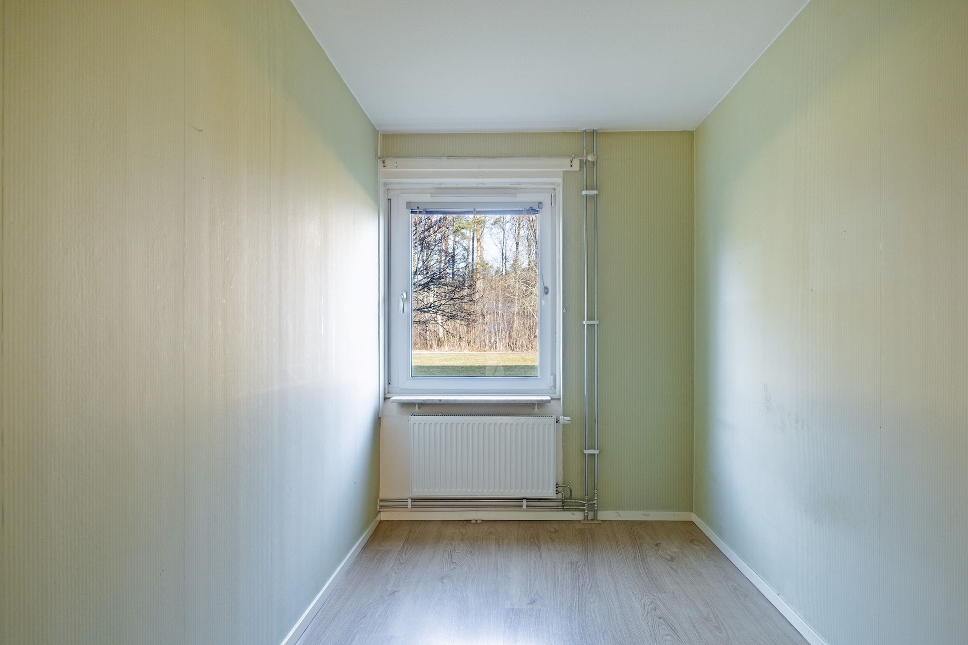 Plastmatta på golv och målade väggar. Plats till säng, sängbord och förvaring.