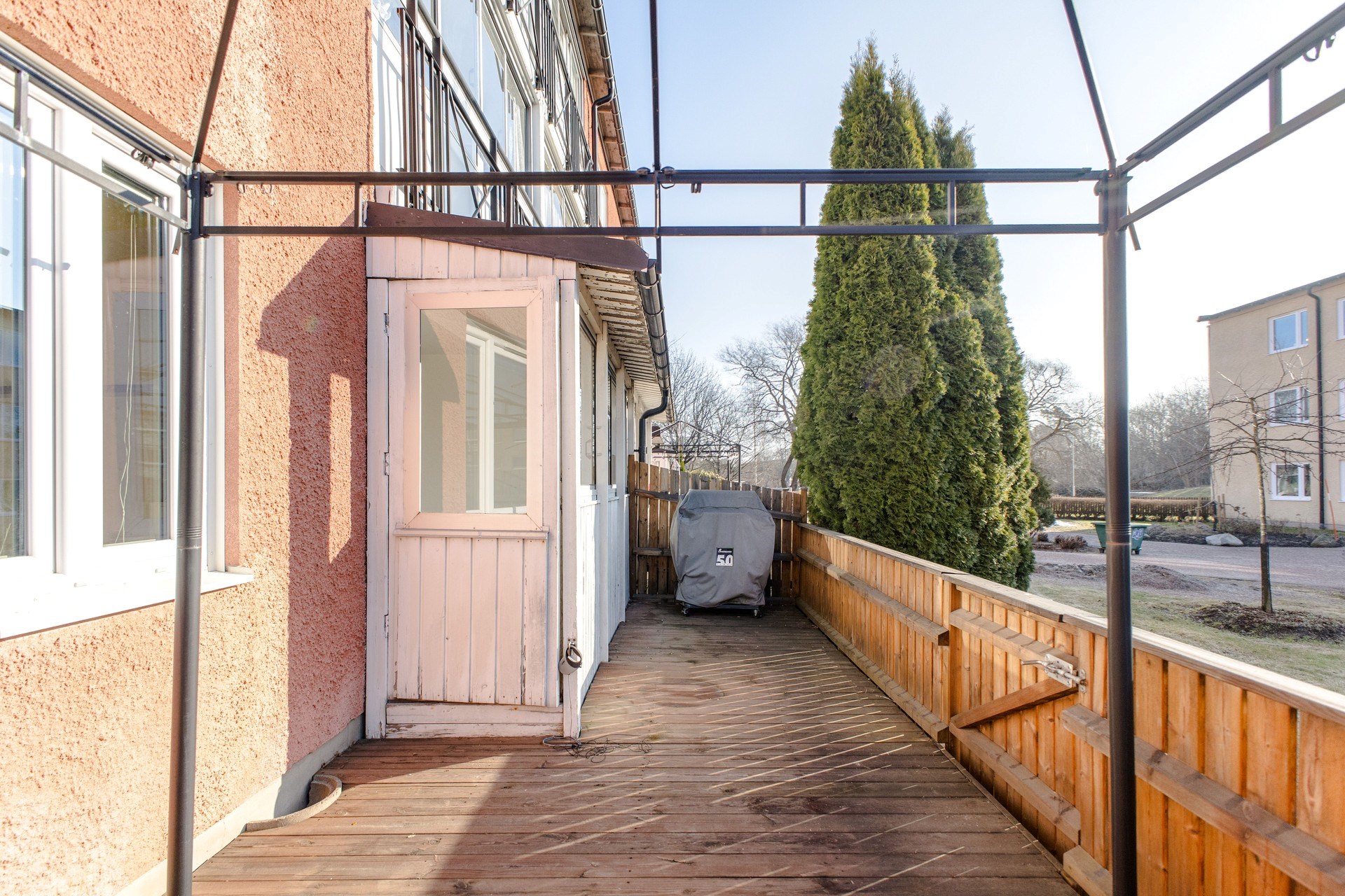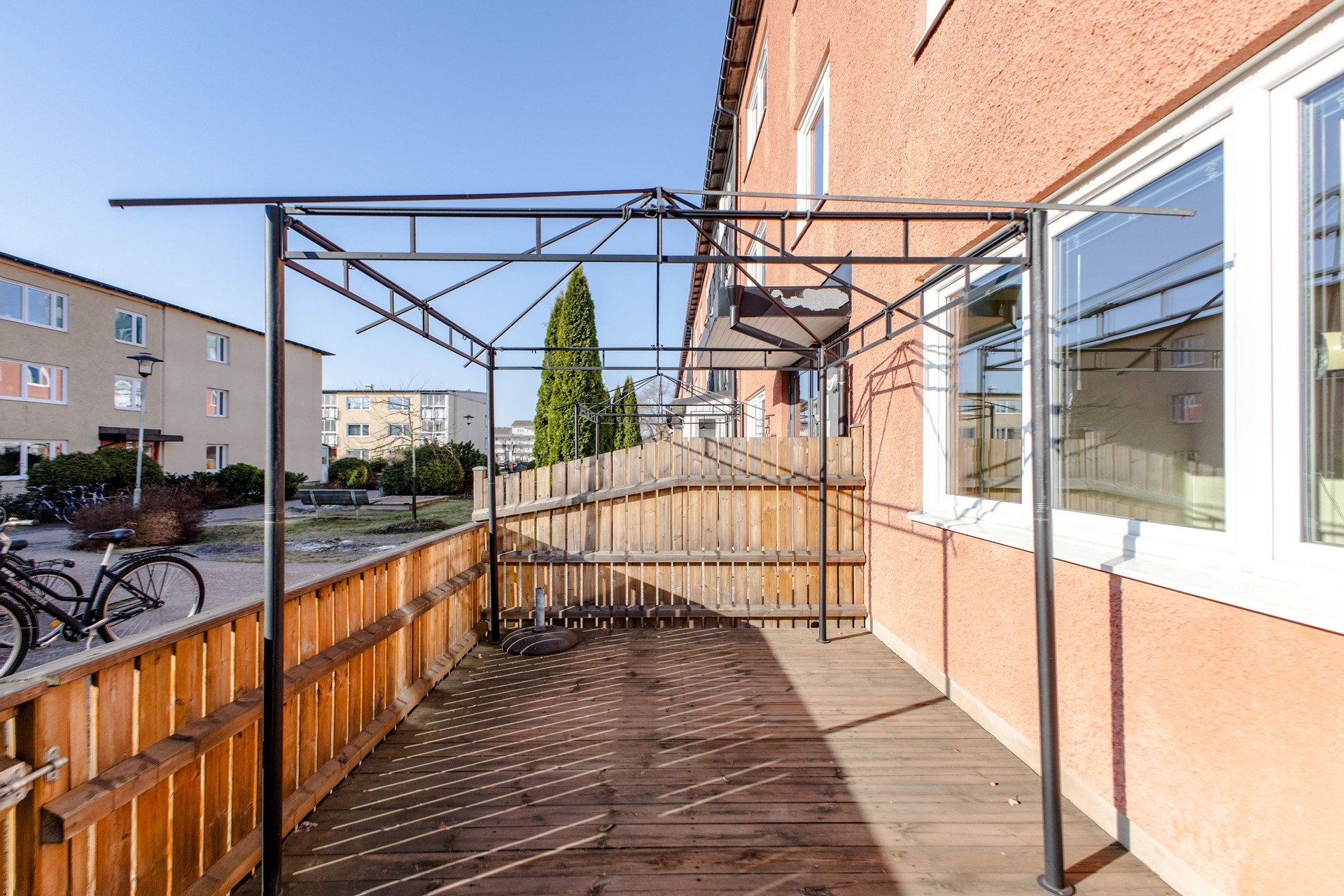 Uterum och uteplats i söderläge med trätrall och staket. Här grillar ni sommartid och söker skugga under pergolan när solen är som starkast.