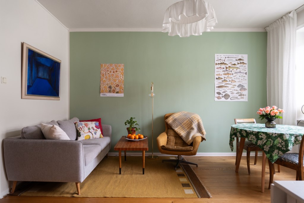 Ljust och rymligt vardagsrum med parkettgolv och ljusa väggar, varav en vägg är målad i mild grön ton som skapar karaktär. Rummet har stora fönsterpartier som ger generöst ljusinsläpp samt utgång till balkong. Här ryms soffgrupp, soffbord, fåtölj, bokhyllor, skrivbord samt matplats, vilket visar rummets goda storlek och flexibla möbleringsmöjligheter.
