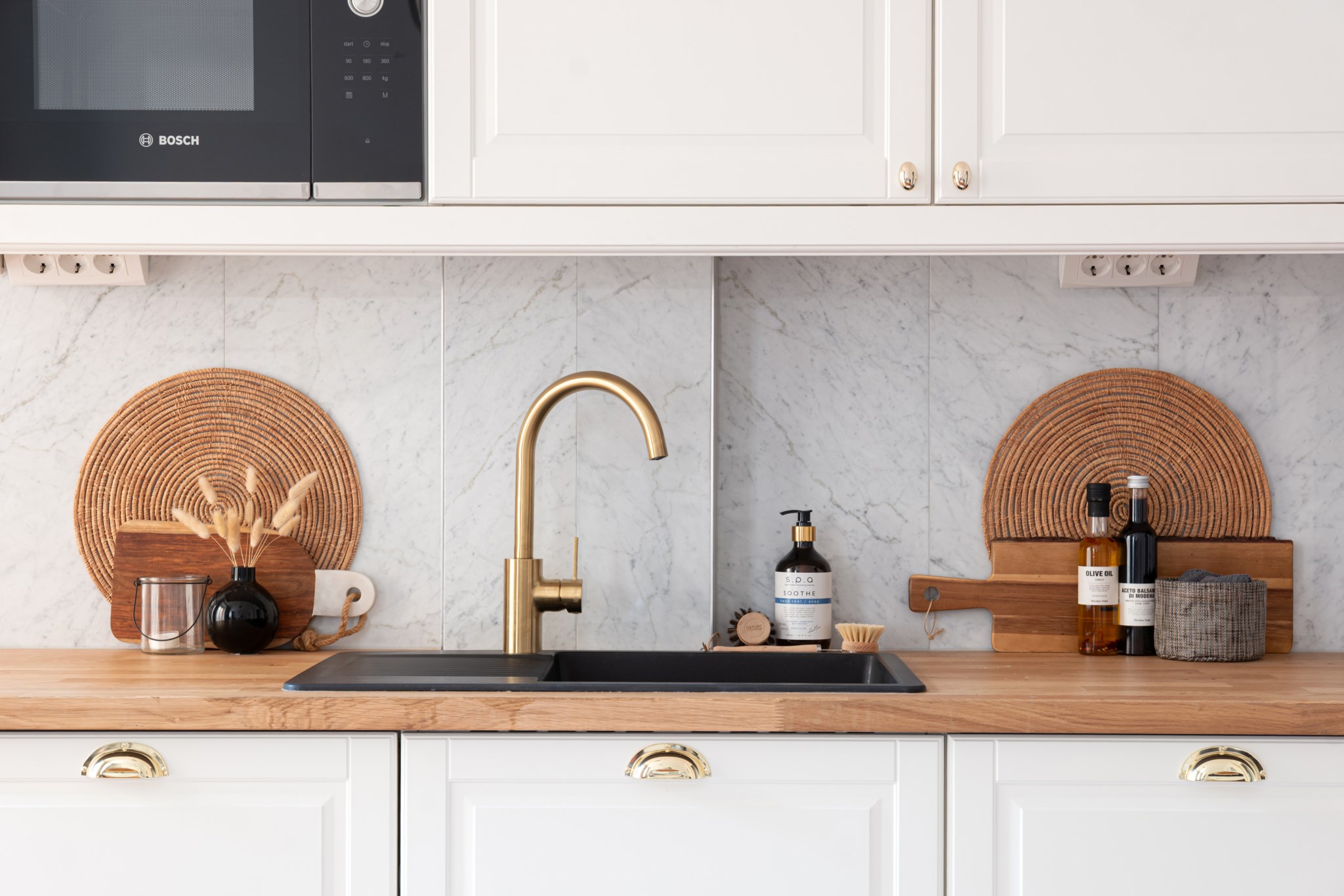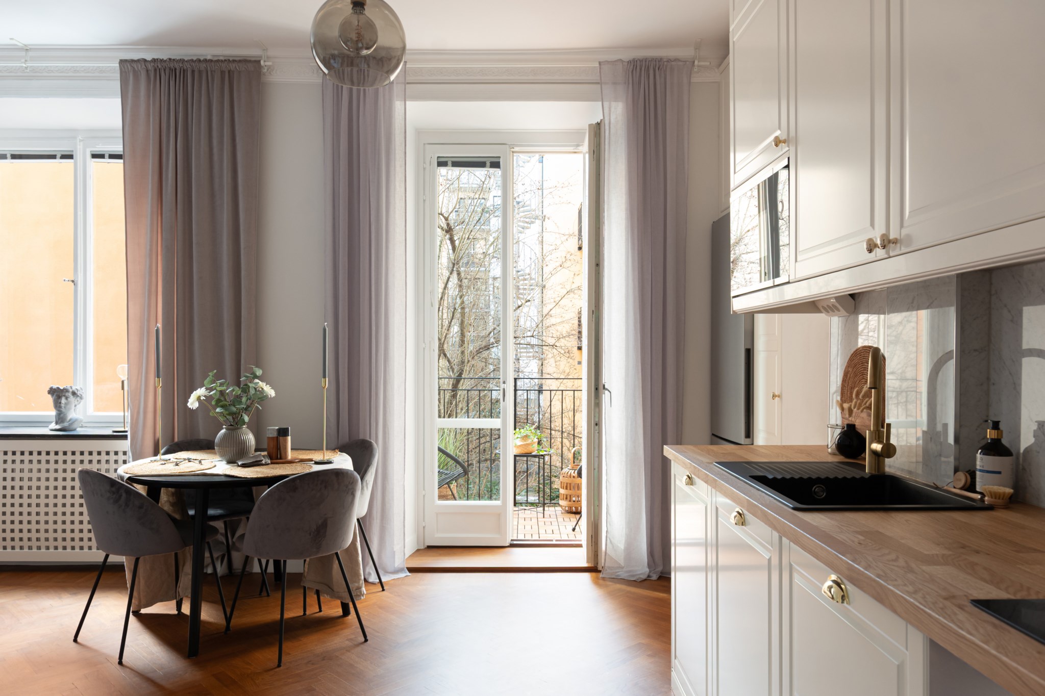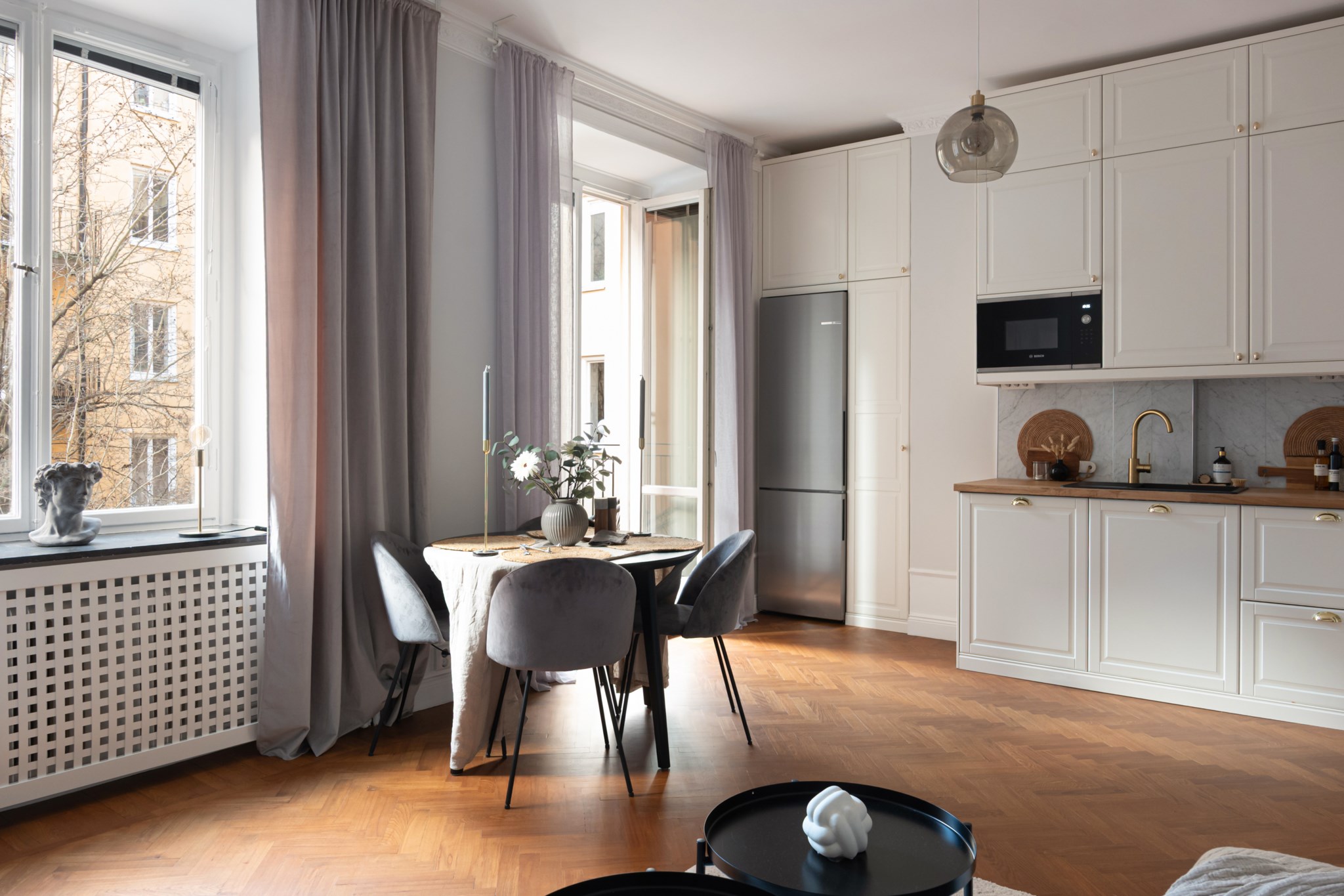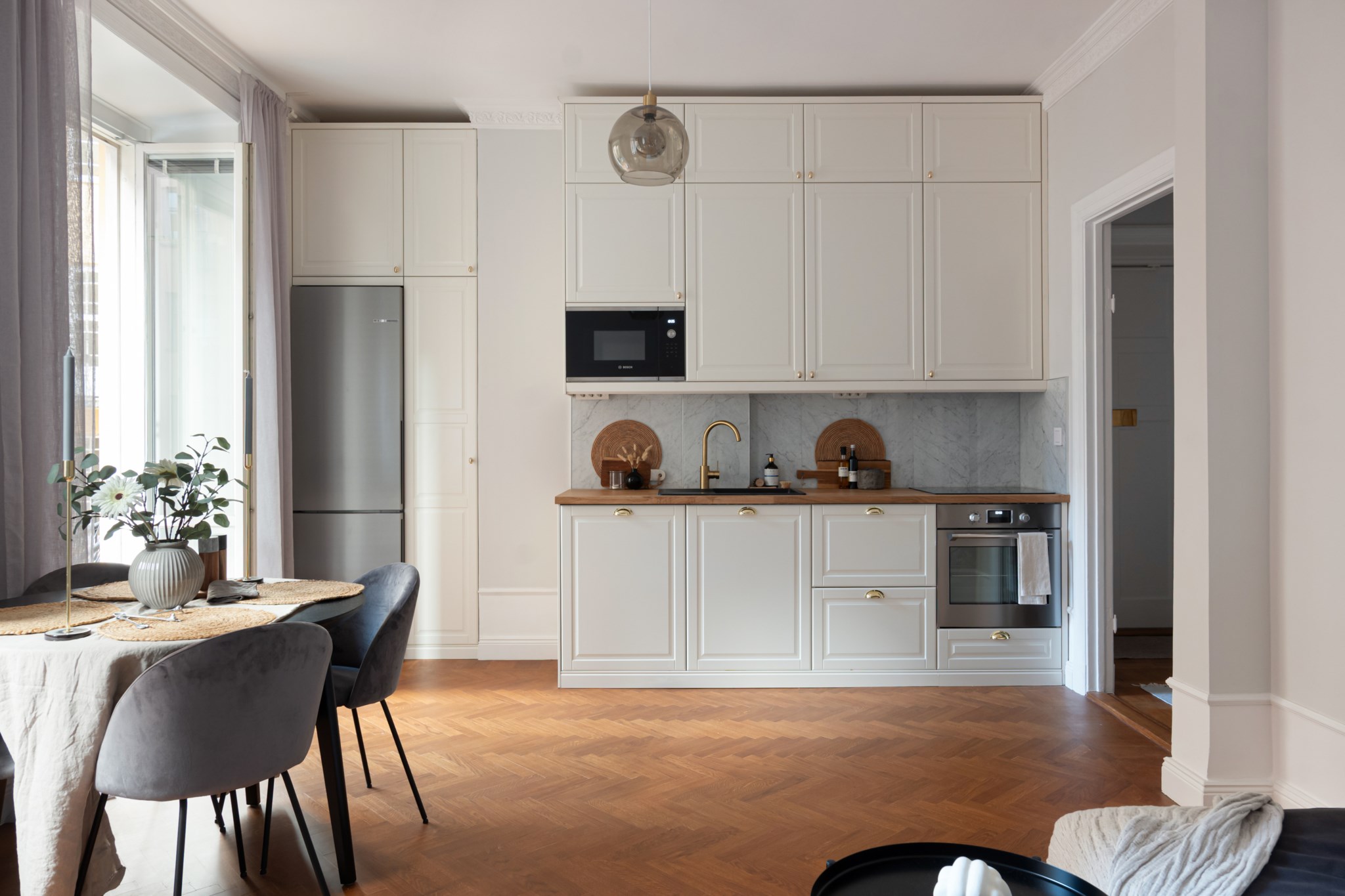 Smakfulla och moderna materialval bestående av köksluckor i vitt, handtag och blandare i mässing och en bänkskiva i trä. Köket är utrustat med diskho, induktionshäll, köksfläkt, ugn, mikro, diskmaskin samt kyl och frys. Ytskikten består av ljusa väggar i en grå nyans och fiskbensparkett. Här finns även plats för en matgrupp. Ett härligt ljusinsläpp tar sig in via stort fönster. Taket pryds av vackra stuckaturer.