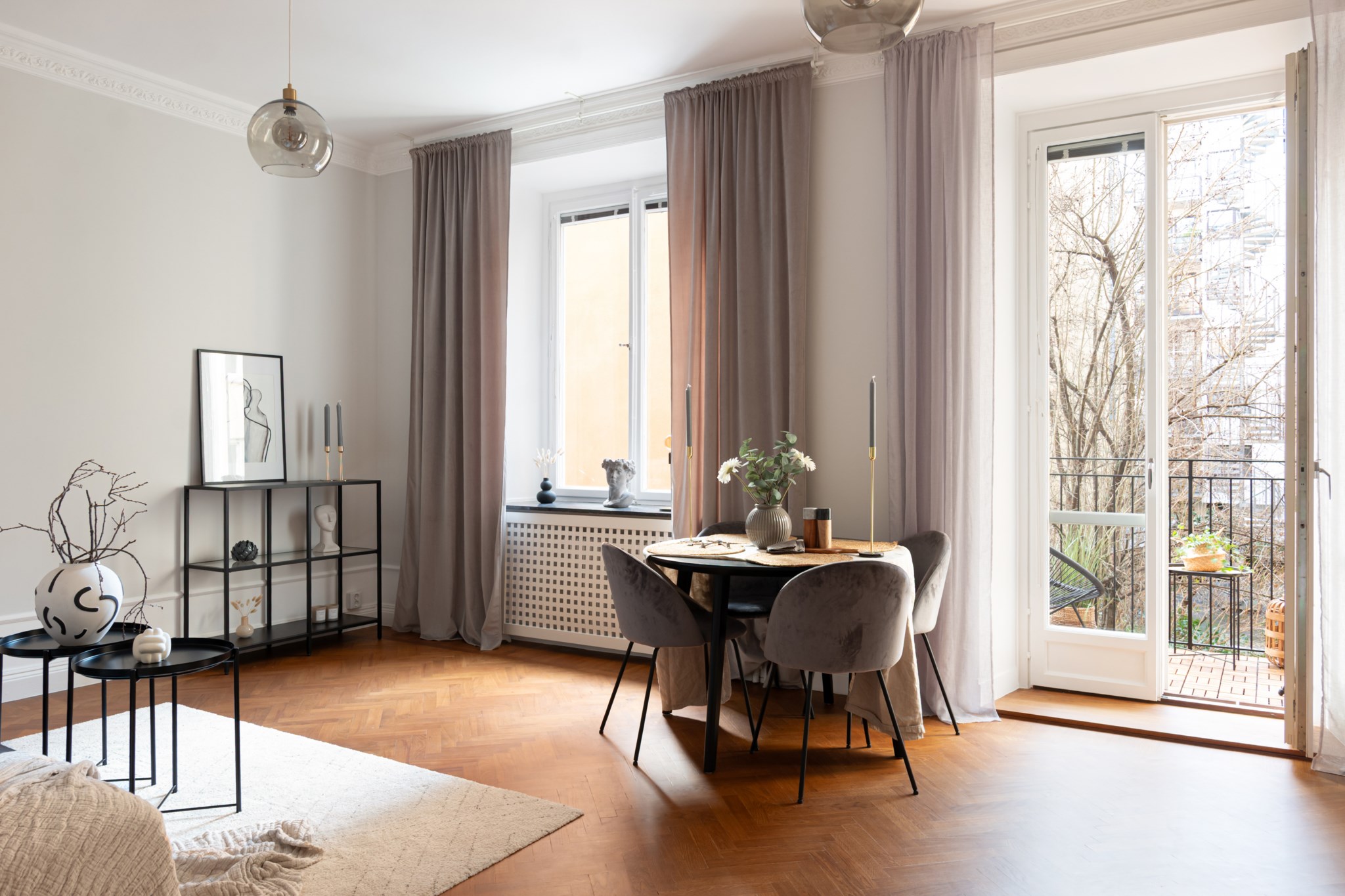 Luftigt vardagsrum med plats för matplats, soffa, soffbord, och annat möblemang efter smak och behov. Ytskikten består av ljusa väggar i en grå nyans och fiskbensparkett. Ett härligt ljusinsläpp tar sig in via stort fönster. Taket pryds av vackra stuckaturer.