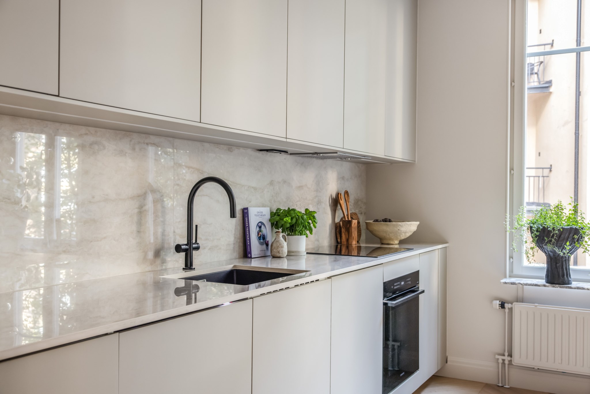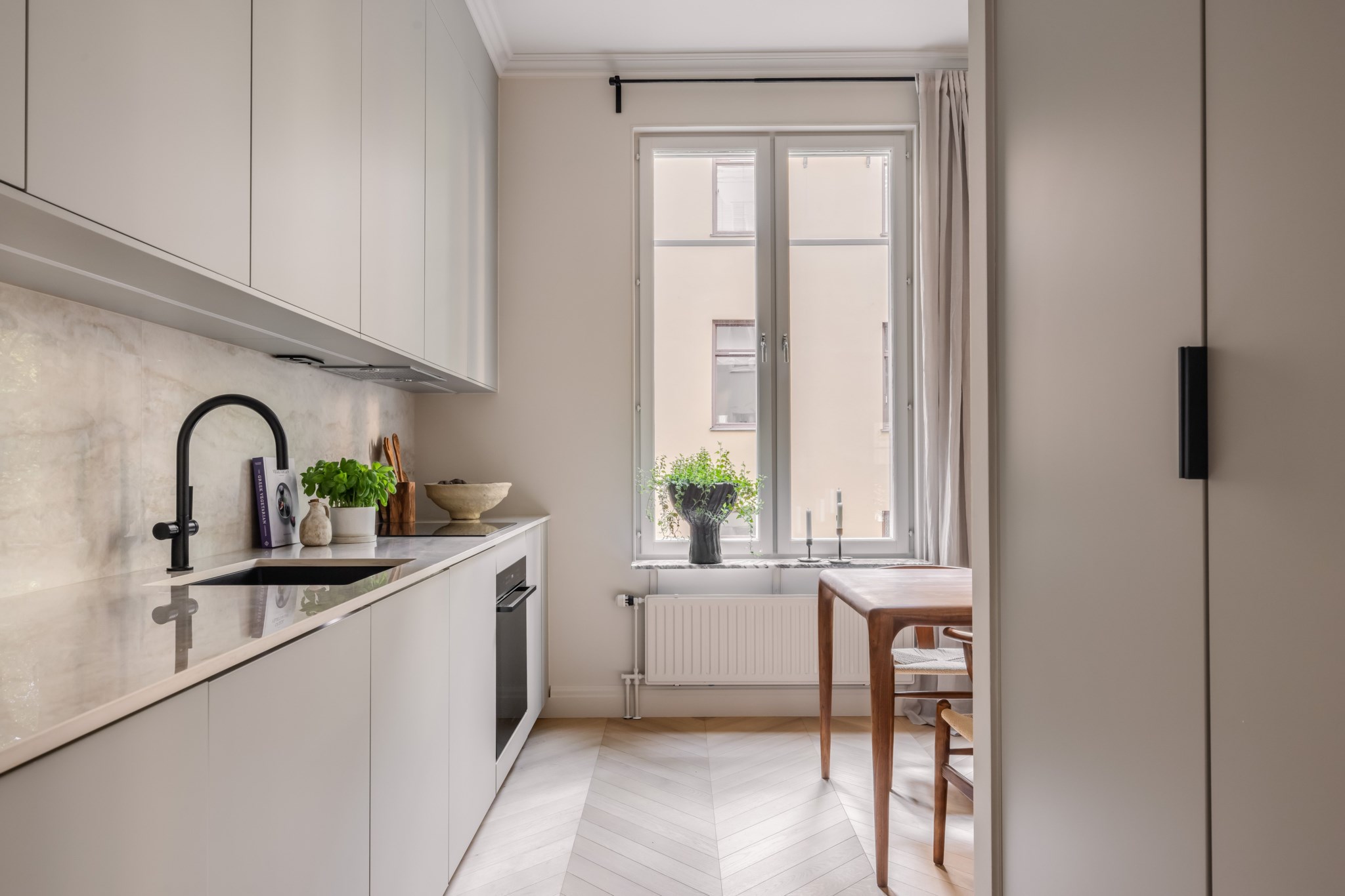 Lyxigt kök med full maskinell utrustning, gott om arbetsyta samt extremt bra förvaringsmöjligheter. Den sociala planlösningen mellan kök och vardagsrum skapar en hemtrevlig atmosfär, där vardagsrummet blir den naturliga samlingsplatsen oavsett om det nalkas hemmakvällar med familjen eller middagsbjudningar med stora släkten. Är ni på jakt efter en ljus familjebostad i toppskick, då har ni hittat rätt! Denna spatiösa bostad är belägen i en lugn oas i Vasastan.