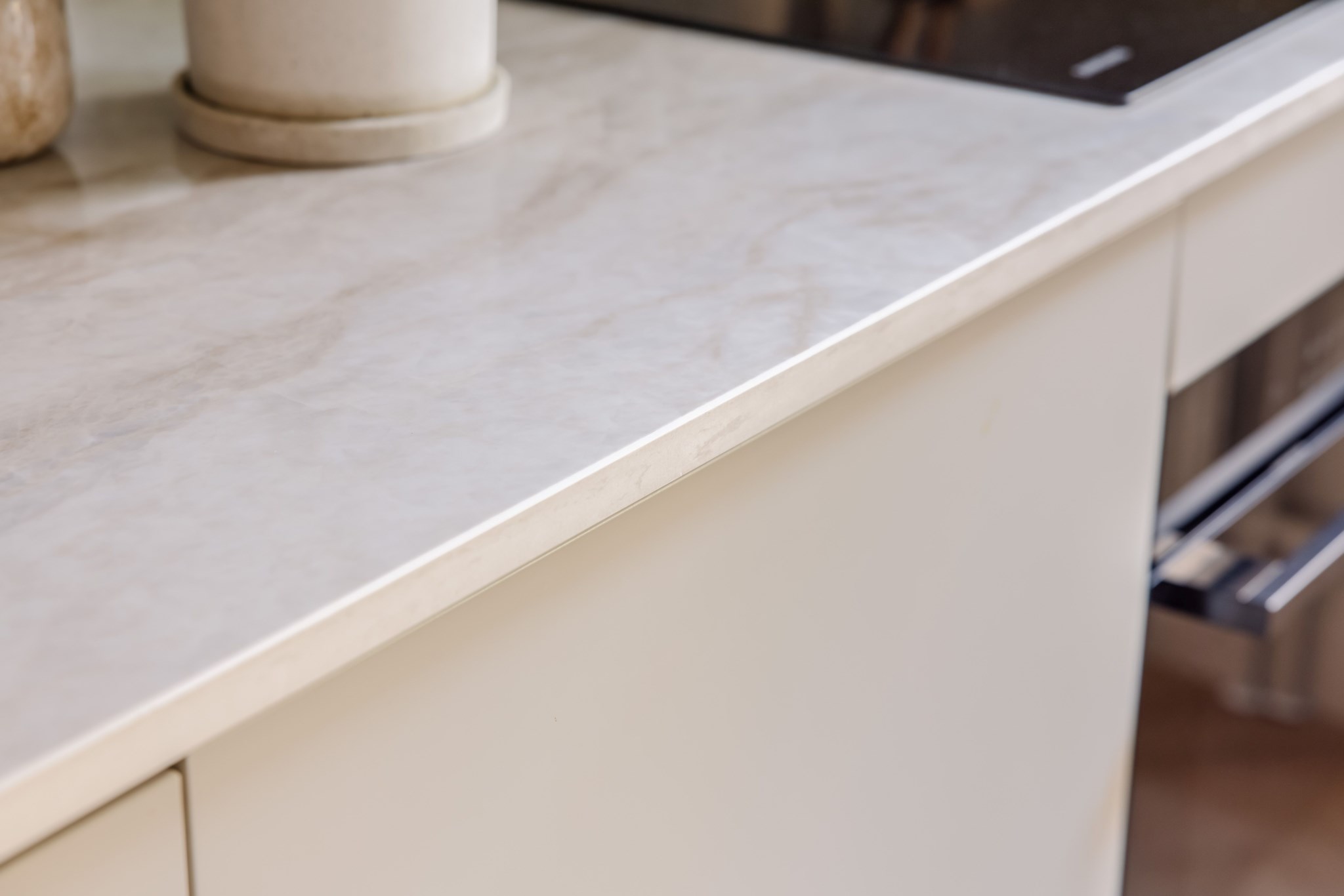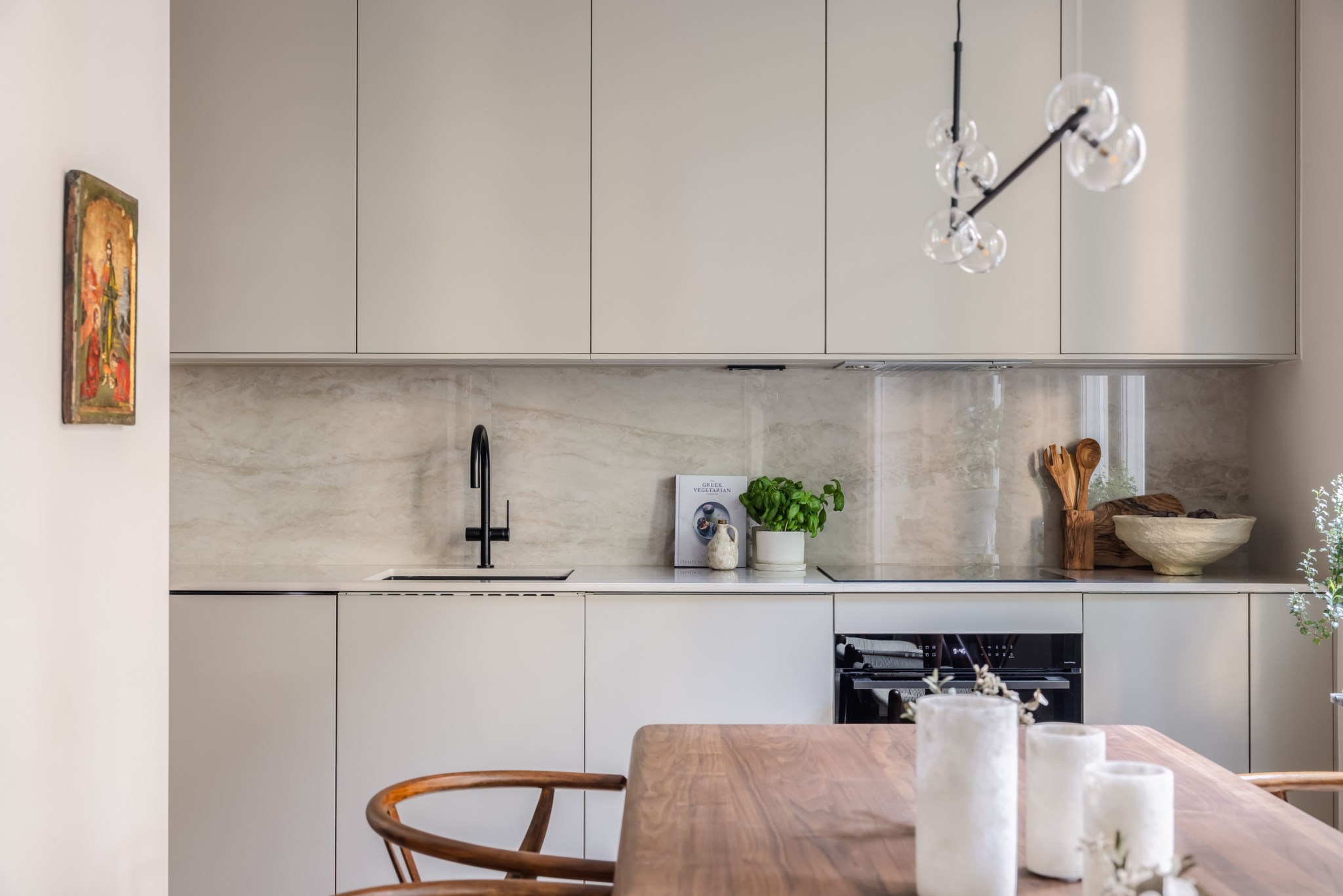 Modernt kök med tidlösa materialval. Förvaring bakom köksluckor i beige nyans och arbetsyta ovan ljus bänkskiva. Köket är socialt placerat med öppning mot vardagsrum. Här finns plats för matgrupp om 6 personer intill stort fönsterparti. Den maskinella utrustningen består av spis, fläkt, ugn, diskho, diskmaskin samt kyl och frys.