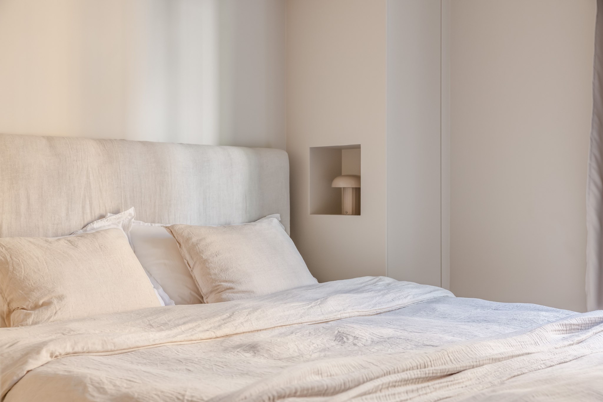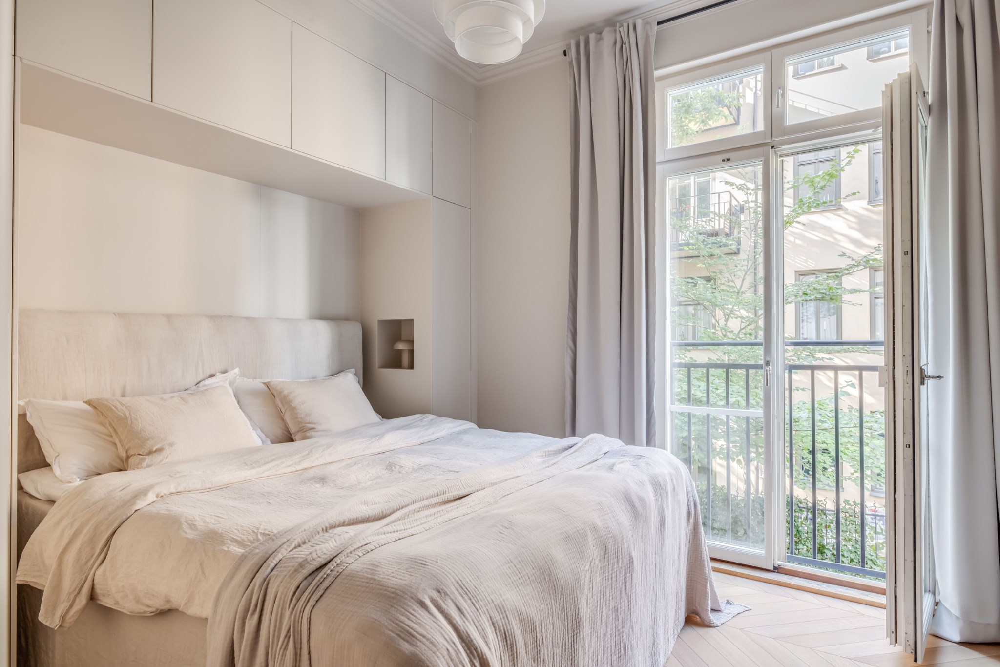 Stort sovrum med tidlösa ytskikt bestående av fiskbensparkett och väggar i beige nyans. Praktisk förvaring via platsbyggda skåp och garderob. Här finns plats för fullstor säng och annat möblemang efter smak och behov. Från sovrummet nås den franska balkongen.