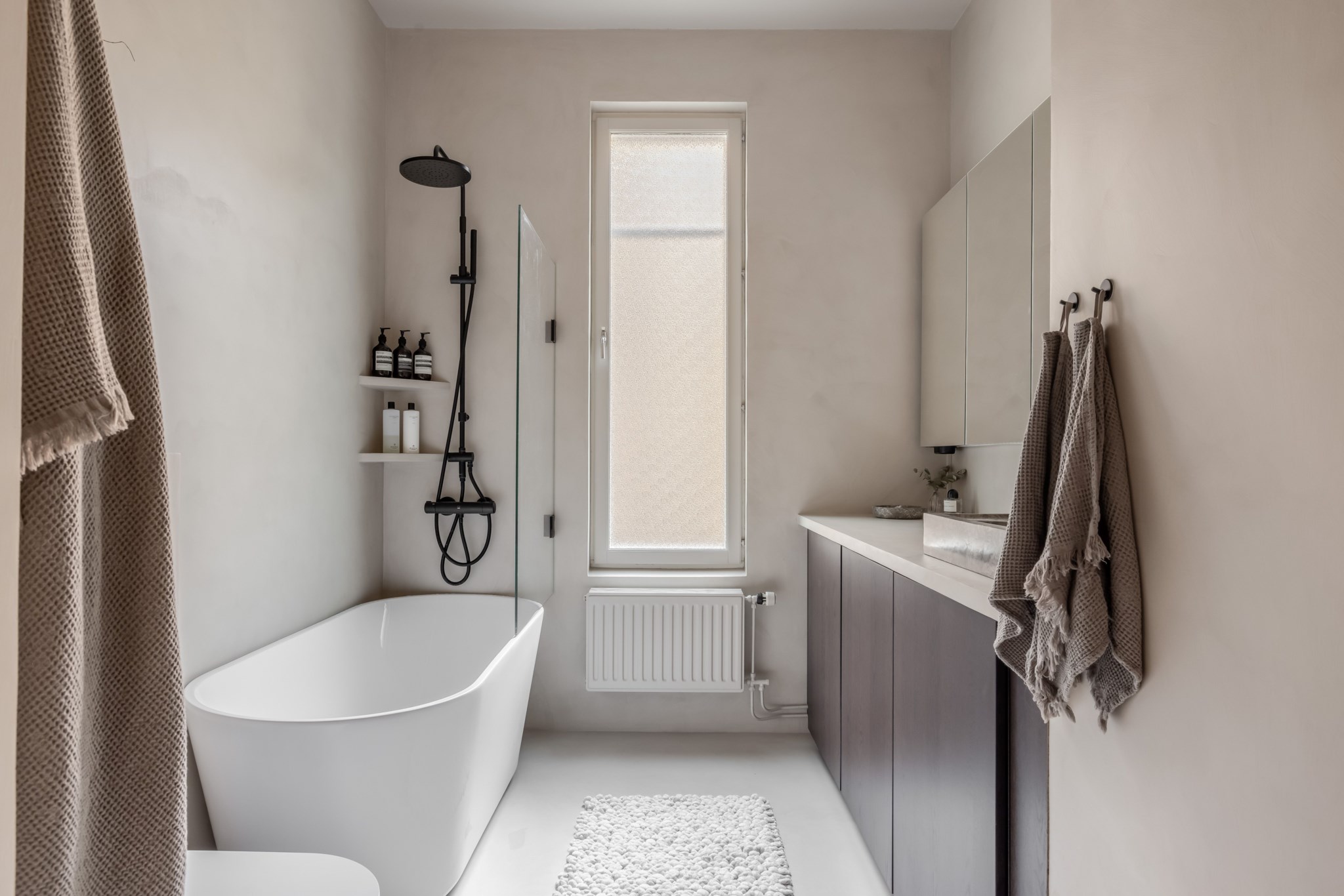 Rymligt badrum med väl utvalda materialval som består av väggar och golv i beige nyans samt underskåp i mörkt trä med ljus bänkskiva ovan. Badrummet är utrustat med WC, badkar med dusch och glasvägg, handfat, kombinerad tvättmaskin/torktumlare samt stort spegelskåp för förvaring. Trevligt ljusinsläpp via fönster.